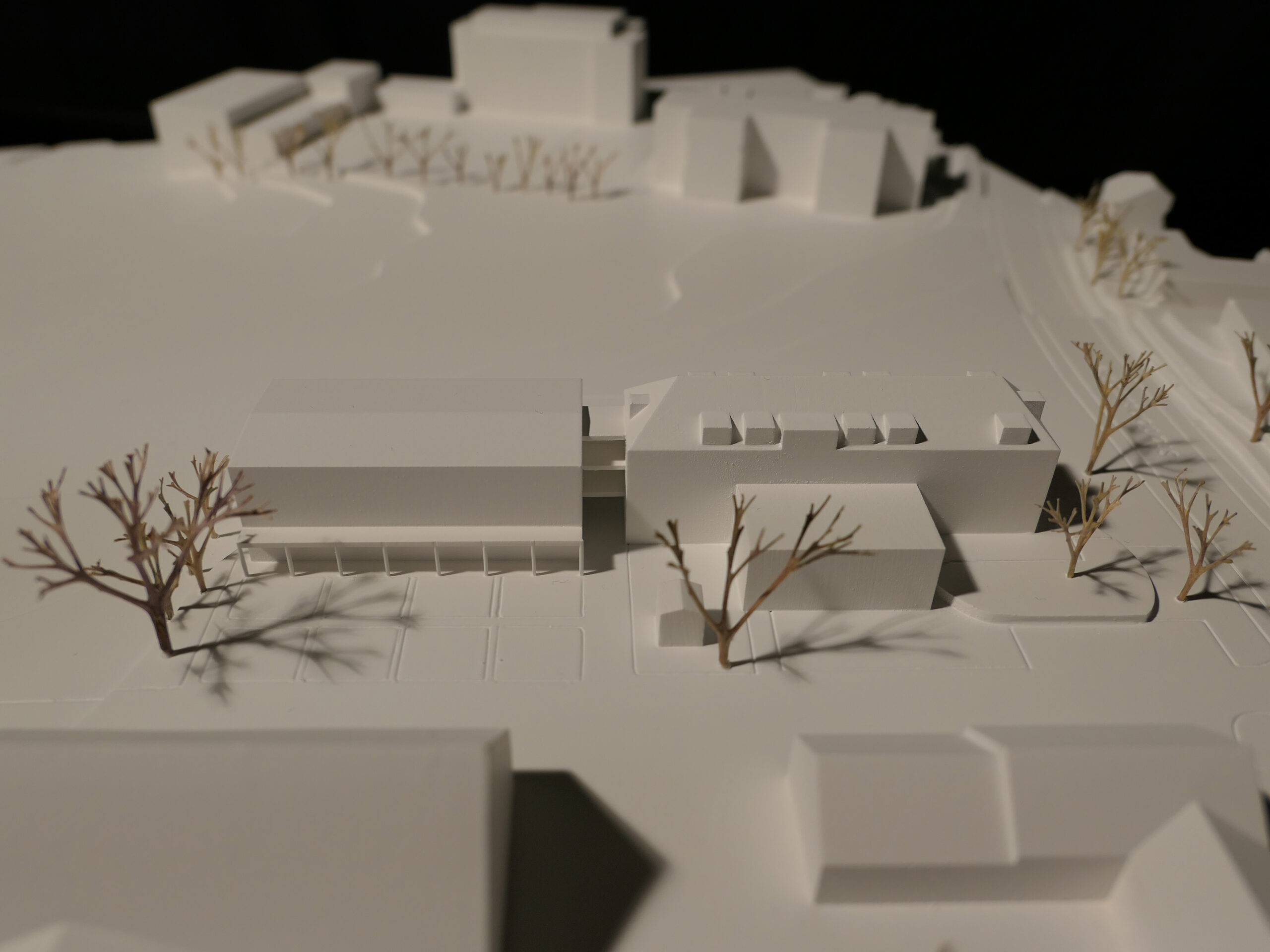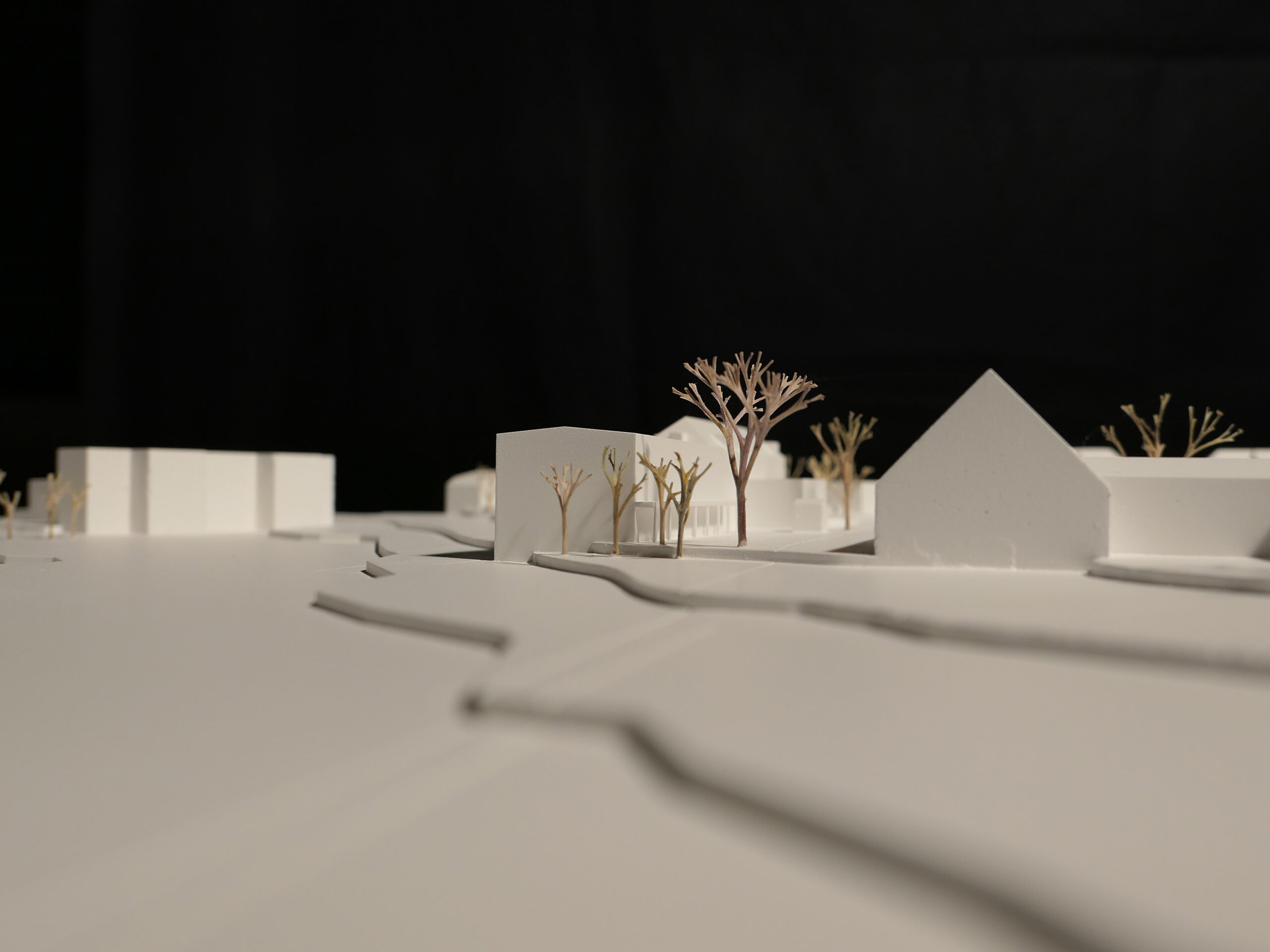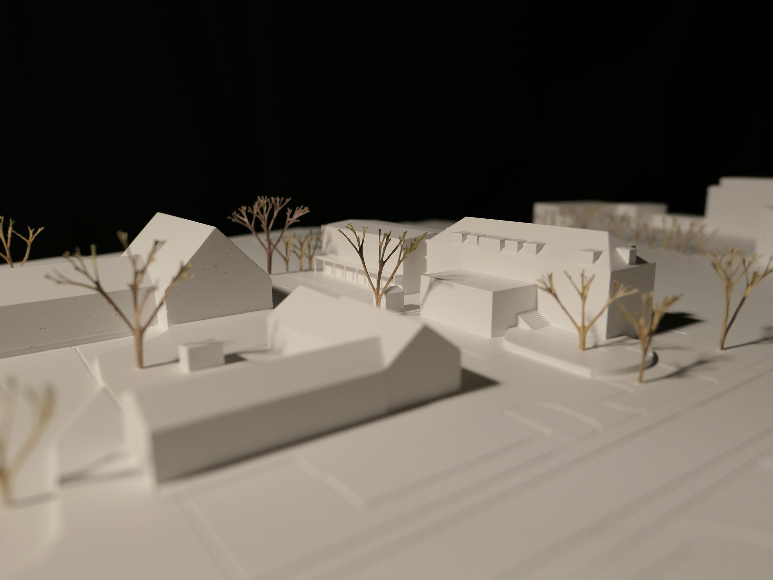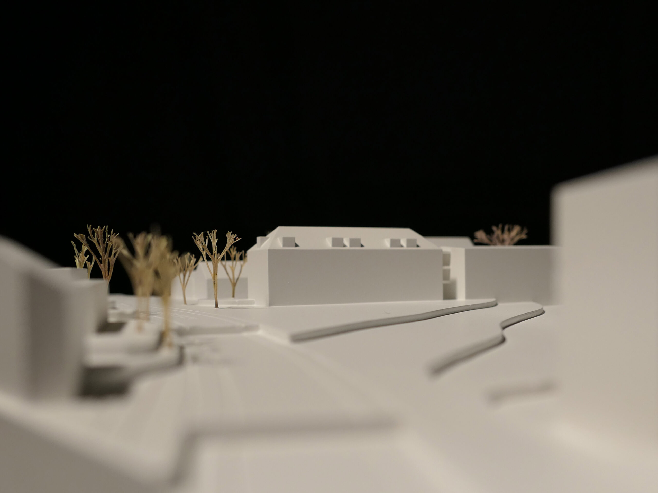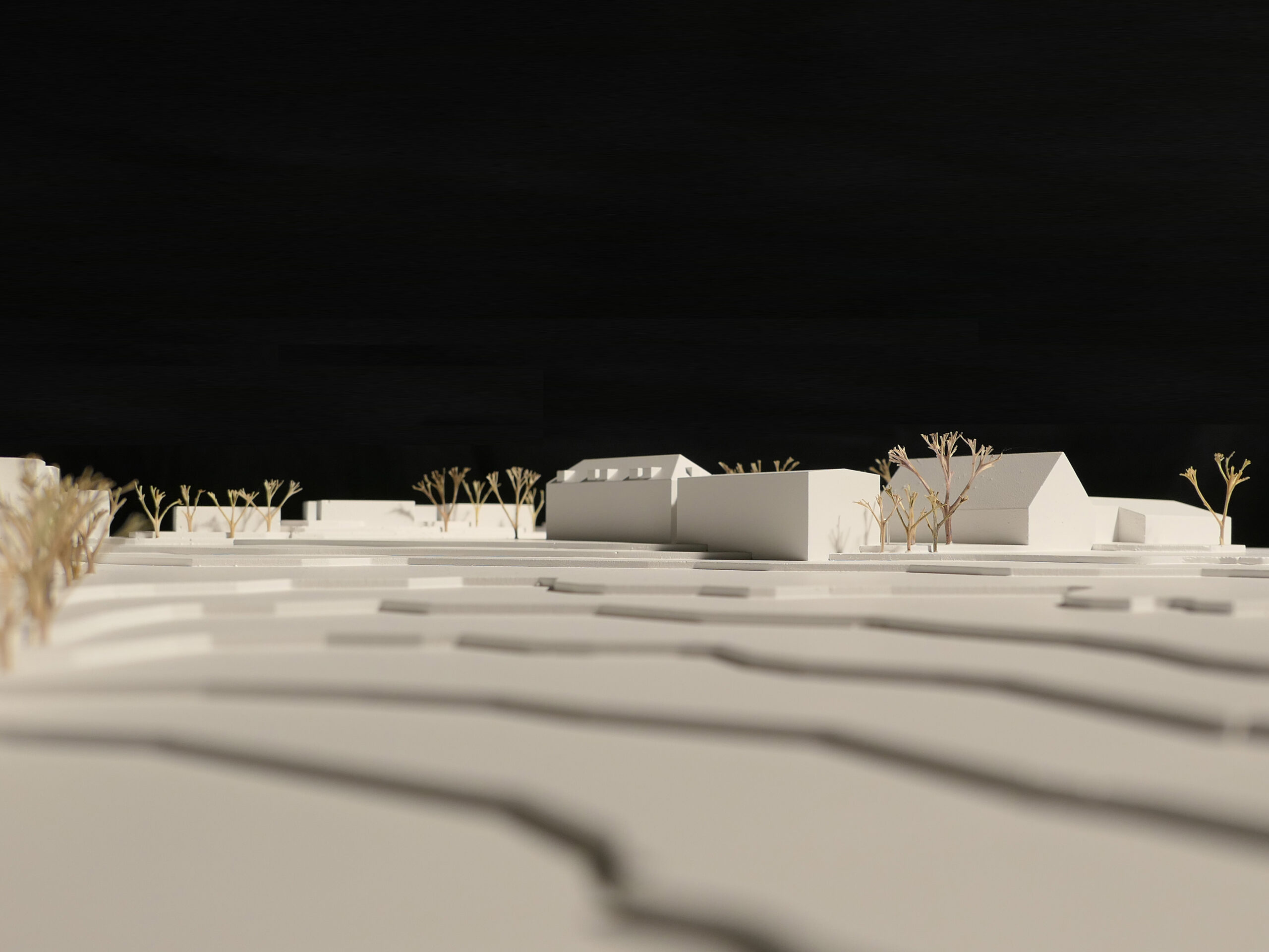 Die über hundertjährige Geschichte des „Haus & Hof“ von Hermolingen zeigt eindrücklich, dass die ursprüngliche Idee, pensionierten landwirtschaftlichen Angestellten ein bäuerlich geprägtes Zuhause zu ermöglichen, nichts an Aktualität eingebüsst hat. Das heutige Ensemble von Hermolingen tritt als ortstypischer, landwirtschaftlicher Betrieb in Erscheinung. Einzig der aus dem Jahre 1938 stammende Massivbau, das eigentliche Wohnhaus, zeugt von einer anderen Nutzung. Das landwirtschaftliche Altersheim wird ähnlich wie in einem bäuerlichen Haushalt geführt. Der Neubau versteht sich als Weiterführung des bestehenden Wohnhauses und wird als Längsrechteck in nördlicher Ausrichtung vom Lärm abgewandt positioniert. Der Neubau komplettiert das Geviert auf eine selbstverständliche Art und bildet ein neues Gegenüber der Scheune. Das bestehende Wohnhaus wird weiterhin als Hauptbau wahrgenommen und prägt das Bild zur Strasse hin. Der neue gedeckte Haupteingang des Altersheims beider Bauten liegt unter dem neuen Verbindungsbau und führt über den Ausssensitzplatz der Cafeteria, dem eigentlichen Herz der Anlage. Flankiert wird diese neue Mitte durch die beiden mächtigsten Bäume auf dem Areal. Das bestehende Wohnhaus soll einer vertretbaren ganzheitlichen Sanierung unterzogen werden, mit dem Hauptziel, die bescheidenen Zimmergrössen in ihrer Grösse in etwa zu verdoppeln. Dem haushälterischen Umgang der Nutzflächen entsprechend, wird für den Neubau einen möglichst geringen Fussabdruck angestrebt. Auf einer einfachen Struktur basierend, mit einer zweiseitigen Orientierung beherbergt der Neubau gut die Hälfte der Zimmer. Eine westseitig durchlaufende Balkonschicht im ersten Obergeschoss belebt die neue Mitte der landwirtschaftlichen Anlage und bietet einen gedeckten Aussenraum für den Speisesaal im Erdgeschoss. Die gewählte simple Struktur, sowie die Lage der Treppenhäuser lassen die Umwandlung in unterschiedlichste Formen von Wohngemeinschaften mit Dienstleistung zu. Der Neubau reiht sich nahtlos in das landwirtschaftliche Ensemble von Hermolingen ein und vereint konstruktive und typologische Elemente der Nachbarsbauten, der Scheune und dem Hofladen mit Schopf. Zurückhaltend und elegant zeigen sich die durch die Struktur und durch die Gebäudeform prägenden Fassaden. Hinterlüftende, unbehandelte, sägerohe Fichtenbretter schmücken den Bau. Die Schalung des Erdgeschosses unterscheidet sich bezüglich der Proportion gegenüber den oberliegenden Geschossen, in Anlehnung an ein Sockelgeschoss. Der Neubau wird aufgrund von wirtschaftlichen Überlegungen als Hybridbau vorgeschlagen. Während Betondecken, Treppenkern mit Lift und die beiden tragenden Wände des Korridors als Massivbau geplant sind, werden die Aussenwände als vorgefertigte Holzkonstruktion mit integrierten Stahlstützen vorgesehen. Der Entwurf ist darauf bedacht, qualitative und einfache Räume zu schaffen, welche sämtliche für die Wirtschaftlichkeit bestimmenden Faktoren berücksichtigen.