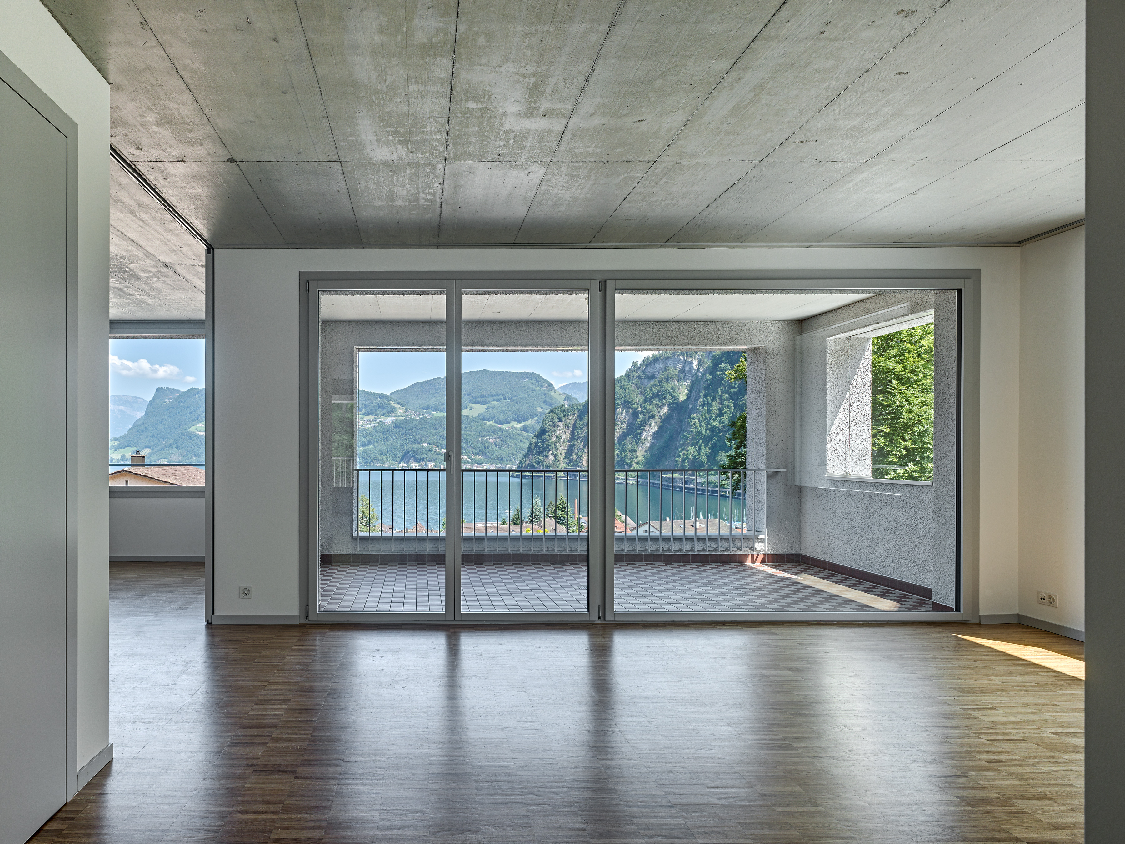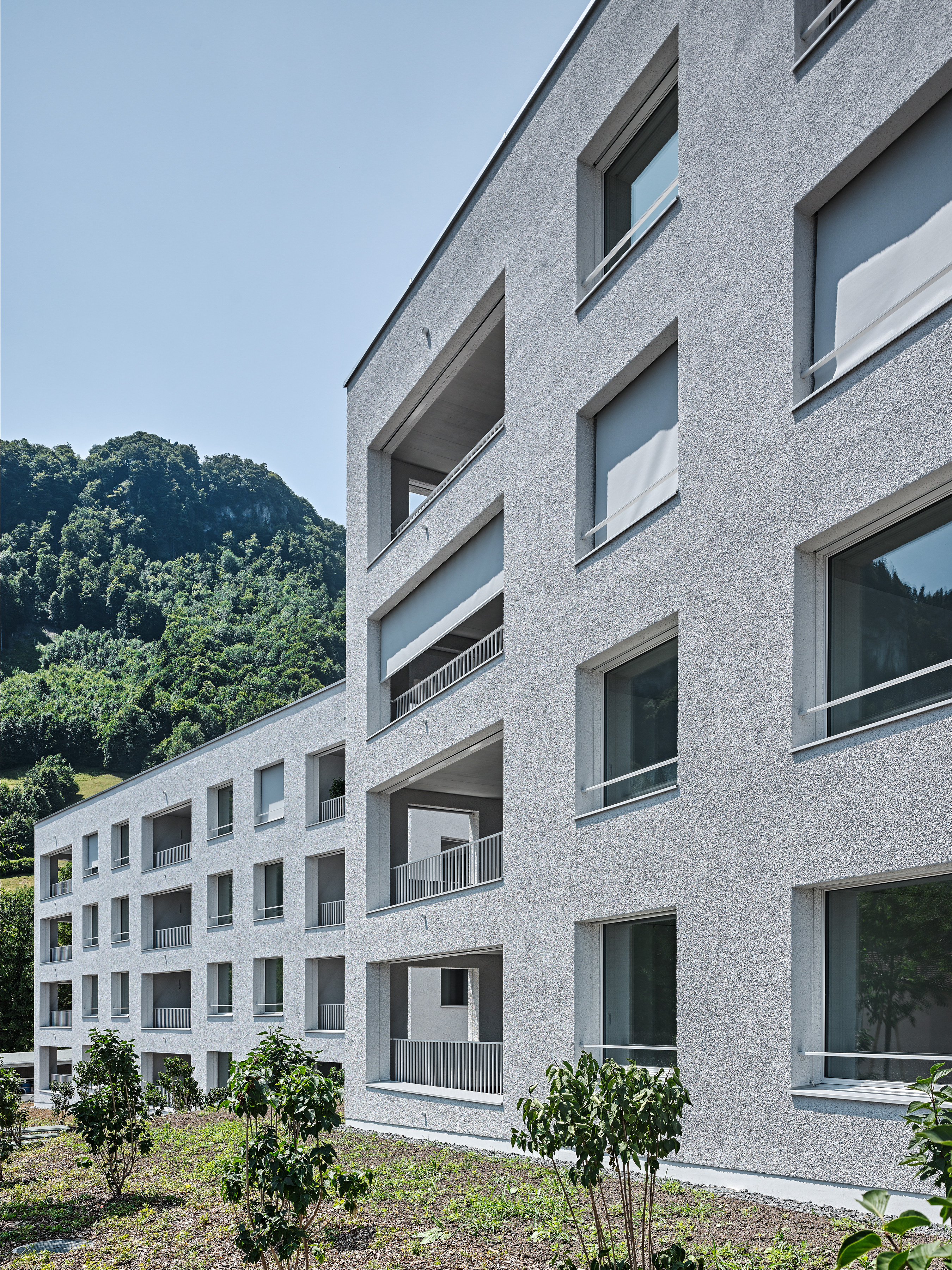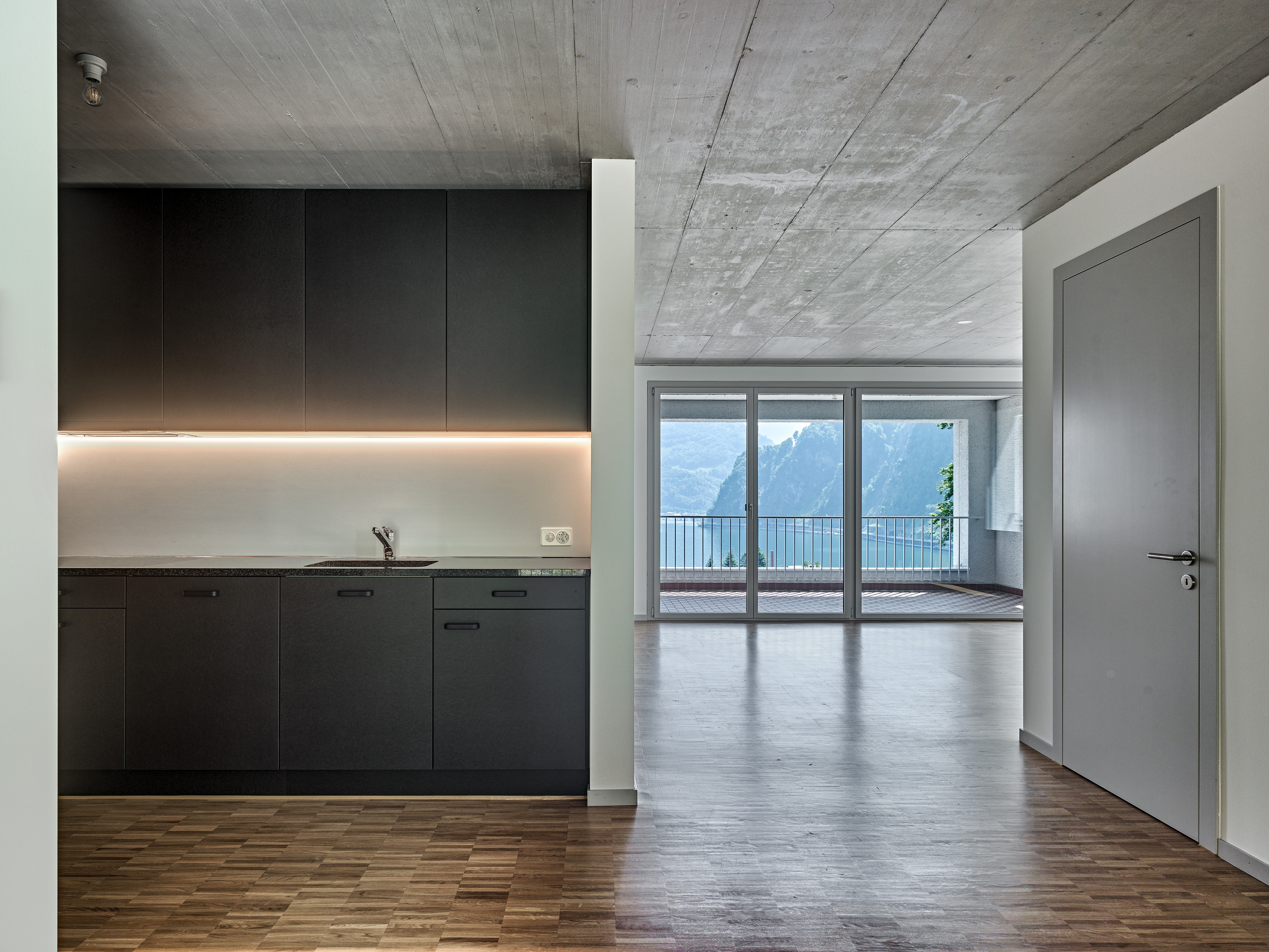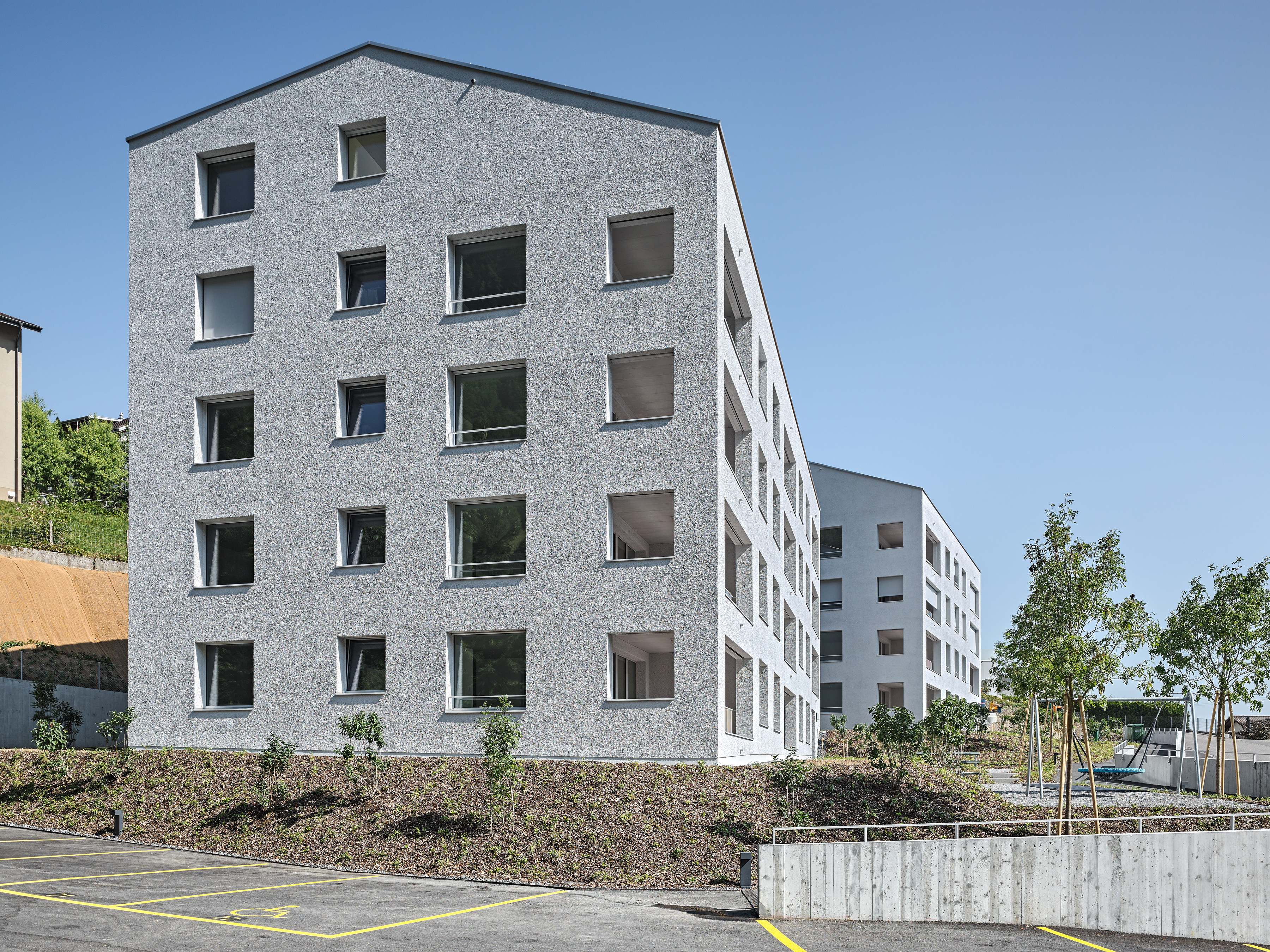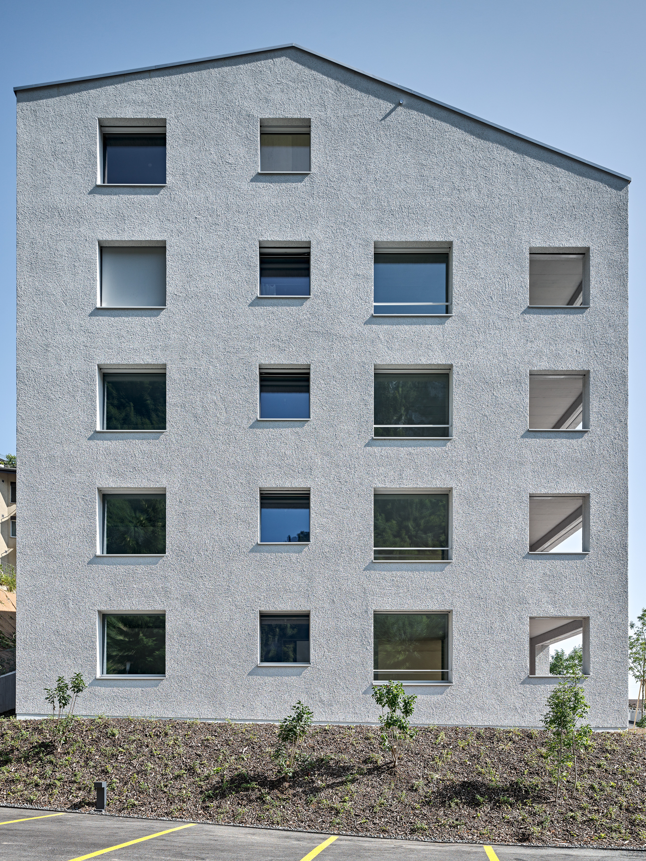 Der Entwurf der genossenschaftlichen Wohnbauten am Mülibach in Hergiswil, auf dem Grundstück des ehemalige Schützenhauses, begegnet der Aufgabenstellung mit zwei unterschiedlich grossen, formal und organisatorisch einfachen Häusern. Der umliegenden Bebauungsstruktur entsprechend, reagiert die Stellung der Bauten auf die Geometrie des Strassenraumes und auf die charakteristische Topografie des Areals. Die Hauptfassaden der relativ schmalen Häuser sind unmissverständlich zum Vierwaldstättersee hin orientiert. Einseitig abfallende Satteldächer lassen die Häuser hangseitig niedrig erscheinen und fügen sich vorteilhaft in die Dachlandschaft der Umgebung ein. Eine polygonal geformte Ortbetonmauer entlang der Renggstrasse vermag eine adäquate Trennung zwischen privater Gebäudevorzone und Strasse zu bilden und erschliesst die Häuser mit einer zentralen Aussenreppe und einer der Mauer entlang führenden Rampe. Hangseitig und gegenüber dem Mülibach ermöglicht eine schützende Stützmauer eine einfache Parkierung sowie einen den Bauten angemessenen Grünraum im rückwärtigen Bereich. Die Wohnungen sind geprägt von der wunderbaren Fernsicht auf See und Berge und einer zweiseitigen Offenheit als Reaktion auf die spezifische Belichtungssituation. Eine klare, auf dem Wesen der Nutzung basierende Gestaltung der Häuser lässt diese unspektakulär in Erscheinung treten und erinnert akkurat an die qualitativen Baumeisterhäuer der Umgebung.