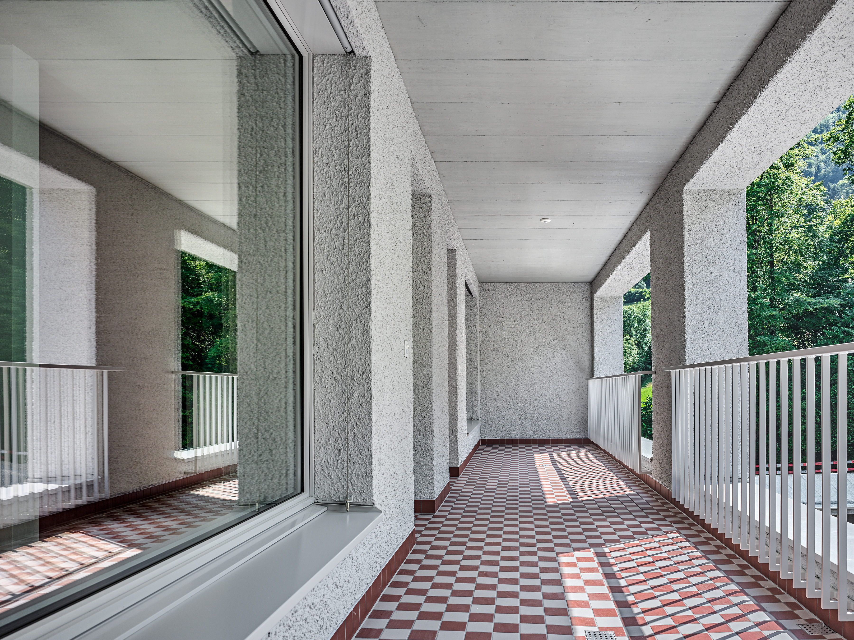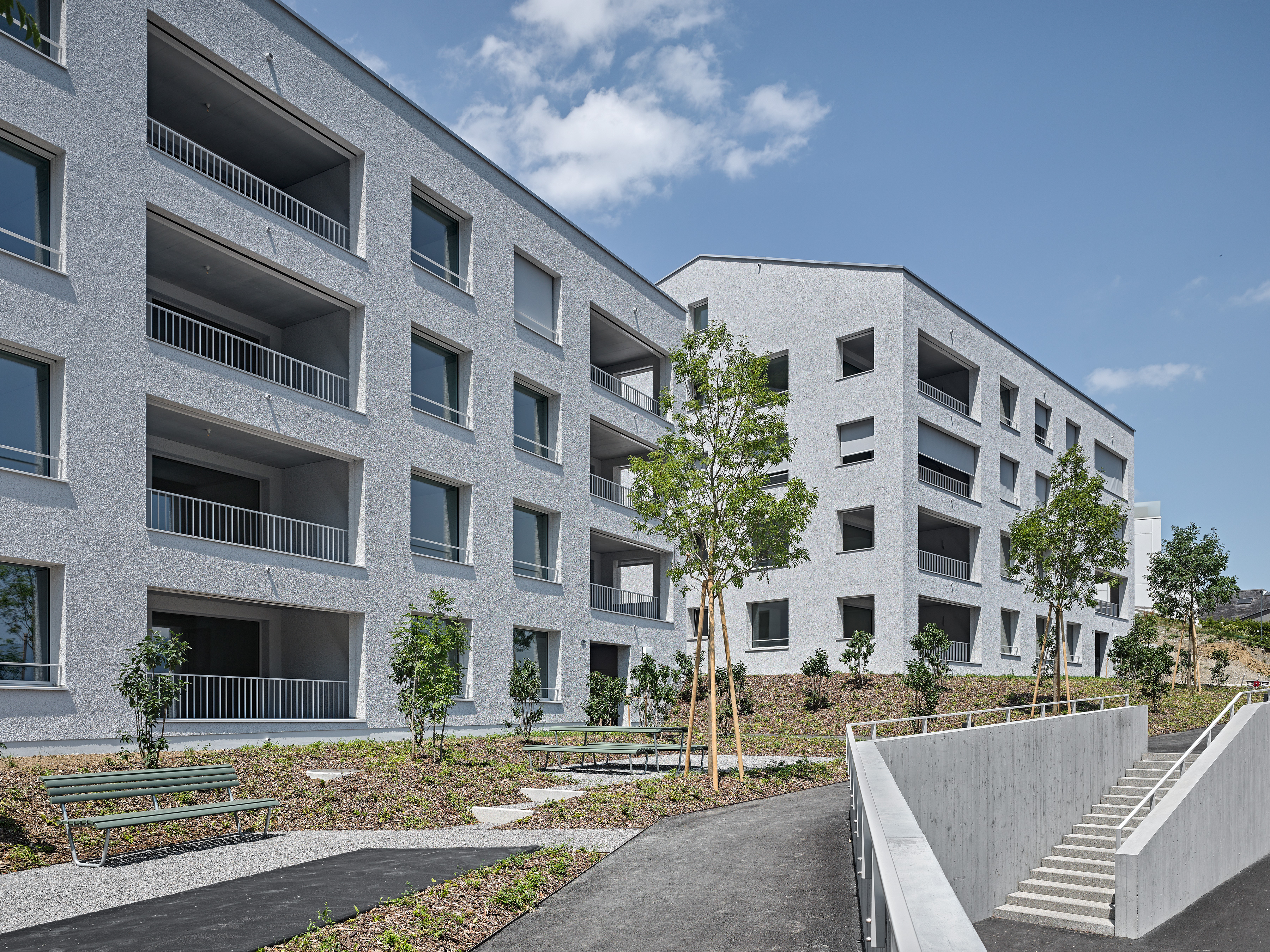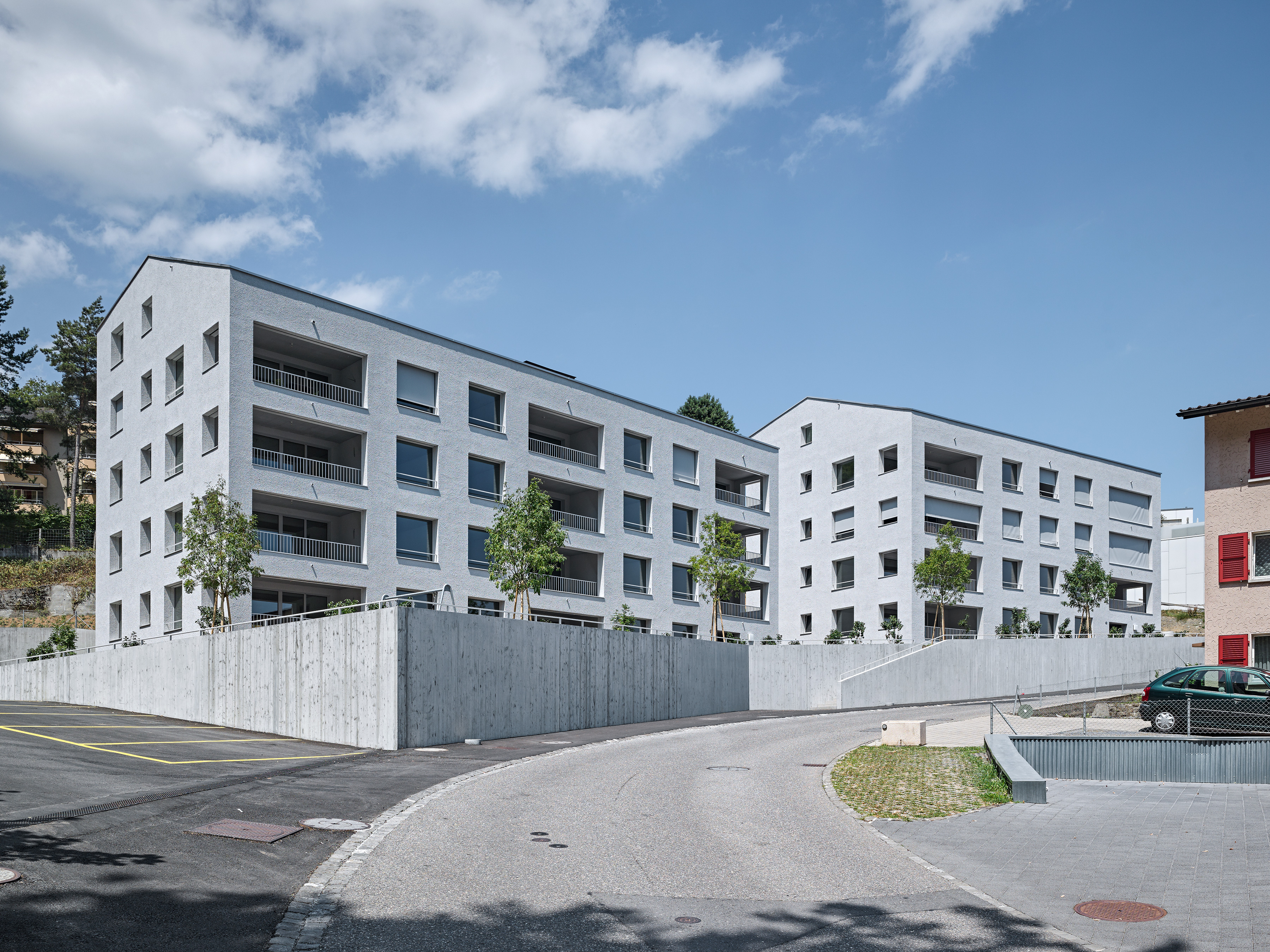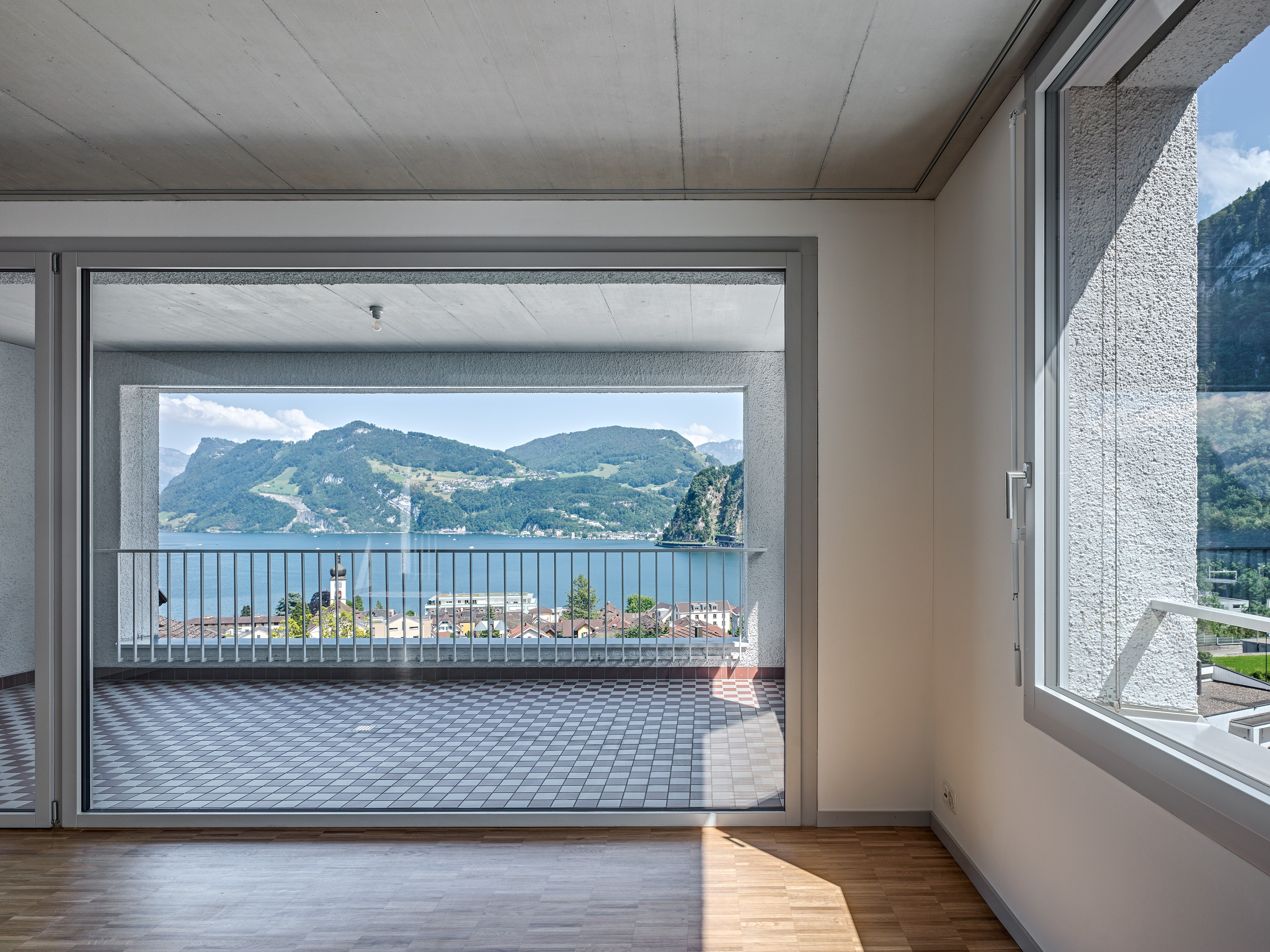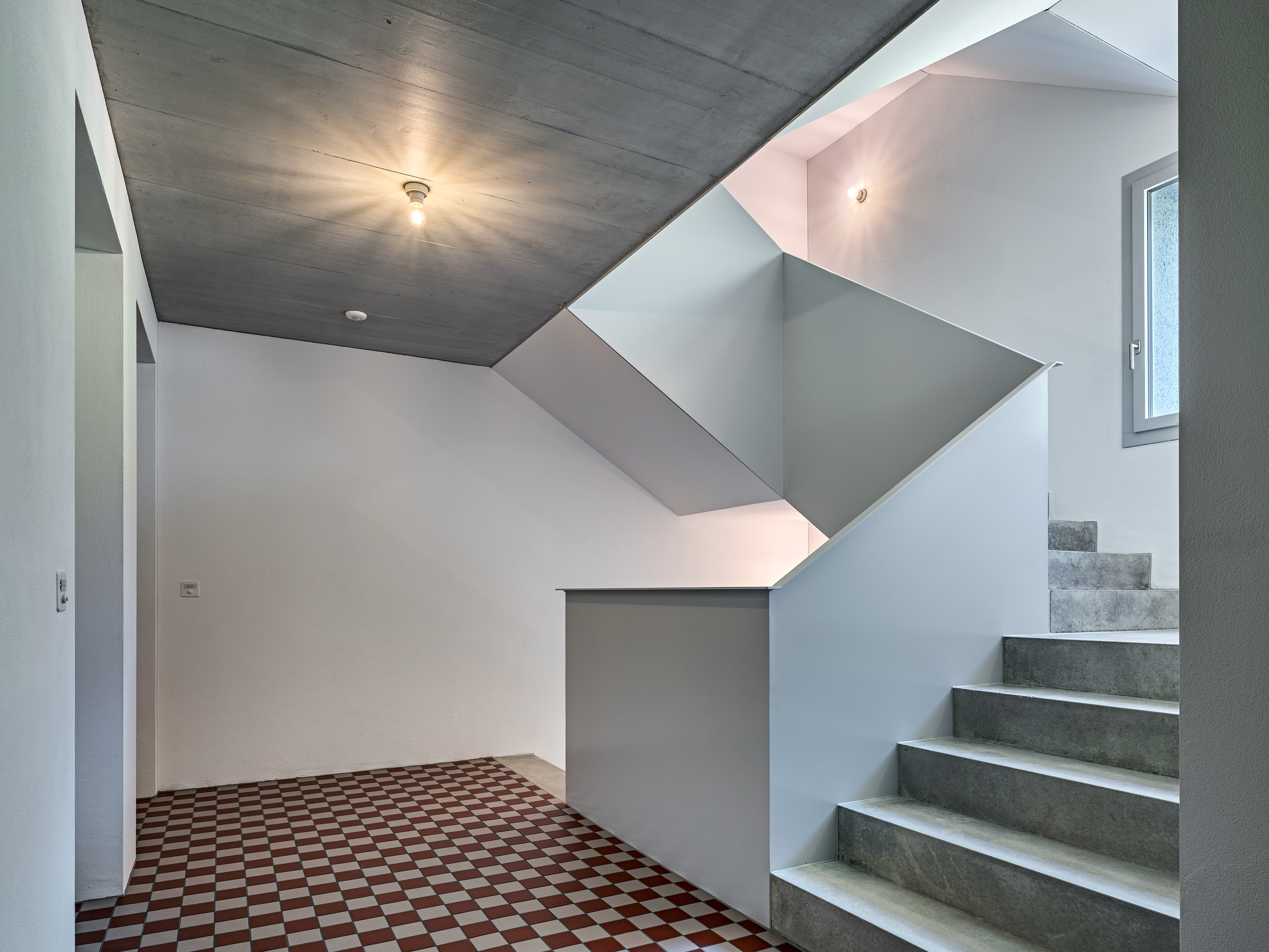 Der Entwurf der genossenschaftlichen Wohnbauten am Mülibach in Hergiswil, auf dem Grundstück des ehemalige Schützenhauses, begegnet der Aufgabenstellung mit zwei unterschiedlich grossen, formal und organisatorisch einfachen Häusern. Der umliegenden Bebauungsstruktur entsprechend, reagiert die Stellung der Bauten auf die Geometrie des Strassenraumes und auf die charakteristische Topografie des Areals. Die Hauptfassaden der relativ schmalen Häuser sind unmissverständlich zum Vierwaldstättersee hin orientiert. Einseitig abfallende Satteldächer lassen die Häuser hangseitig niedrig erscheinen und fügen sich vorteilhaft in die Dachlandschaft der Umgebung ein. Eine polygonal geformte Ortbetonmauer entlang der Renggstrasse vermag eine adäquate Trennung zwischen privater Gebäudevorzone und Strasse zu bilden und erschliesst die Häuser mit einer zentralen Aussenreppe und einer der Mauer entlang führenden Rampe. Hangseitig und gegenüber dem Mülibach ermöglicht eine schützende Stützmauer eine einfache Parkierung sowie einen den Bauten angemessenen Grünraum im rückwärtigen Bereich. Die Wohnungen sind geprägt von der wunderbaren Fernsicht auf See und Berge und einer zweiseitigen Offenheit als Reaktion auf die spezifische Belichtungssituation. Eine klare, auf dem Wesen der Nutzung basierende Gestaltung der Häuser lässt diese unspektakulär in Erscheinung treten und erinnert akkurat an die qualitativen Baumeisterhäuer der Umgebung.