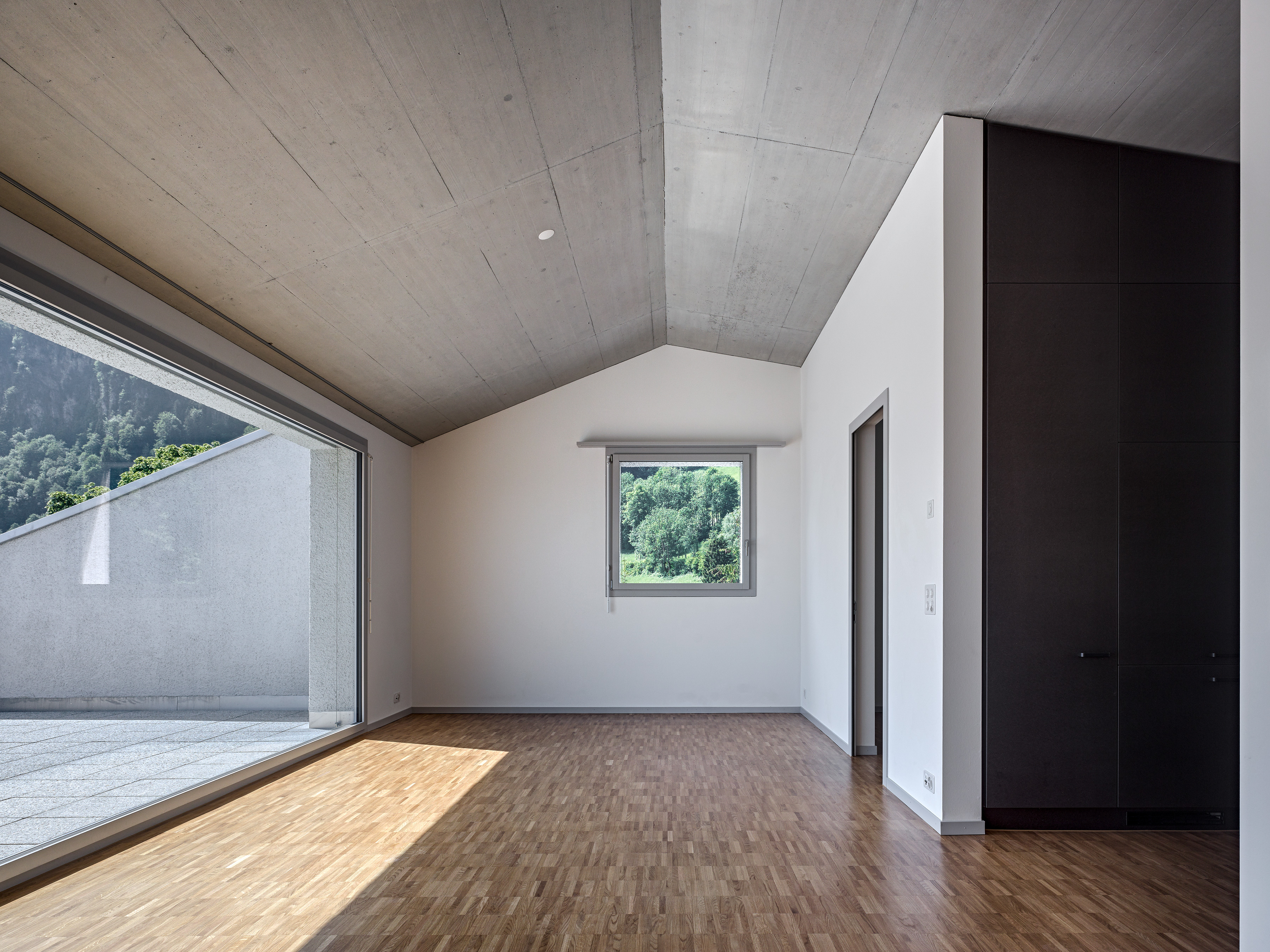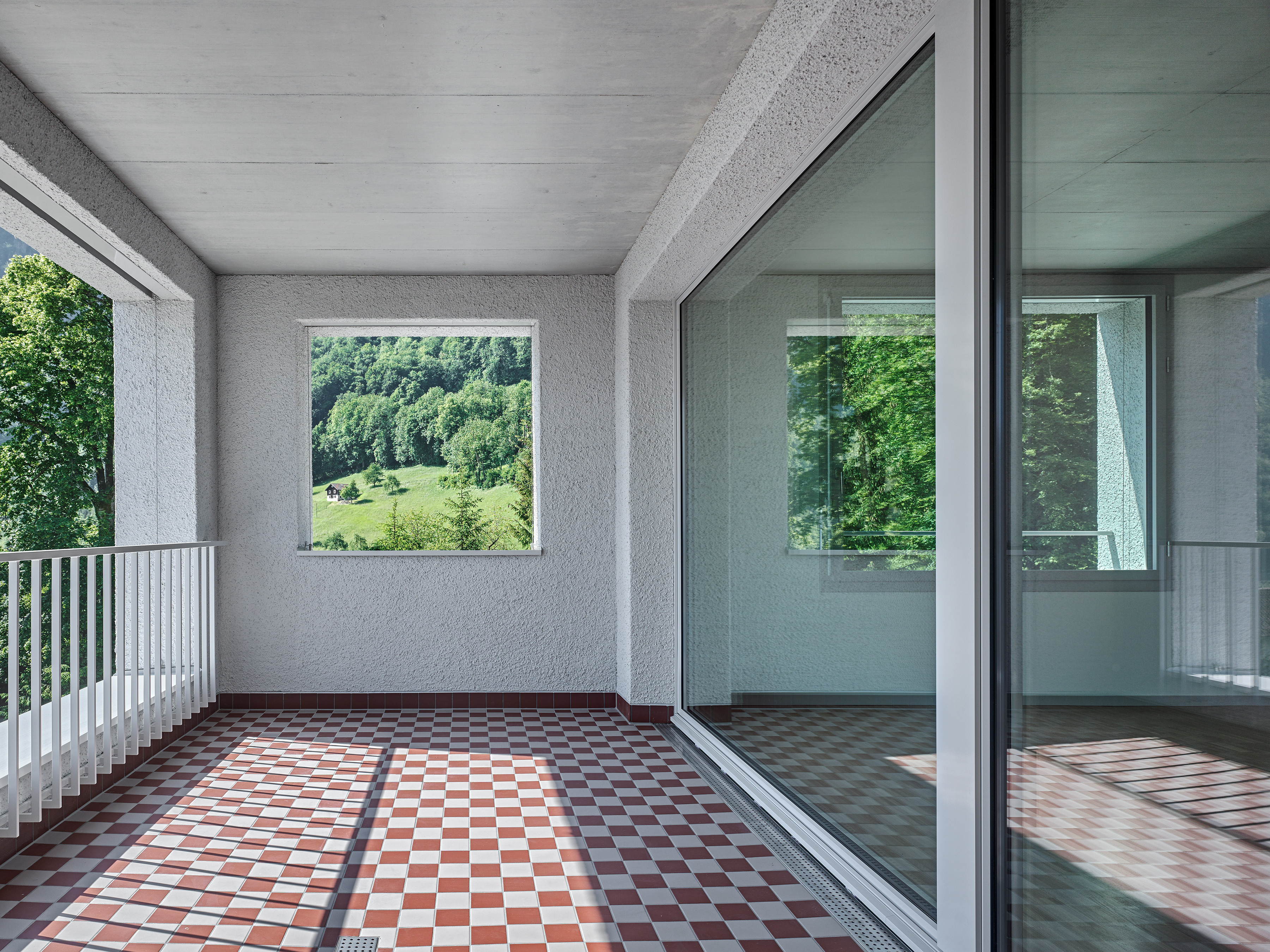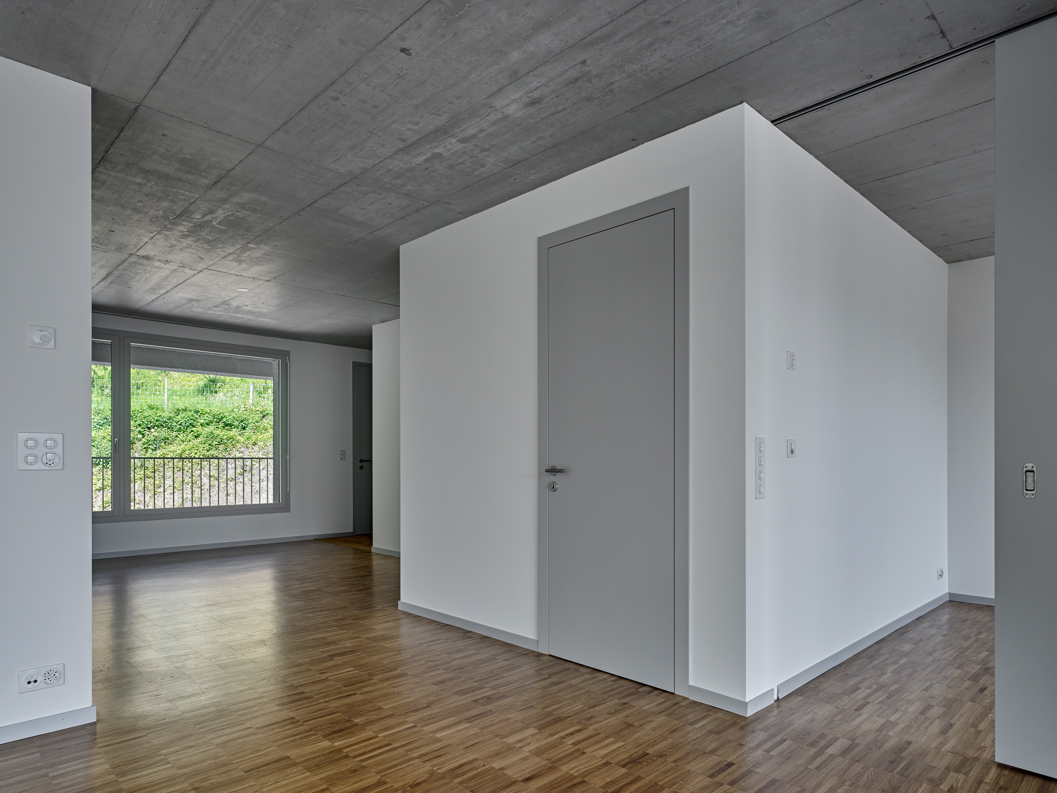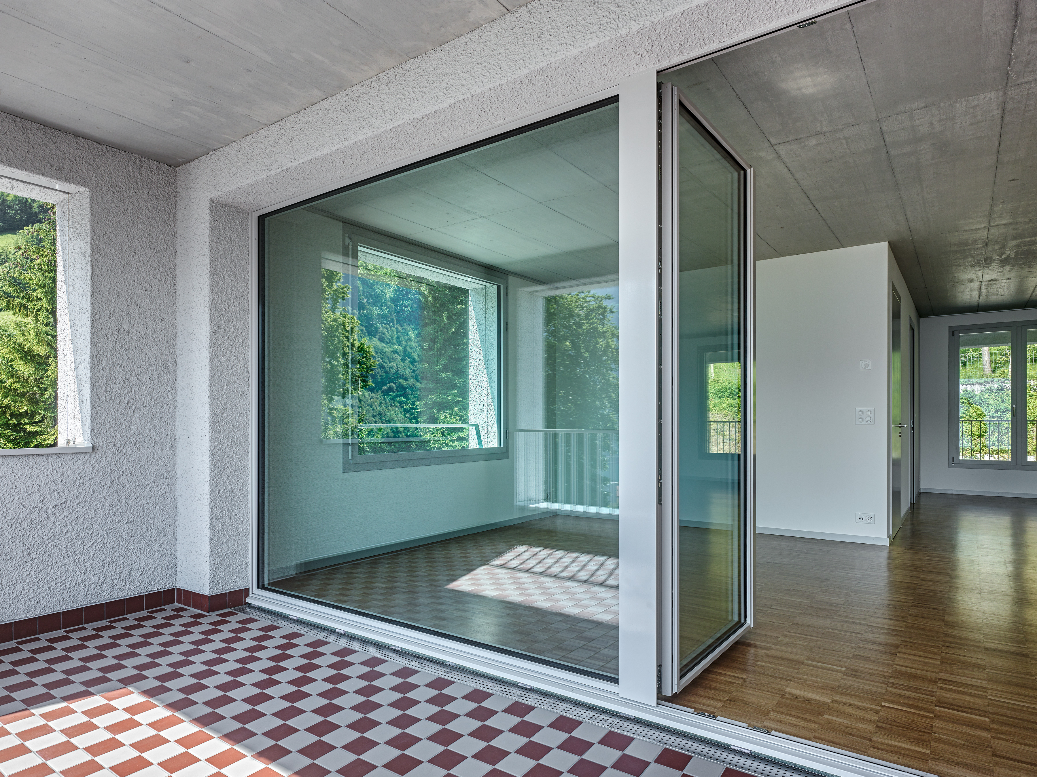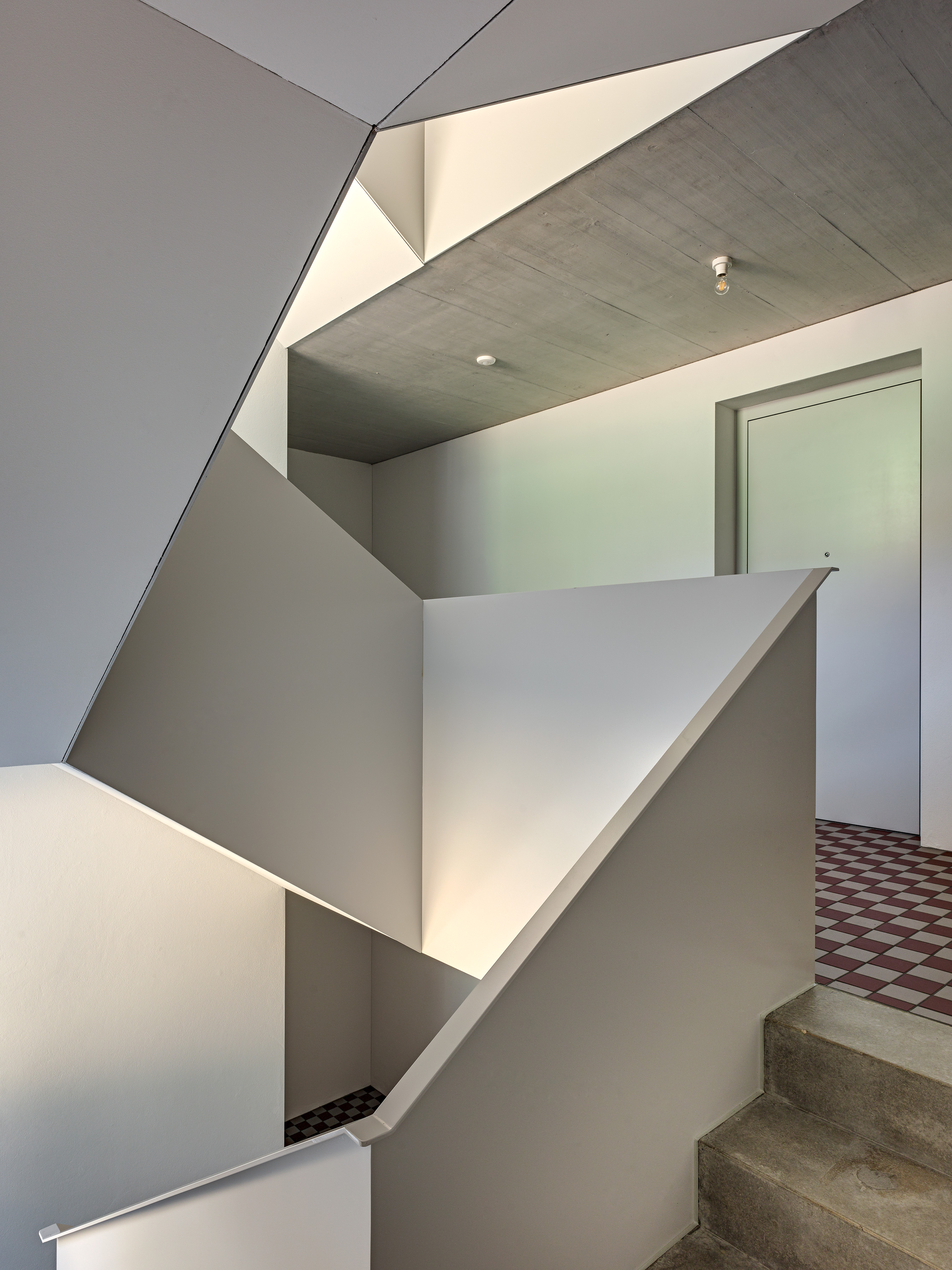 Der Entwurf der genossenschaftlichen Wohnbauten am Mülibach in Hergiswil, auf dem Grundstück des ehemalige Schützenhauses, begegnet der Aufgabenstellung mit zwei unterschiedlich grossen, formal und organisatorisch einfachen Häusern. Der umliegenden Bebauungsstruktur entsprechend, reagiert die Stellung der Bauten auf die Geometrie des Strassenraumes und auf die charakteristische Topografie des Areals. Die Hauptfassaden der relativ schmalen Häuser sind unmissverständlich zum Vierwaldstättersee hin orientiert. Einseitig abfallende Satteldächer lassen die Häuser hangseitig niedrig erscheinen und fügen sich vorteilhaft in die Dachlandschaft der Umgebung ein. Eine polygonal geformte Ortbetonmauer entlang der Renggstrasse vermag eine adäquate Trennung zwischen privater Gebäudevorzone und Strasse zu bilden und erschliesst die Häuser mit einer zentralen Aussenreppe und einer der Mauer entlang führenden Rampe. Hangseitig und gegenüber dem Mülibach ermöglicht eine schützende Stützmauer eine einfache Parkierung sowie einen den Bauten angemessenen Grünraum im rückwärtigen Bereich. Die Wohnungen sind geprägt von der wunderbaren Fernsicht auf See und Berge und einer zweiseitigen Offenheit als Reaktion auf die spezifische Belichtungssituation. Eine klare, auf dem Wesen der Nutzung basierende Gestaltung der Häuser lässt diese unspektakulär in Erscheinung treten und erinnert akkurat an die qualitativen Baumeisterhäuer der Umgebung.