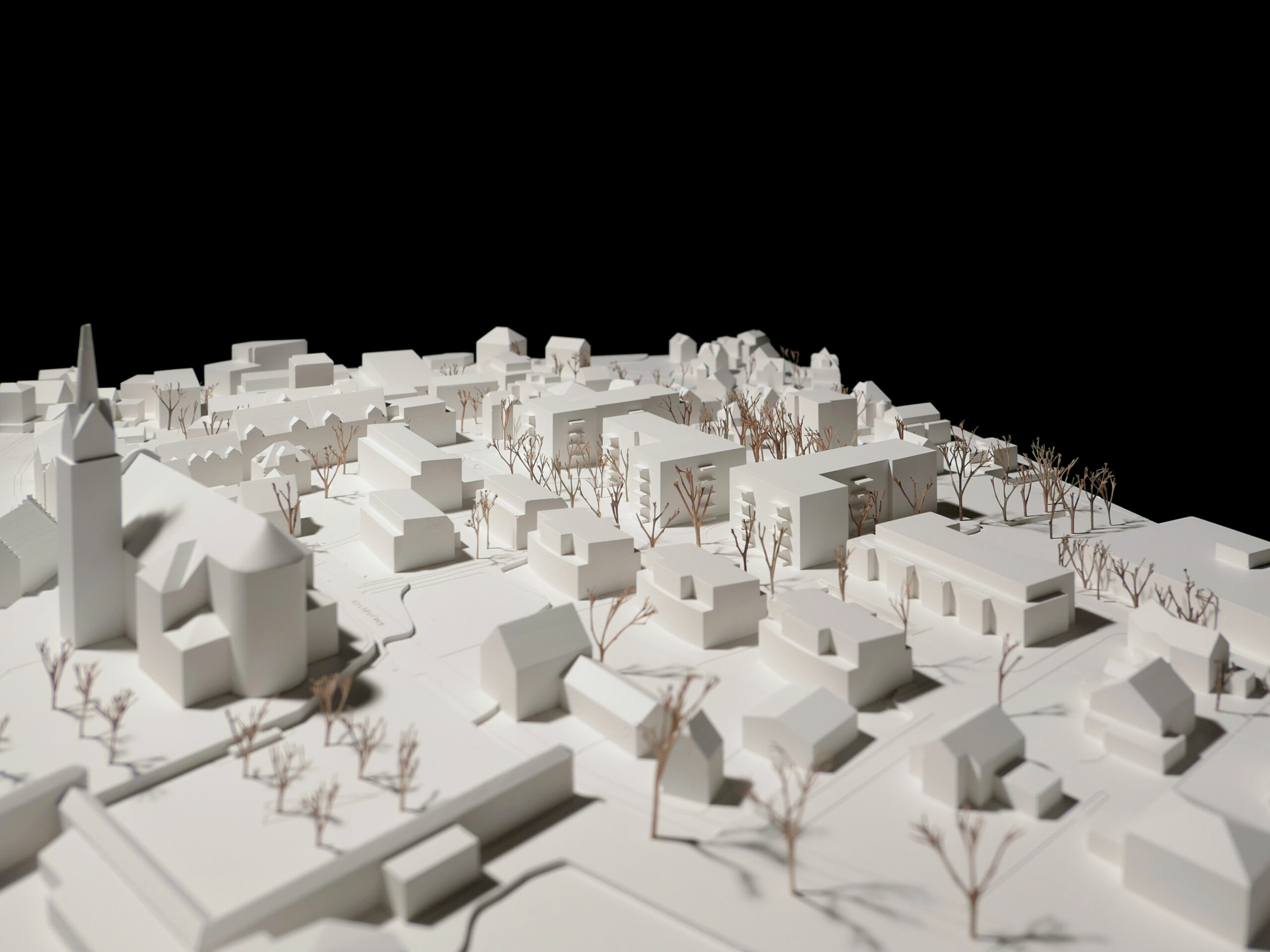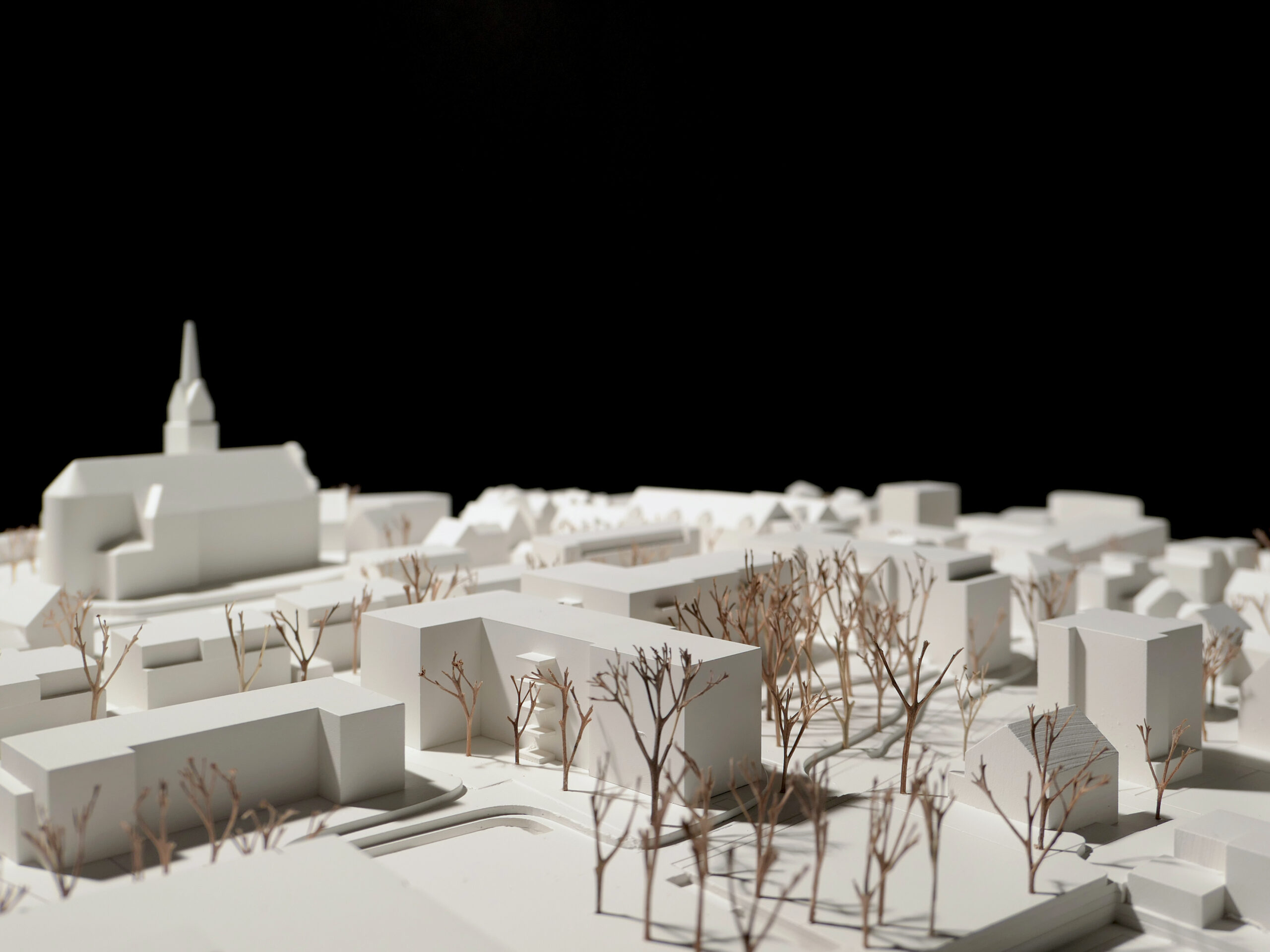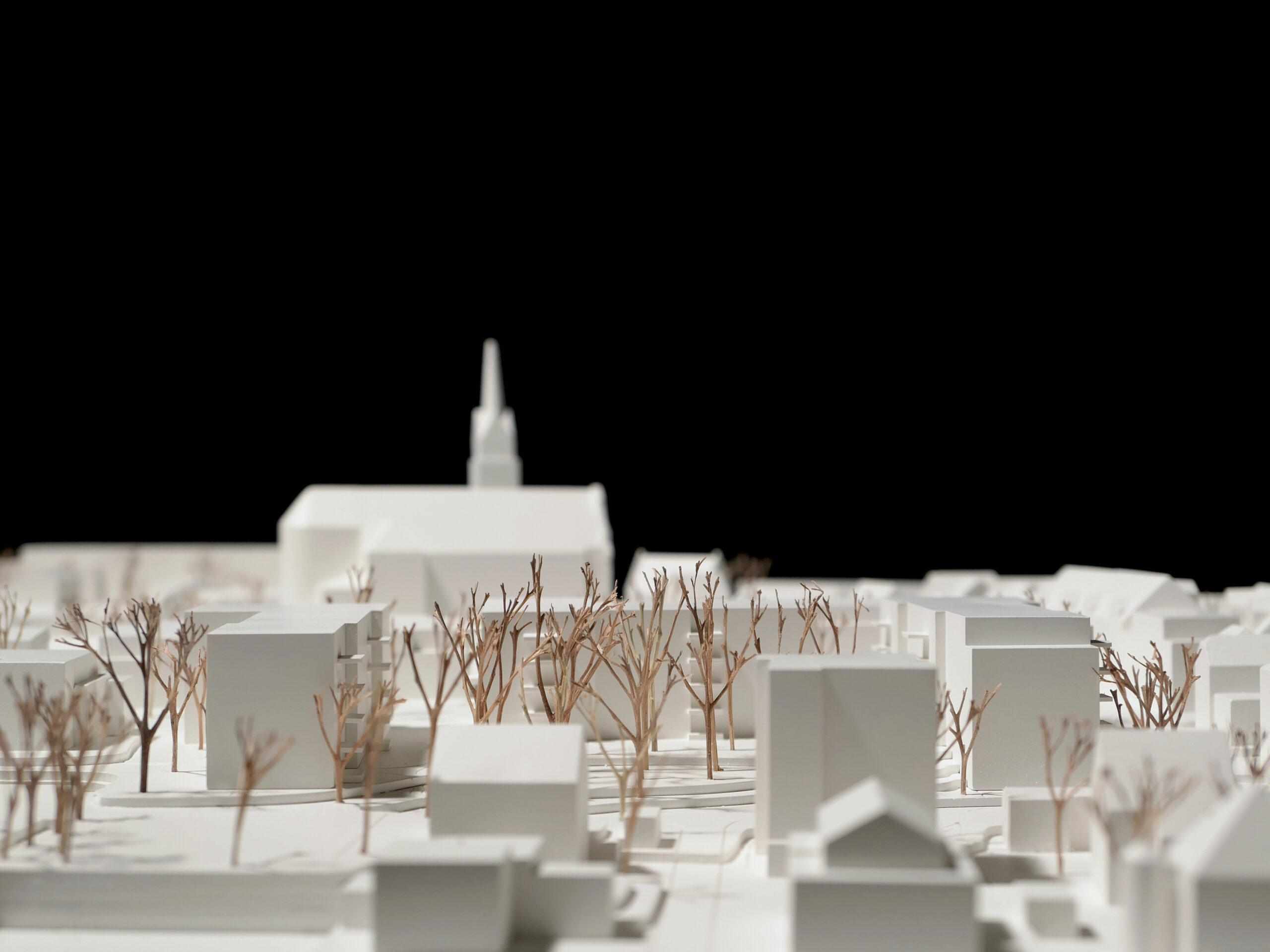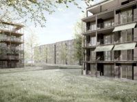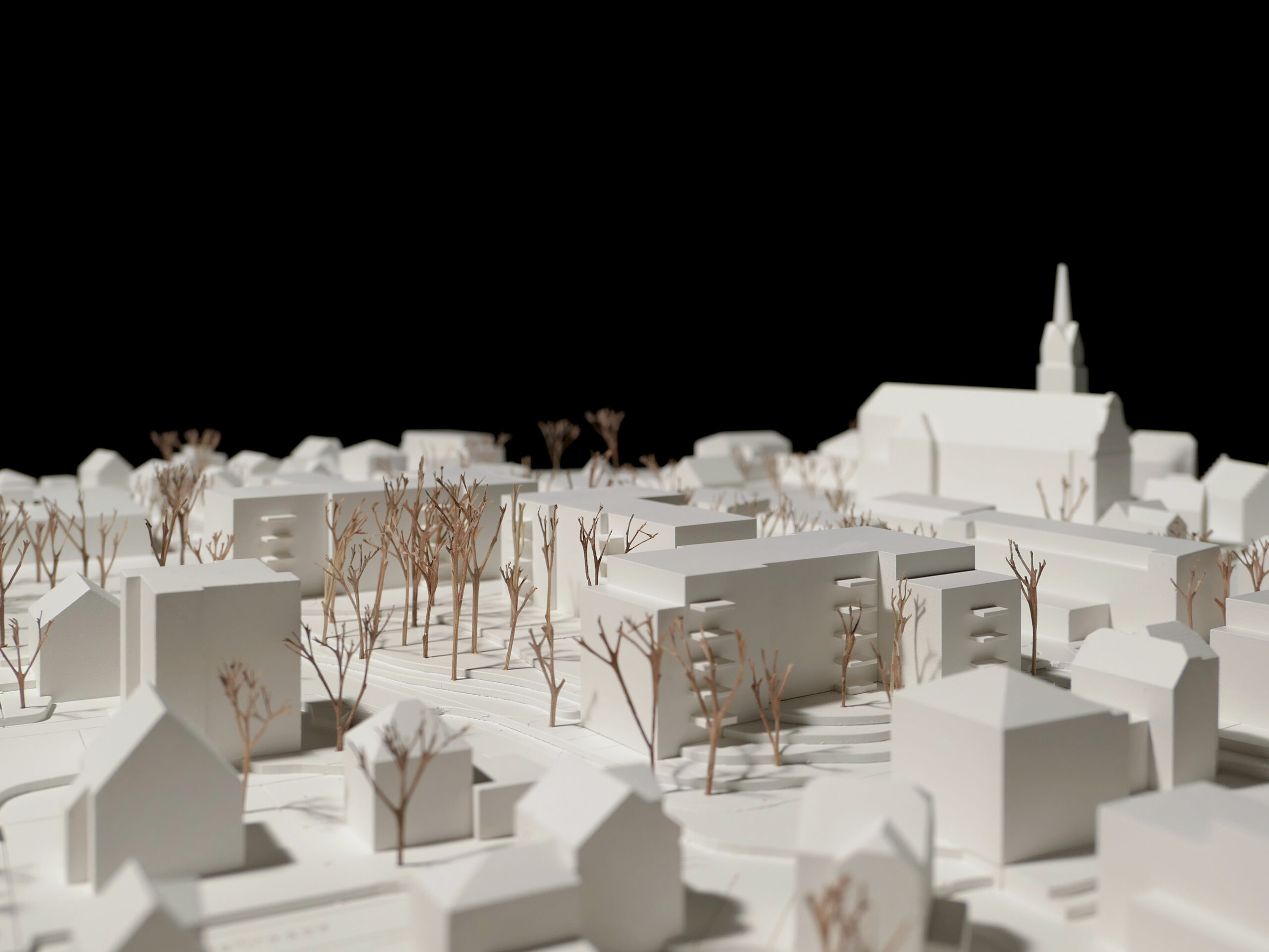 Das Seetal, geprägt durch die beiden Seen Hallwilersee im Norden und Baldeggersee im Süden, erstreckt sich in Nord-Süd-Richtung zwischen Emmenbrücke und dem aargauischen Lenzburg. Am südlichen Ende des Baldeggersees liegt die Gemeinde Hochdorf als regionales Zentrum des Seetals. Die Gewerbenutzungen in der Verbindungachse Richtung Norden sowie die Brauerei zeigen den bereits frühen Anspruch von Hochdorf als regionales Zentrum. Das Areal B2 befindet sich im Dorfzentrum von Hochdorf, angrenzend an die imposante Pfarrkirche Kirche St. Martin. Die städtebauliche Setzung ermöglicht den räumlichen Bezug zwischen dem Kirchenareal und dem sich gegen Norden ausdehnenden Wohnquartier. Die neue Überbauung bildet zusammen mit den bestehenden Wohnbauten den qualitativen Auftakt der Quartierstrasse Kirchweid. Die volumetrischen Versätze der drei Gebäude orientieren sich in ihrer Körnung und Proportion an den benachbarten Wohnbauten und ermöglichen dadurch eine qualitative ortsbauliche Integration. Drei kompakte Neubauten definieren zusammen mit dem Freiraum einen Ort, welcher sich optimal in das Wohnquartier nahe dem Ortskern einfügt. Die Wohntypologie schafft die Basis für ein vielfältiges Wohnungsangebot für verschiedene Zielgruppen. Mit Ausnahme der Kopfbauten weisen alle Wohnungen einen direkten Sichtbezug zum Baumhain auf und setzen diesen in das Zentrum. Die Küchen, mit direktem Zugang zum Balkon, befinden sich an den Fassaden und bilden die räumliche Erweiterung des Wohn- und Essraumes. Diese Disposition führt zu einem deutlich grösseren Sichtbezug in Richtung Osten und Westen. Der bestehende Baumhain bildet das atmosphärische und räumliche Zentrum der Freiräume und wird als Element wesentlich ausgedehnt. Das entscheidende Merkmal der äusseren Erscheinung bildet die elegante Formensprache der Bauten, die vertikale Gliederung und die filigrane Tektonik der eingesetzten Materialien und Oberflächen. Ein Kalksandsteinmauerwerk und naturfarbene Betonelemente bilden die mineralischen Grundmaterialien der Aussenhülle. Ein Schlämmputz aus Zement und Kalkhydrat verleiht dem Mauerwerk seine eigene und unverwechselbare Optik. Fensterbrüstungen und ein Dachrand aus grünem Blech, gelbliche, textile Storen und die in Rot gehaltenen Metallelemente der Fenster, Geländer und Türen ergänzen die Grundmaterialien Stein und Beton und verleihen den Bauten einen zeitlosen Charme, der sich gut in die gebaute und natürliche Umgebung zu integrieren vermag und dessen zurückhaltende Farbigkeit sich im Baumhain widerspiegelt.
