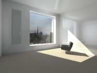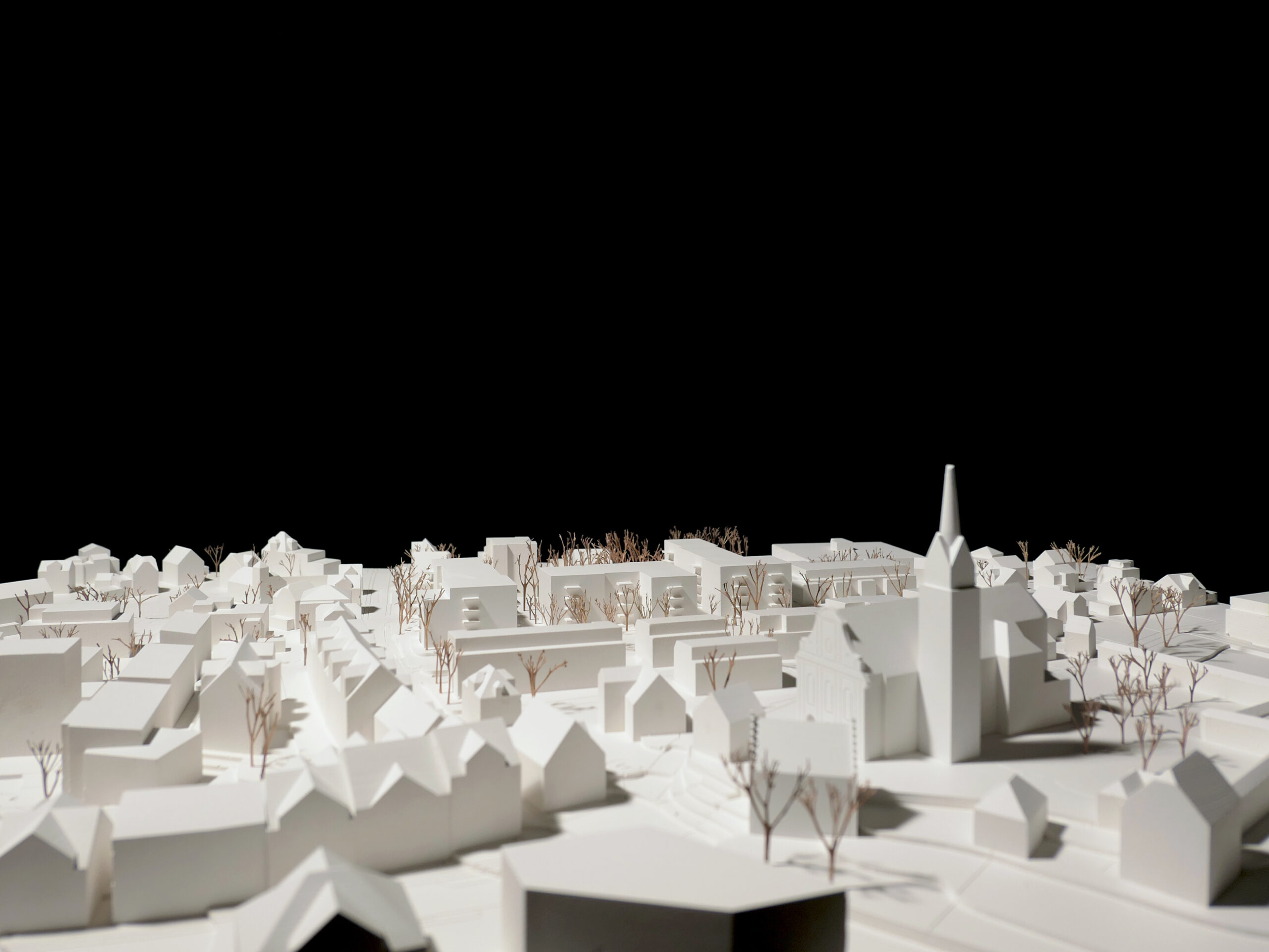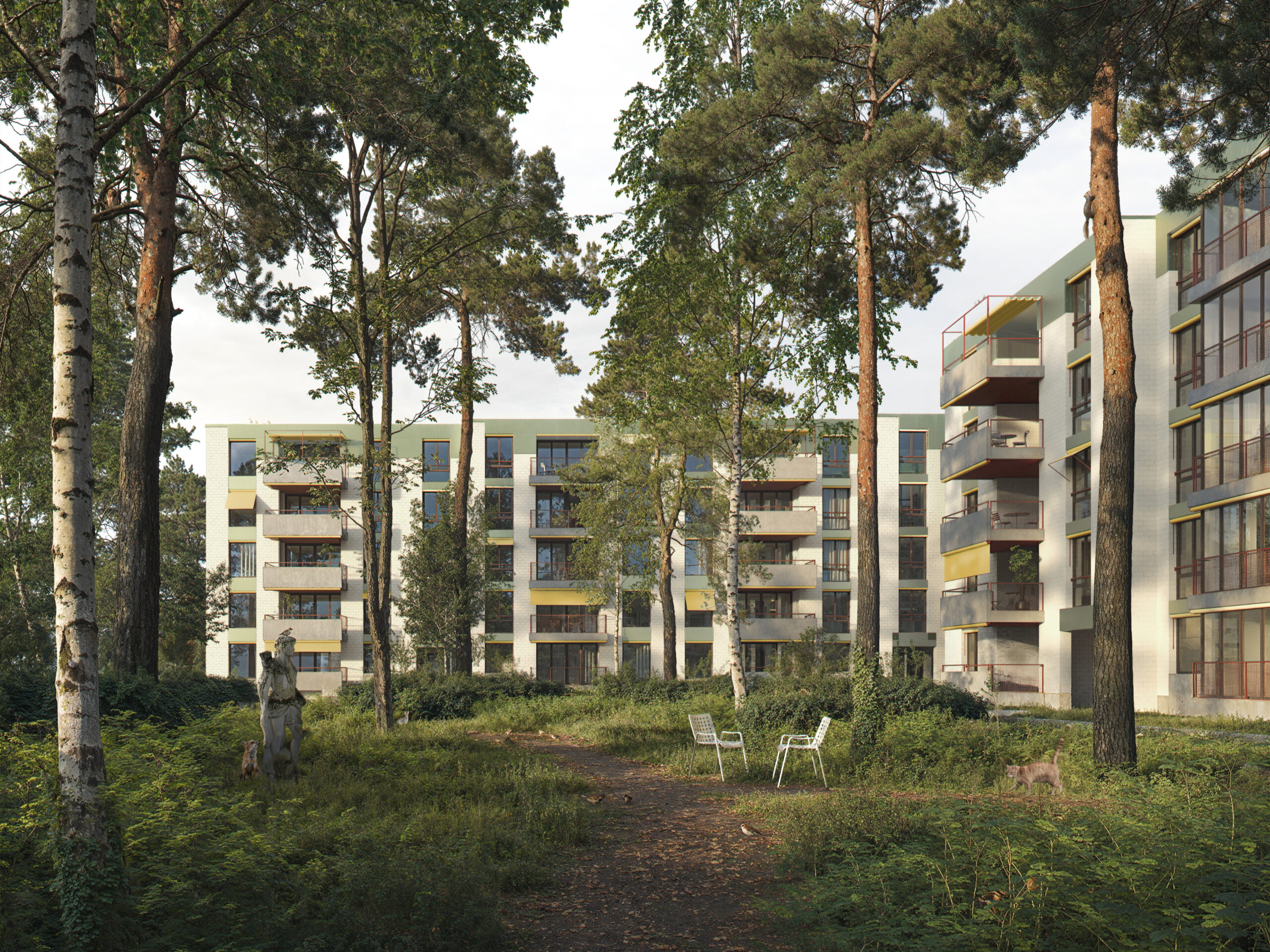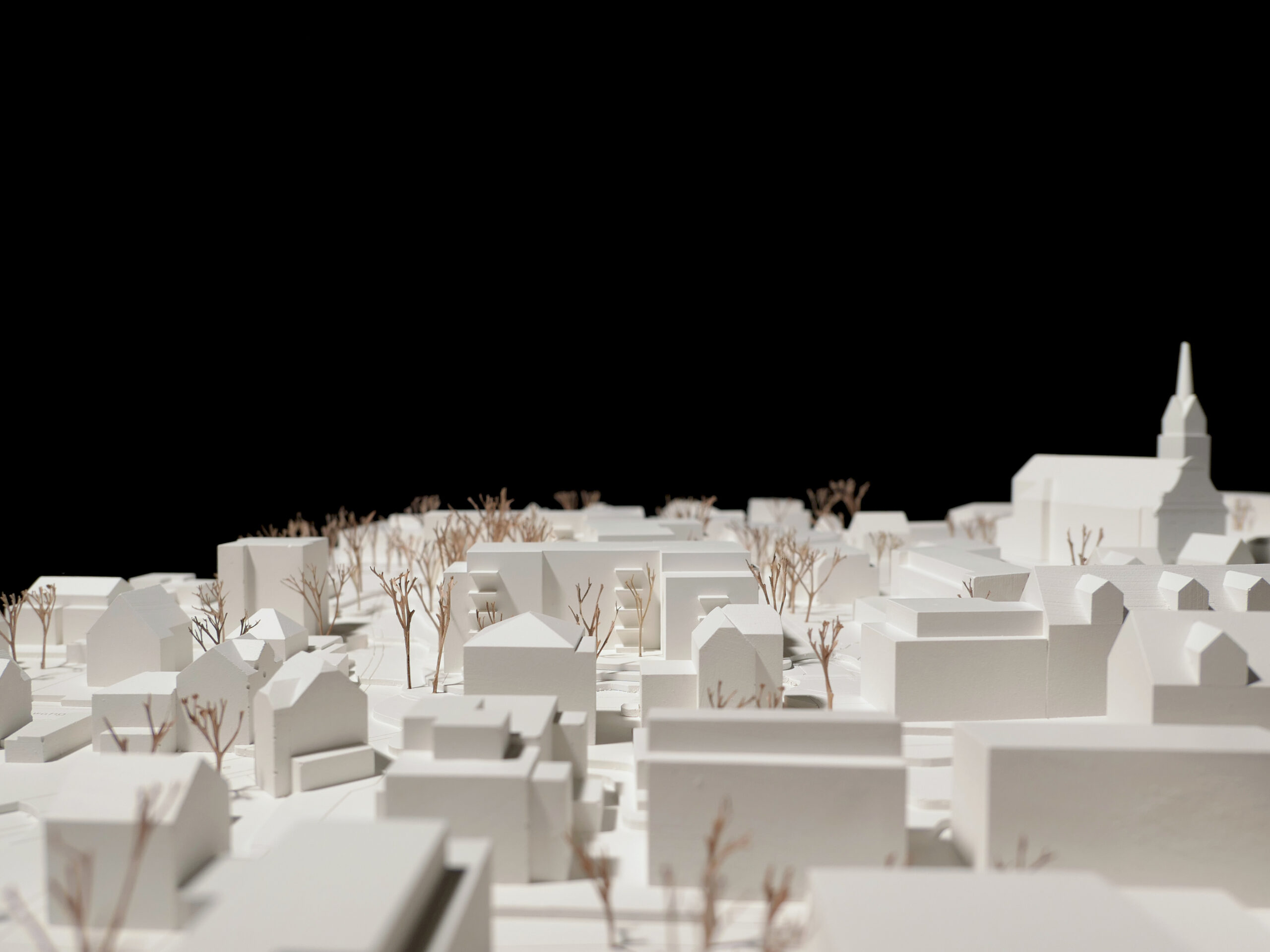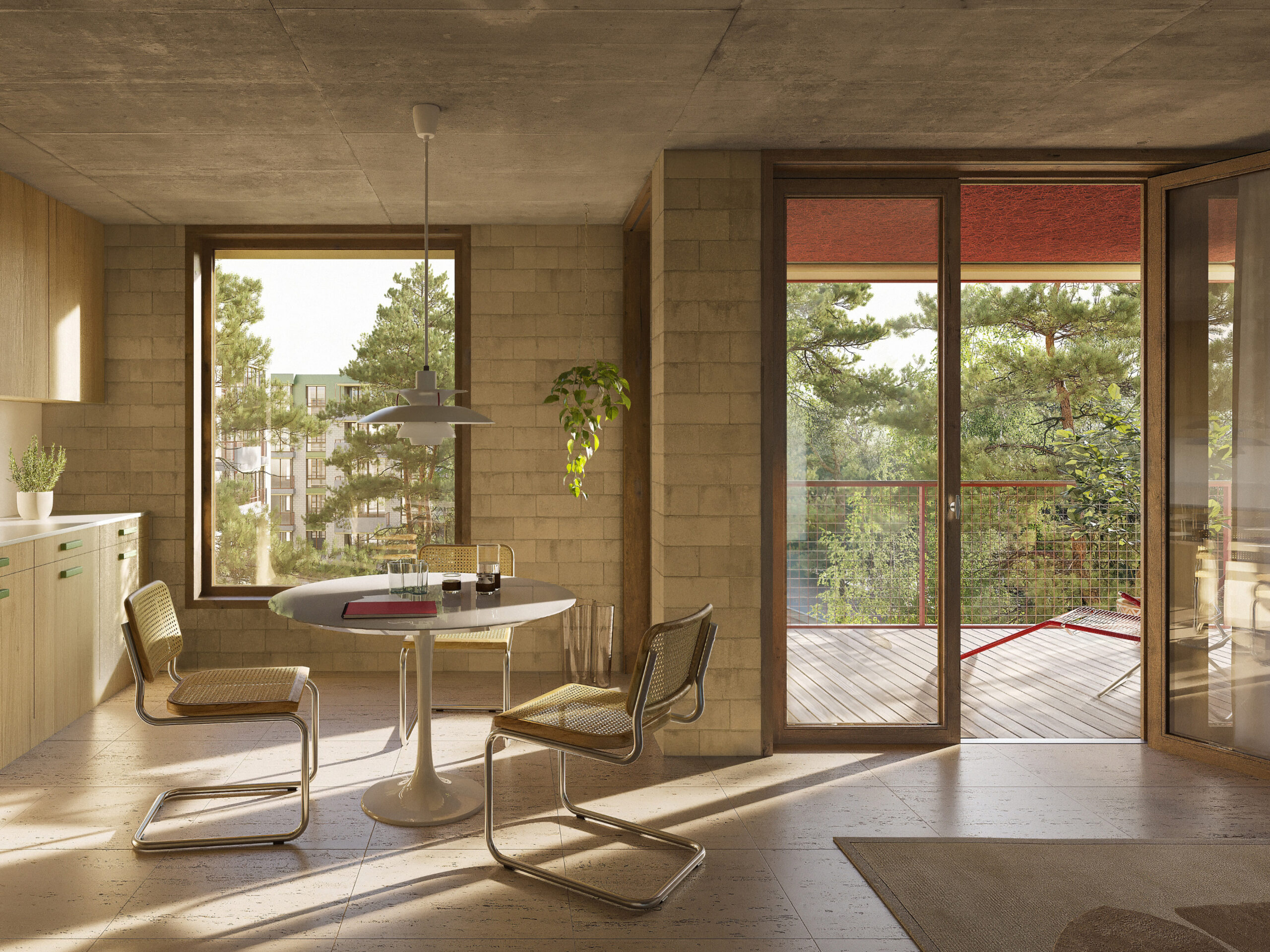 Das Seetal, geprägt durch die beiden Seen Hallwilersee im Norden und Baldeggersee im Süden, erstreckt sich in Nord-Süd-Richtung zwischen Emmenbrücke und dem aargauischen Lenzburg. Am südlichen Ende des Baldeggersees liegt die Gemeinde Hochdorf als regionales Zentrum des Seetals. Die Gewerbenutzungen in der Verbindungachse Richtung Norden sowie die Brauerei zeigen den bereits frühen Anspruch von Hochdorf als regionales Zentrum. Das Areal B2 befindet sich im Dorfzentrum von Hochdorf, angrenzend an die imposante Pfarrkirche Kirche St. Martin. Die städtebauliche Setzung ermöglicht den räumlichen Bezug zwischen dem Kirchenareal und dem sich gegen Norden ausdehnenden Wohnquartier. Die neue Überbauung bildet zusammen mit den bestehenden Wohnbauten den qualitativen Auftakt der Quartierstrasse Kirchweid. Die volumetrischen Versätze der drei Gebäude orientieren sich in ihrer Körnung und Proportion an den benachbarten Wohnbauten und ermöglichen dadurch eine qualitative ortsbauliche Integration. Drei kompakte Neubauten definieren zusammen mit dem Freiraum einen Ort, welcher sich optimal in das Wohnquartier nahe dem Ortskern einfügt. Die Wohntypologie schafft die Basis für ein vielfältiges Wohnungsangebot für verschiedene Zielgruppen. Mit Ausnahme der Kopfbauten weisen alle Wohnungen einen direkten Sichtbezug zum Baumhain auf und setzen diesen in das Zentrum. Die Küchen, mit direktem Zugang zum Balkon, befinden sich an den Fassaden und bilden die räumliche Erweiterung des Wohn- und Essraumes. Diese Disposition führt zu einem deutlich grösseren Sichtbezug in Richtung Osten und Westen. Der bestehende Baumhain bildet das atmosphärische und räumliche Zentrum der Freiräume und wird als Element wesentlich ausgedehnt. Das entscheidende Merkmal der äusseren Erscheinung bildet die elegante Formensprache der Bauten, die vertikale Gliederung und die filigrane Tektonik der eingesetzten Materialien und Oberflächen. Ein Kalksandsteinmauerwerk und naturfarbene Betonelemente bilden die mineralischen Grundmaterialien der Aussenhülle. Ein Schlämmputz aus Zement und Kalkhydrat verleiht dem Mauerwerk seine eigene und unverwechselbare Optik. Fensterbrüstungen und ein Dachrand aus grünem Blech, gelbliche, textile Storen und die in Rot gehaltenen Metallelemente der Fenster, Geländer und Türen ergänzen die Grundmaterialien Stein und Beton und verleihen den Bauten einen zeitlosen Charme, der sich gut in die gebaute und natürliche Umgebung zu integrieren vermag und dessen zurückhaltende Farbigkeit sich im Baumhain widerspiegelt.