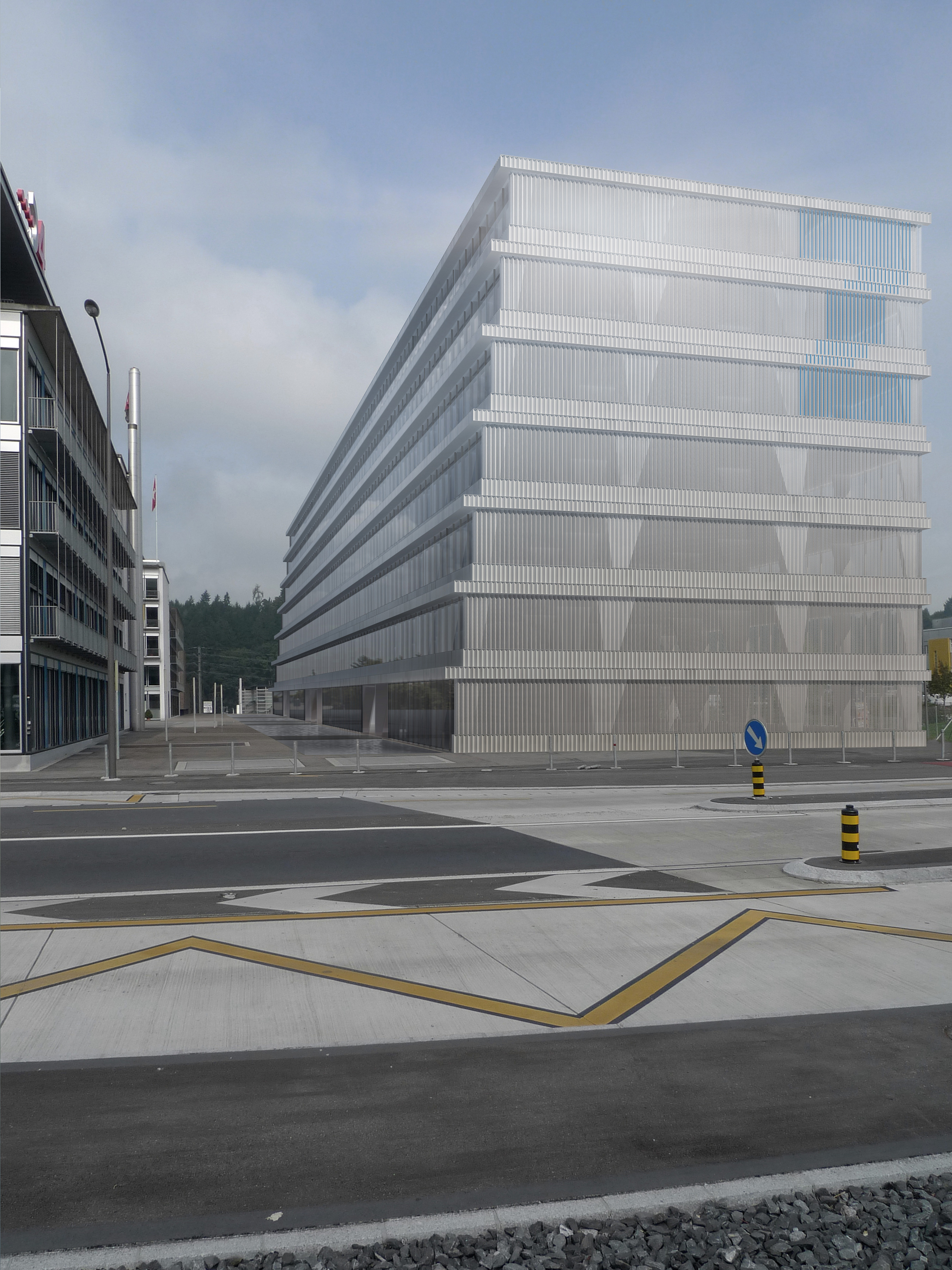 Das Areal des D4 Business Center befindet sich in einem Gewerbequartier in Root Längenbold. Die heutige Bebauung präsentiert sich als eine Gruppe von grossmassstäblichen rechteckigen Volumen mit unterschiedlichen Gesichtern. Am nordöstlichen Kopf des Campus befindet sich das projektierte Bürogebäue Z1. Der Neubau reagiert städtebaulich mit zwei unterschiedlich geformten Hauptfassaden auf die landschaftliche Weite des Rontals und auf die bestehenden Bauten und den zentralen, öffentlichen Platz des D4 Areals. Die direkt formulierte Dimension der Nordostfassade definiert den Abschluss des Areals und sucht den Dialog mit der Umgebung. Gegenüber dem Hauptplatz und den angrenzenden Gebäuden reagiert der Neubau mit eine kaskadenartig abgetreppten Fassadenfront. Die einprägsame Schnittform des Neubaus zeigt sich an den Kopffassaden. Symbolhaft präsentieren die fensterlos wirkenden Seitenfassaden die Gebäudestruktur und reagieren mit sachlicher Prägnanz auf die Umgebung. Gefaltete Edelstählbänder umhüllen das Bürohaus. Matt glänzend betonen die auf konstruktiver Logik basierenden Schichten die Höhenentwicklung des Gebäudes und vermögen die Lichtstimmungen der gebauten Umgebung und der Natur wiederzugeben. Die charakteristische Tragstruktur prägt die Stimmung der Innenräume und bildet eine kraftvolle Ausgangslage für einen attraktiven Innenausbau.