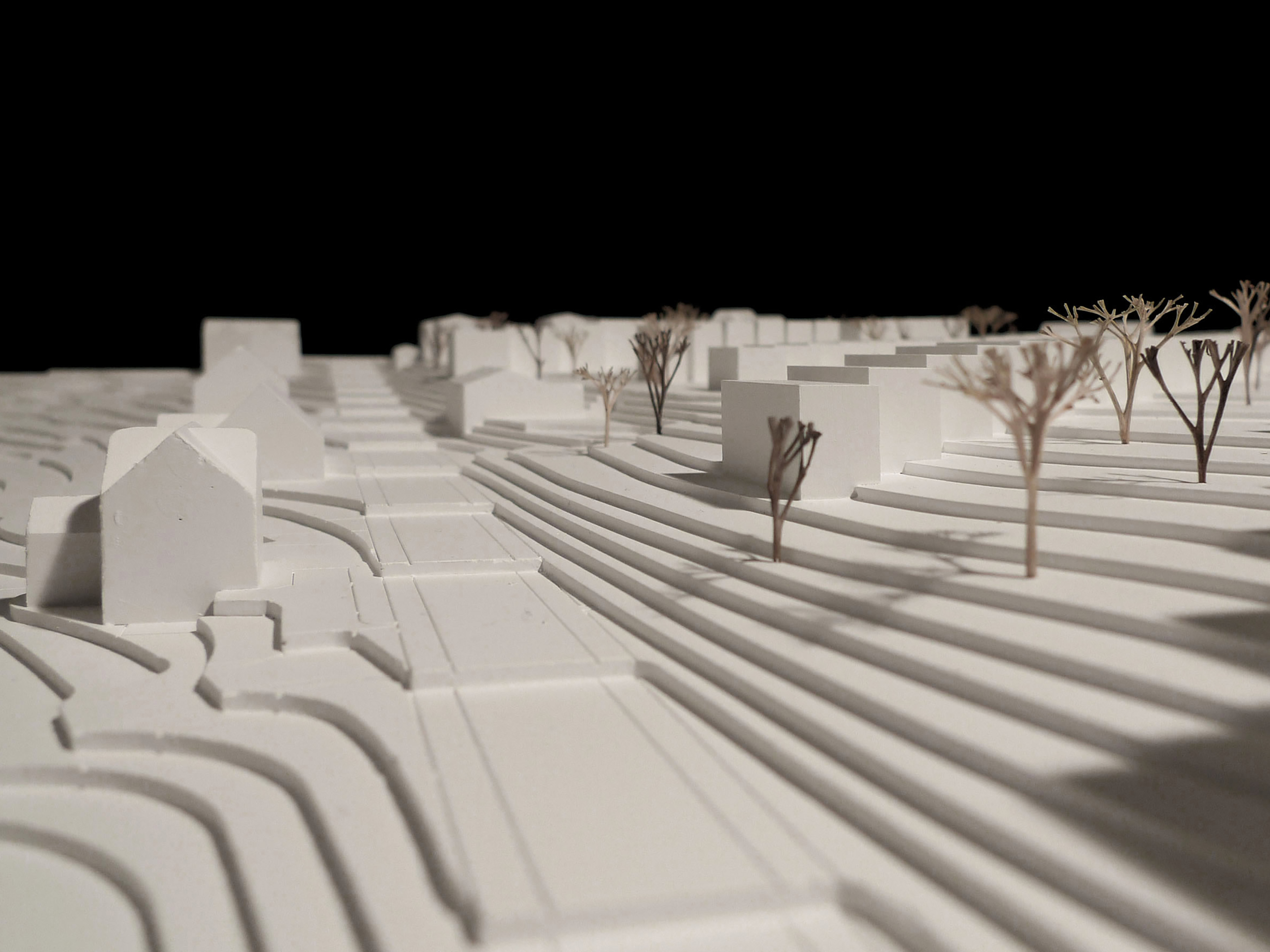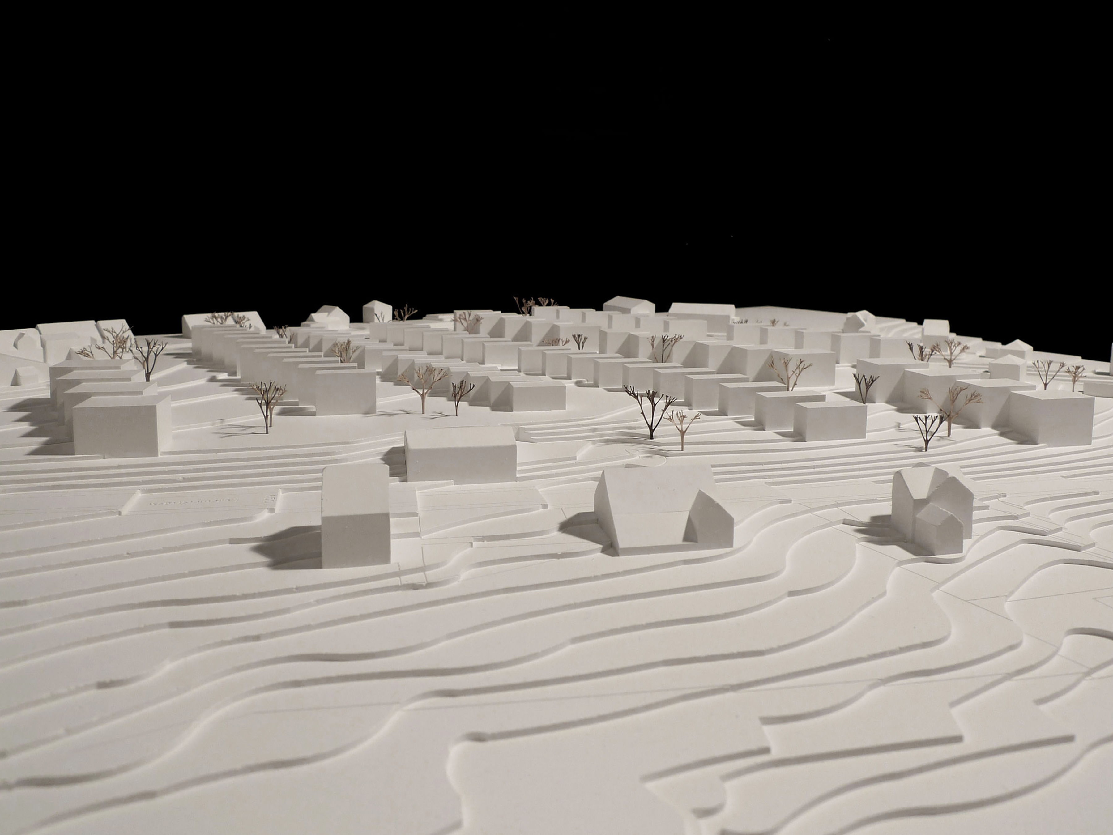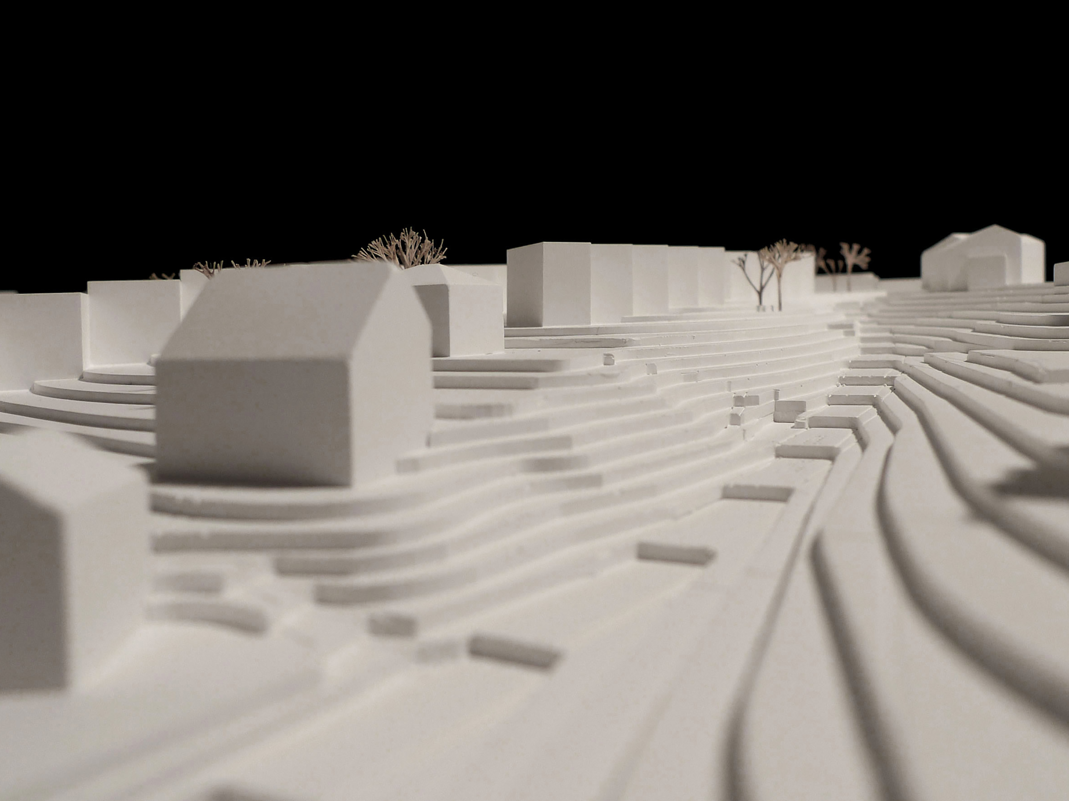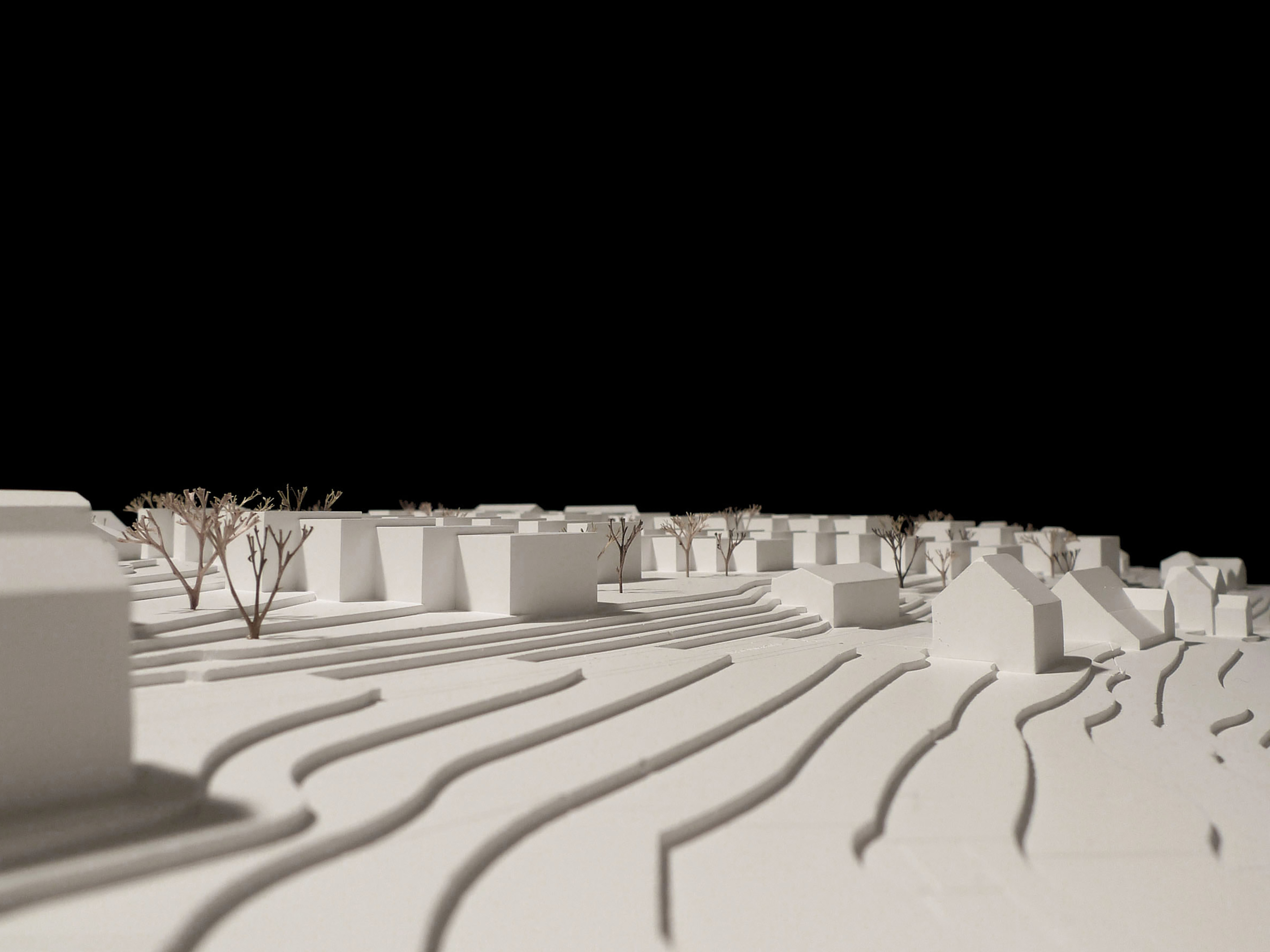 Sechs Bauzeilen mit unterschiedlichen Wohnformen und Gebäudetypen sind diagonal auf dem Grundstück angeordnet und verfolgen ein klares, übergeordnetes Prinzip. Die dem gewachsenen Terrain folgenden Häusergruppen verlaufen von Norden nach Süden und erzeugen grosszügige Zwischenräume. Sowohl die Wohneinheiten der neuen Siedlung als auch die bestehenden Wohnquartiere im Süden des Areals profitieren von der hohen Quertransparenz der gewählten Struktur. Die Seitenfassaden der einzelnen Gebäudezeilen verdichten den Strassenraum der Luzernerstrasse massvoll und vermögen den heutigen Charakter der Ortszufahrt zu stärken ohne die exklusive, städtebauliche Verdichtung des Fleckens in Beromünster zu konkurrenzieren. Der wechselnde Rhythmus der gemeinsamen Freiräume bietet jeder Häuserzeile eine angrenzende Spielstrasse und einen benachbarten Grünraum. Neben der durch die Volumenkonzentration in Zeilen hervorgerufenen Grosszügigkeit, sind es die leichte Neigung und die damit verbundene Fernsicht auf die gegenüberliegende Geländekuppe welche die Lagequalitäten der Aussenräume bestimmen. Die drei Spielstrassen sind räumlich interessant gegliedert und dienen den Bewohnern des neuen Quartiers als Zugang, Begegnungsort und Spielbereich.