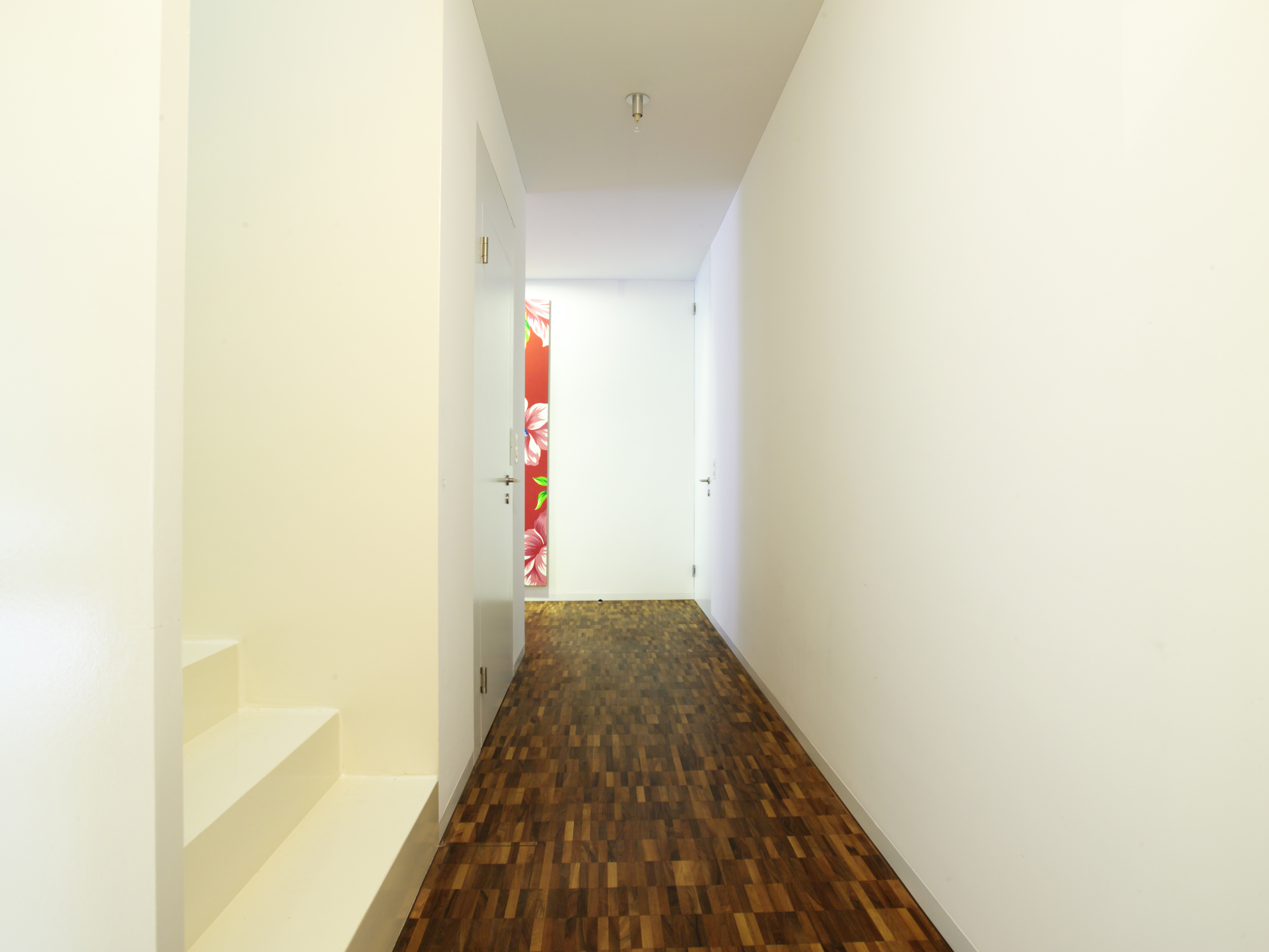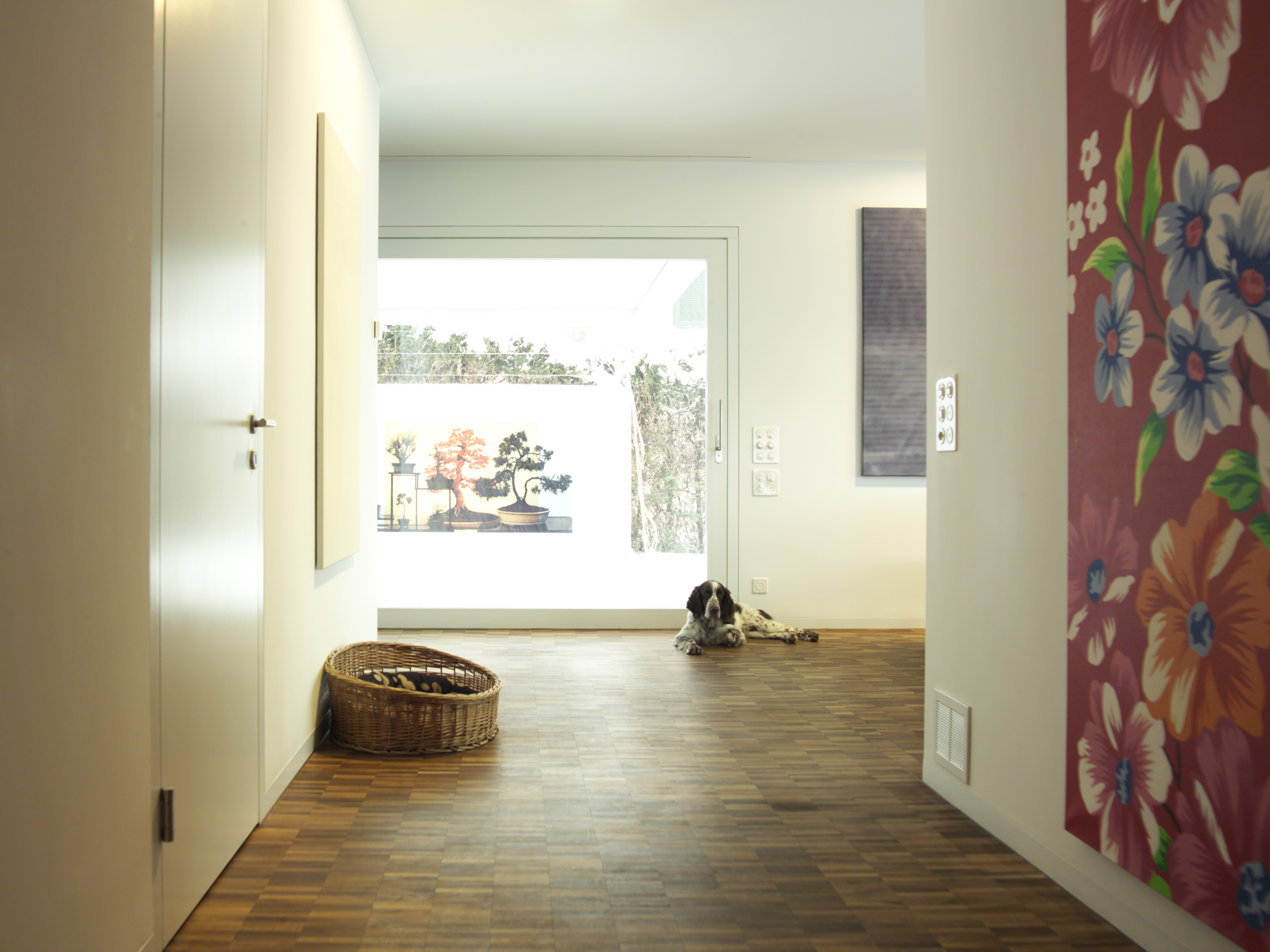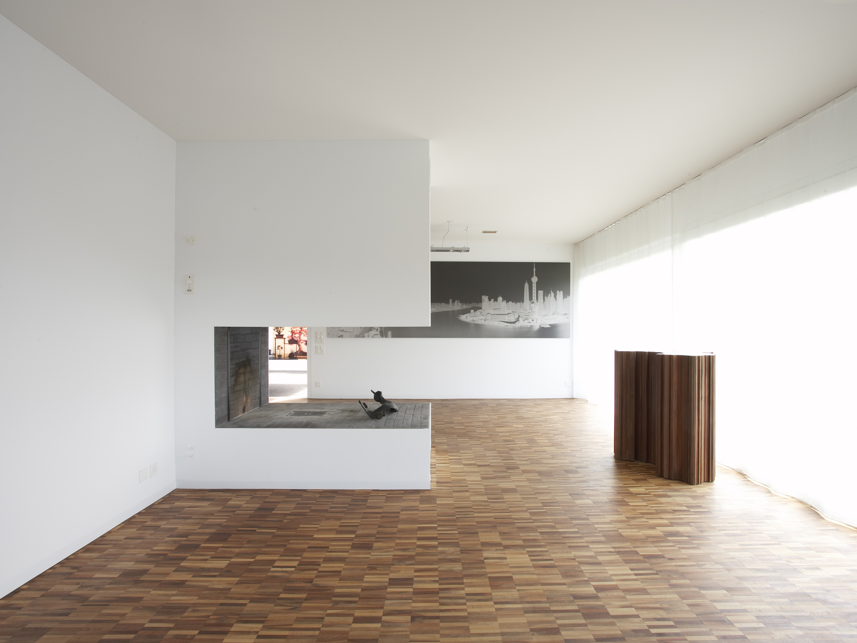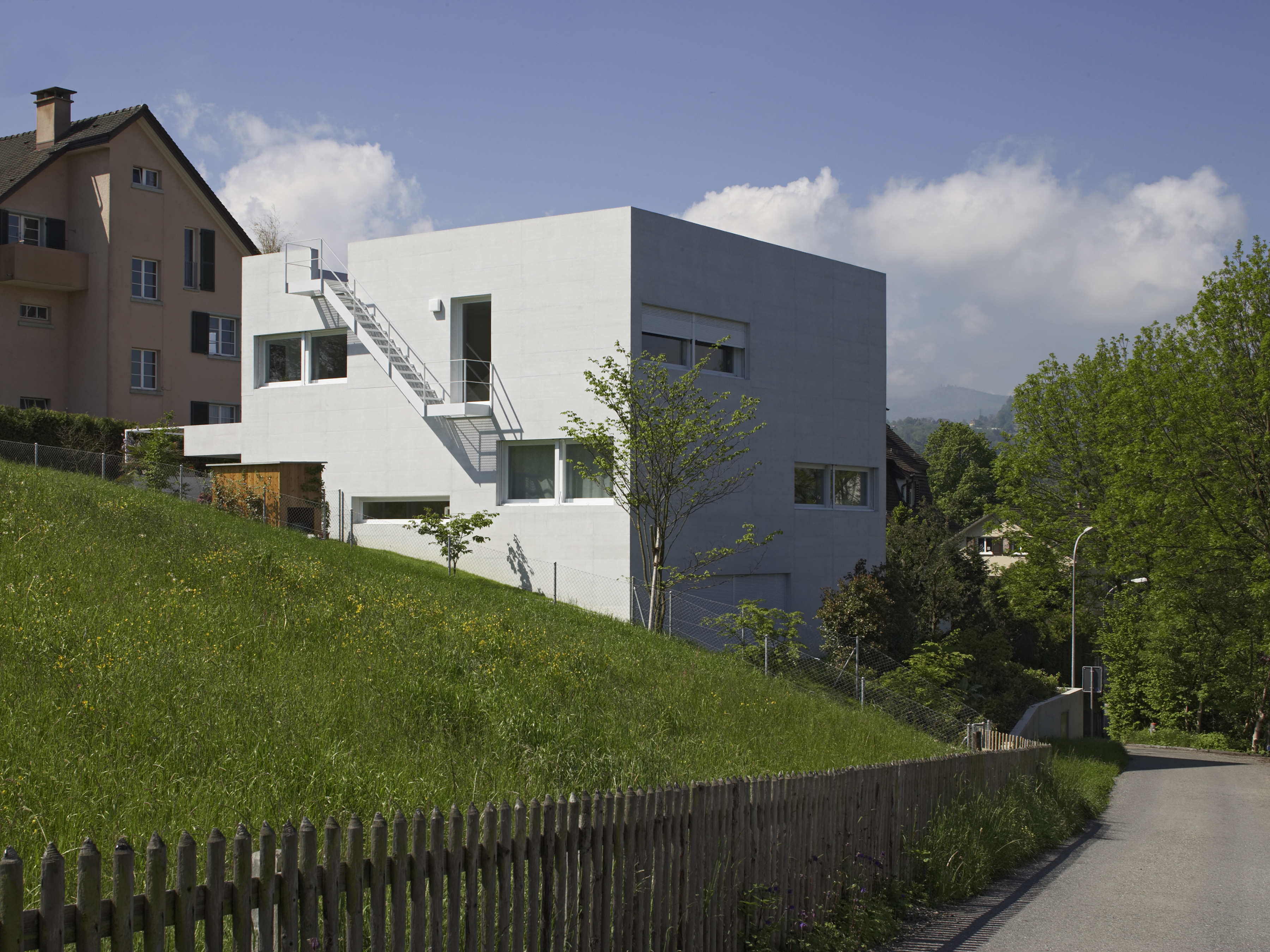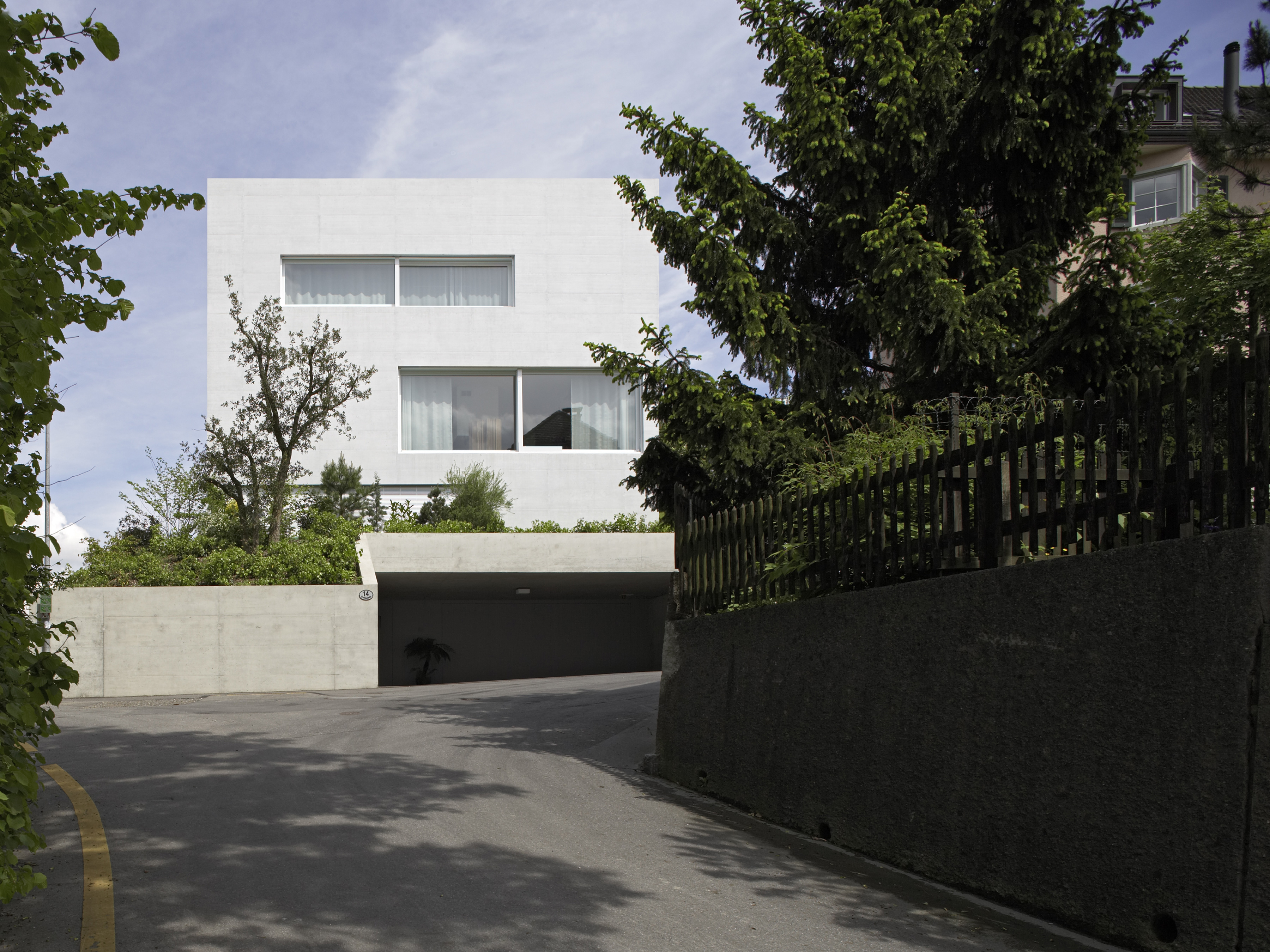 Der kompakte Solitär nimmt das Bebauungsmuster der Bramberghöhe auf und präsentiert sich stolz als Zeilenabschluss zwischen der Zufahrtstrasse Bramberghöhe und der direkt angrenzenden Grünkuppe Allenwinden. Mit grosser Selbstverständlichkeit fügt sich der würfelartige Baukörper in das geneigte Terrain ein. Die über dem Parkgeschoss konzipierte Einliegerwohnung orientiert sich hangseitig, während die Hauptwohnung in den oberen zwei Geschossen von der allseitig guten Aussicht profitiert. Die Organisation der quadratischen Grundfläche basiert auf einem klassischen Villengrundriss. Die allseitig orientierten Räume werden über einen zentralen Vorraum erschlossen und sind windmühlenartig angeordnet. Diese klare Grundrisskonzeption kann auf die geschossspezifischen Eigenschaften und Problematiken mühelos reagieren und manifestiert sich auch in der Fensteranordnung. Der Anspruch, Räume für Kunst zu schaffen, und eine pragmatische Benutzerfreundlichkeit verschmelzen zu repräsentativer Wohnkultur