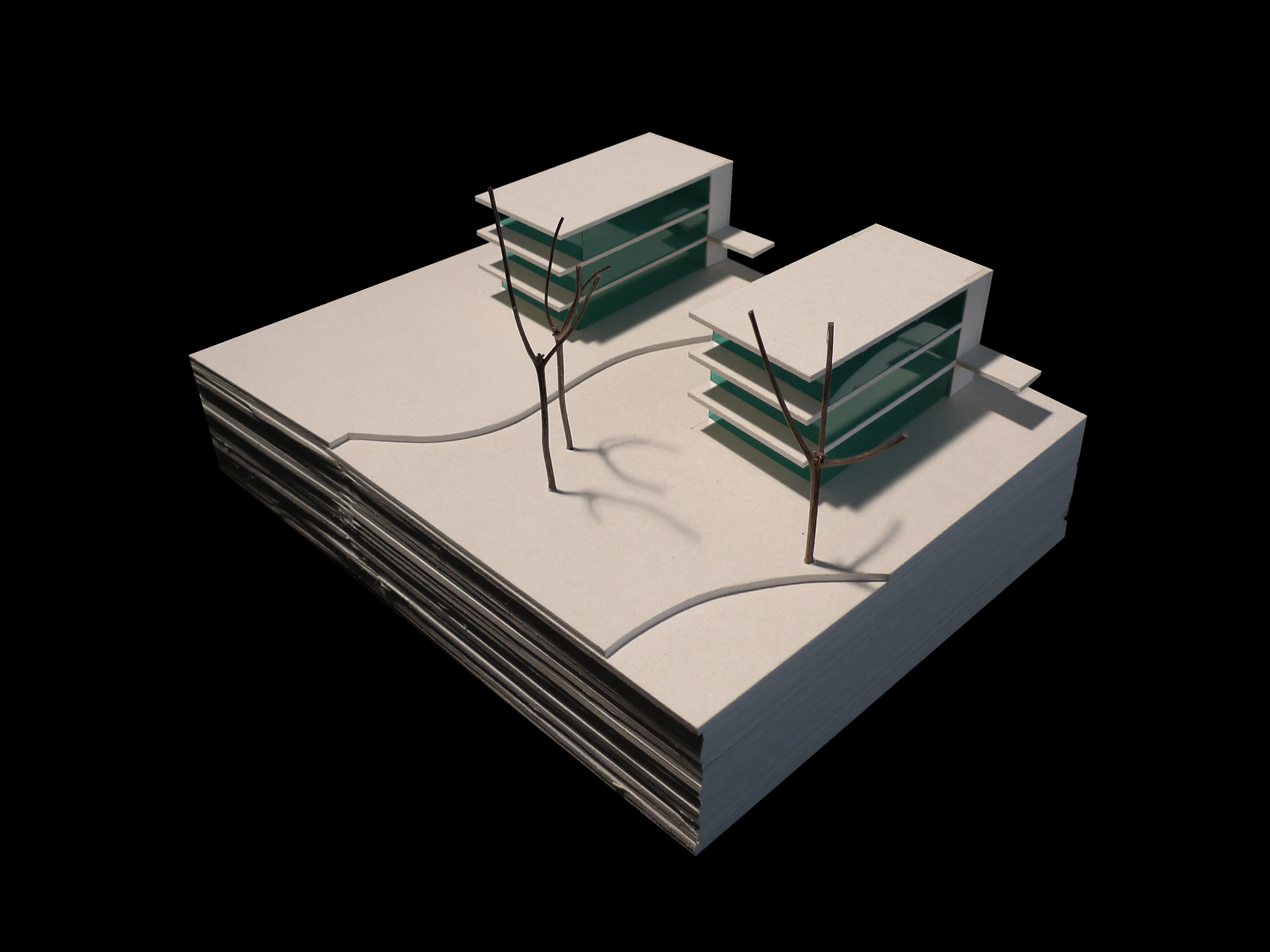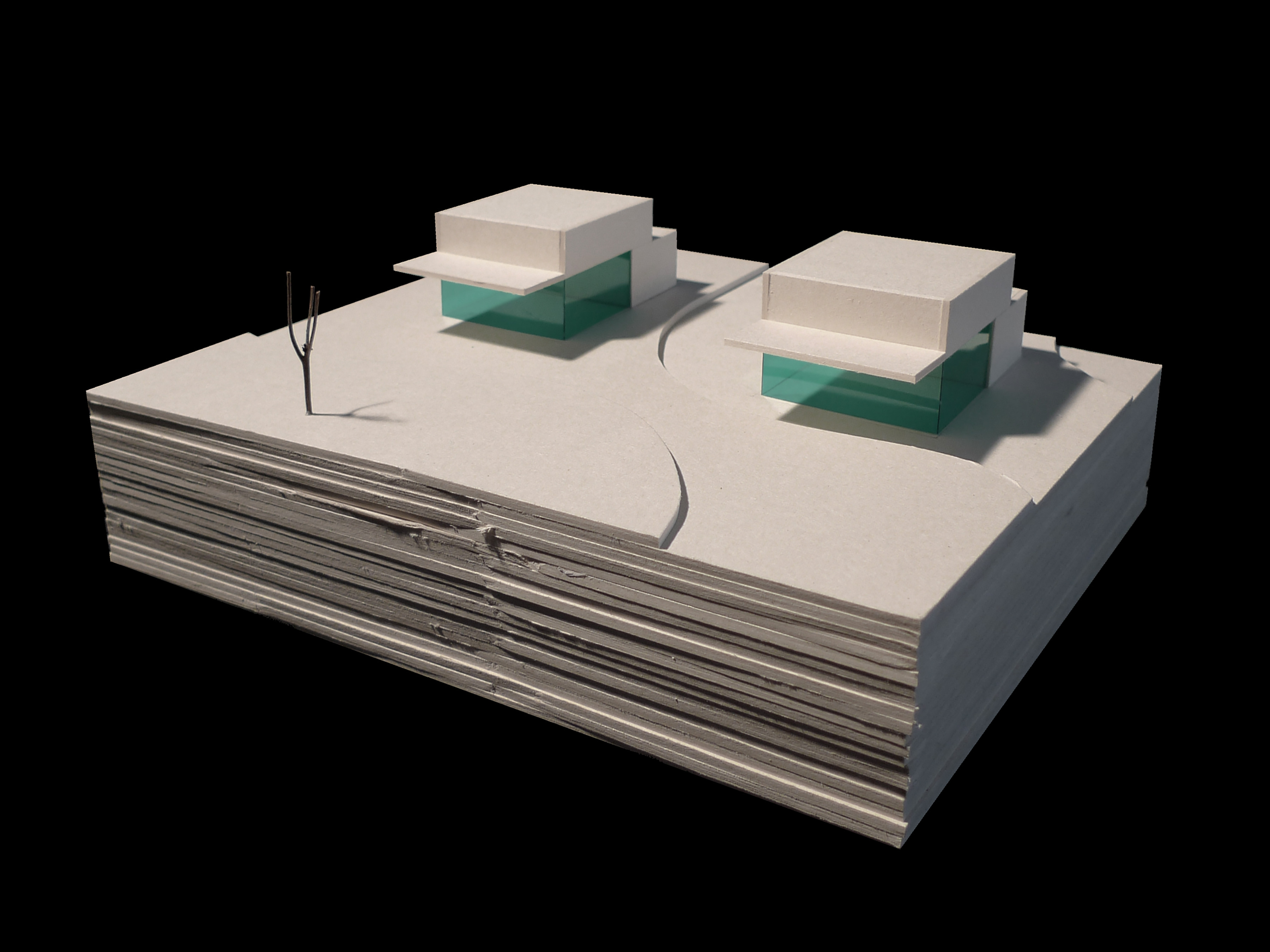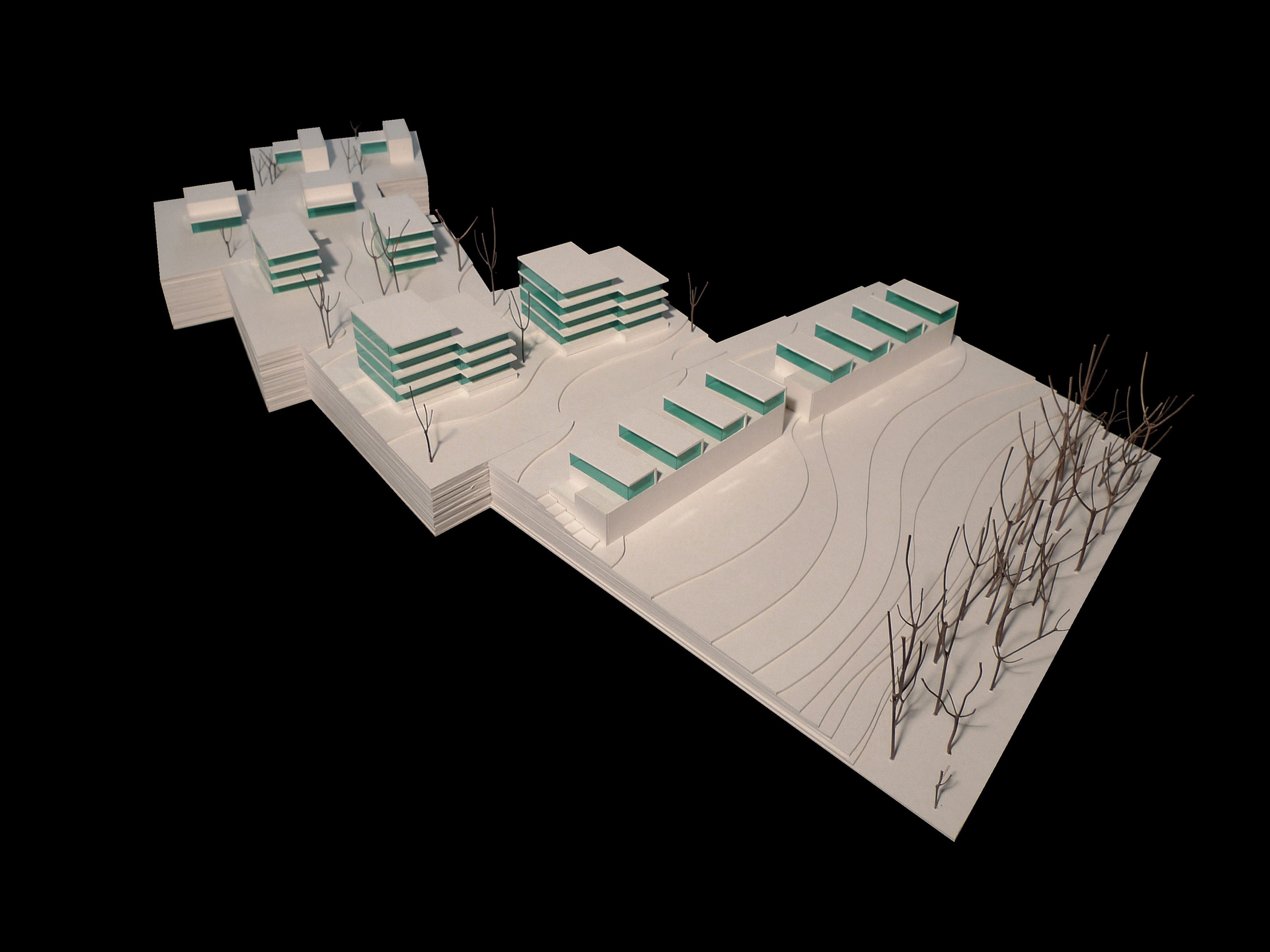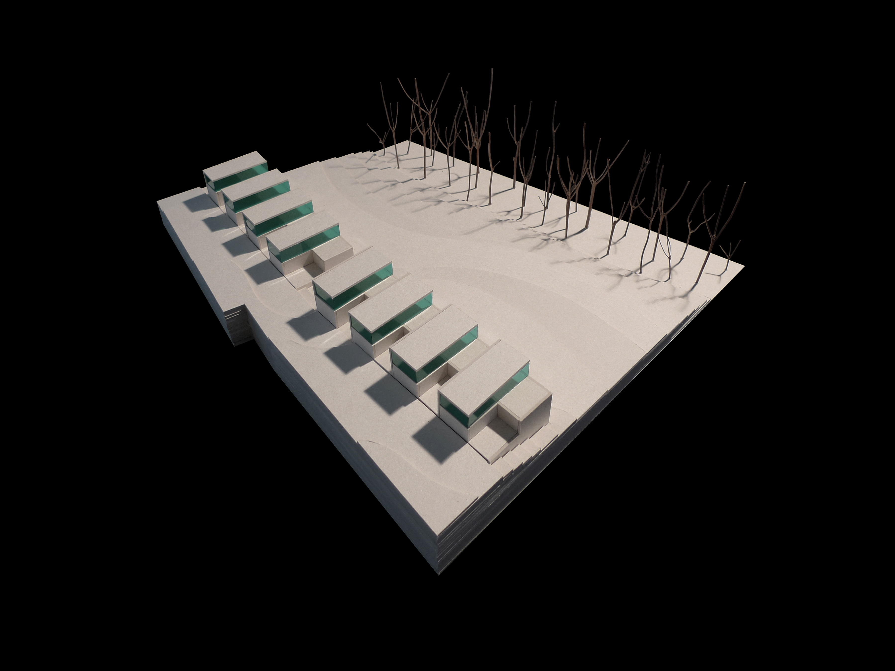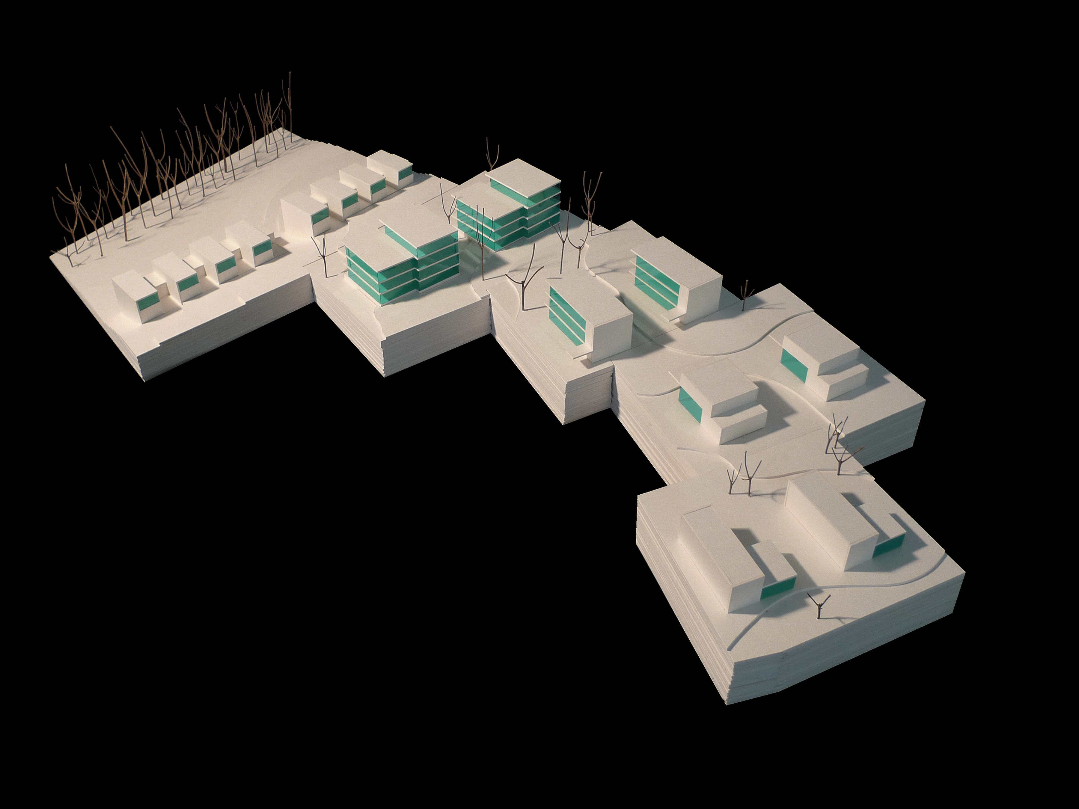 Fünf sanft geformte Gebäudezeilen fügen sich zwischen dem Wohngebiet Eichenring und dem Huobefangwald in die bestehende Situation ein. Die leicht gefächerten Zeilen gehen auf die ortsbaulichen Gegebenheiten der Umgebung ein und reagieren auf die topographischen Eigenheiten des Grundstückes. Die einzelnen Bauten der Zeilen folgen konsequent dem gewachsenen Terrain. Die Volumen der einzelnen Gebäudereihen sind gegenseitig versetzt und lassen abwechslungsreiche Zwischenräume und vielfältige Ausblicke entstehen. Präzise gestaltete Wohneinheiten reagieren auf die jeweilige Lage innerhalb der Siedlung und ermöglichen durch ihre Vielfalt ein dem Ort und der Gemeinde entsprechendes, vielfältiges Wohnen.