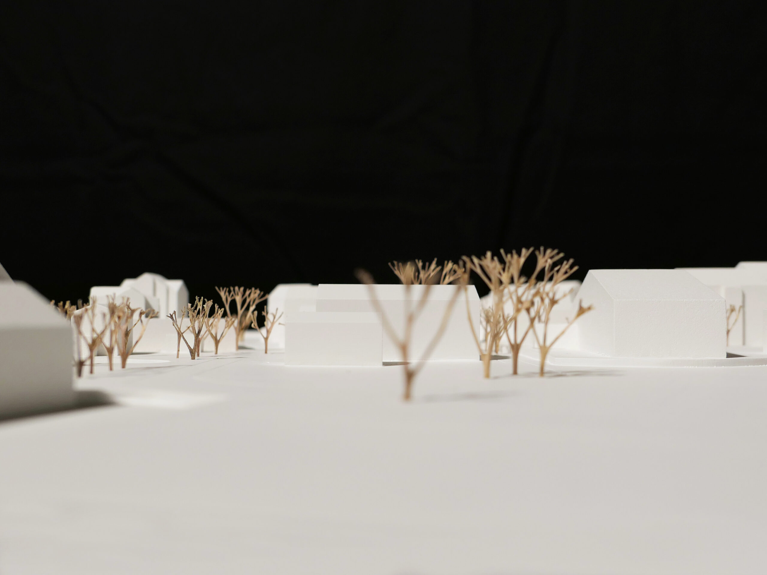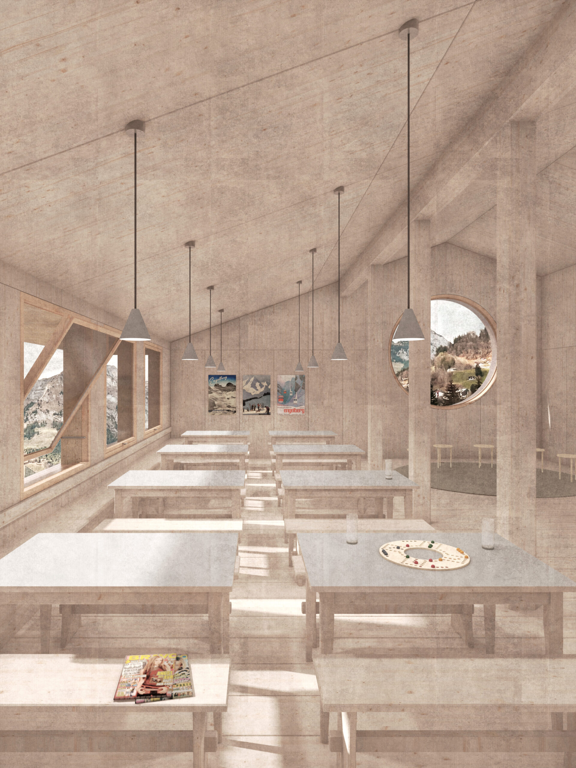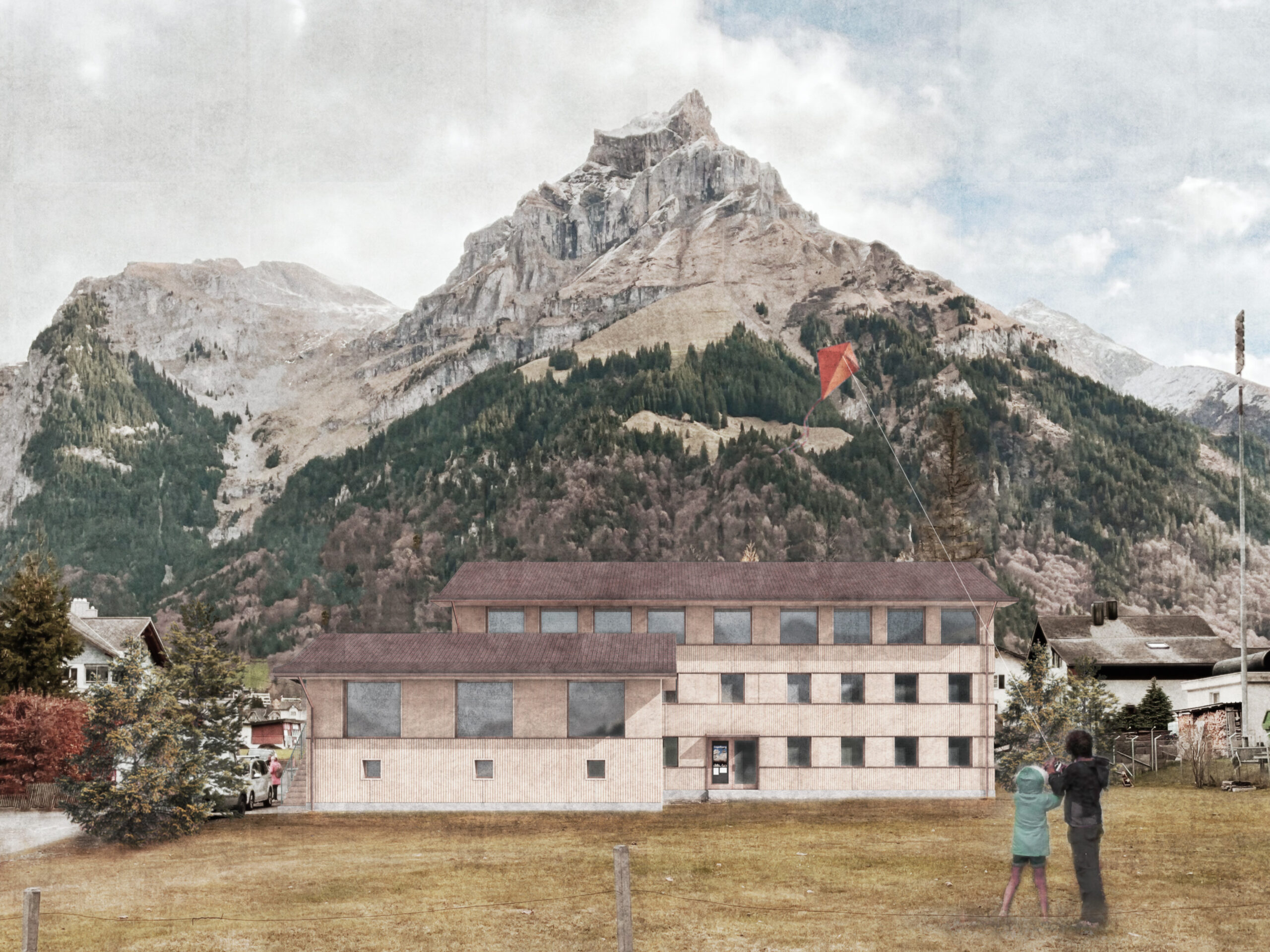 Das in den 60er Jahren erbaute und später erweiterte Jugendhaus St. Raphael in Engelberg entspricht nicht mehr den heutigen Anforderungen und soll durch einen Neubau ersetzt werden. Engelberg liegt in einem flachen, weiten Hochtal auf rund 1000 m Höhe. Inmitten der imposanten Bergkulisse, im Osten des Dorfes, unweit der Klosteranlage situiert, wird das Grundstück über den Wiesenweg erschlossen. Die zwei rechtwinklig zur Erschliessungsstrasse platzierten, leicht versetzt angeordneten Bauten reagieren in Stellung, Dimension und Ausrichtung auf das spezifische Grundstück am Siedlungsrand und auf die Nachbarschaft. Sowohl das dreigeschossige Jugendhaus als auch das um ein Geschoss niedrigere Nebengebäude basieren auf längsrechteckigen Gebäudegrundflächen, werden von geneigten Satteldächern gedeckt und sind einer konsequent einfachen und zweckmässigen Bautypologie verpflichtet. Die Stellung der Bauten nutzt den östlichen Teil des Areals und schafft als Folge der besagten Versetzung spezifische Umgebungsflächen mit interessanten und vielfältigen Umräumen. Das auf drei Geschossen organisierte Hauptgebäude verfügt über eine zentrale Treppenhausschicht, welche das Haus in sechs Organisationseinheiten gliedert. Im Erdgeschoss und im ersten Obergeschoss flankieren kompakte Gruppeneinheiten die mittige Erschliessungszone. Klar und einfach werden die verschiedenen installationsintensiven Nassräume in einer zentralen Schicht übereinander angeordnet. Die multifunktionalen Aufenthaltsräume und die dazugehörigen Infrastrukturnutzungen sind im Dachgeschoss disponiert. Dieses Hauptgeschoss ist im Vergleich zu den Schlafgeschossen offen gestaltet, profitiert von einer attraktiven Raumhöhe, einem grossartigen Blick in die Bergwelt und wird mit entsprechenden Fensteröffnungen belichtet. Als funktionales Herzstück der Anlage vermag das Treppenhaus auf unterschiedliche Gruppenbelegungen zu reagieren. Über jeweils eine auf den Geschossen positionierte Verbindungstür lassen sich die Einheiten sauber trennen ohne auf eine angemessene sozialräumliche Qualität der Erschliessungszonen verzichten zu müssen. Die beiden längsrechteckigen Bauvolumen werden von zweckmässigen Fichtenholzfassaden verkleidet und von ortüblichen Ziegeldächern gedeckt. Den jeweiligen Raumnutzungen angemessene Fensteröffnungen an den Längsfassaden tragen die innere Ordnung der Bauten nach Aussen und werden innerhalb einer horizontalen Oberflächenstruktur gefügt. Während die Zimmergeschosse mit Holzläden verdunkelt und verschlossen werden können, profitieren die grösseren Fensteröffnungen unterhalb des Dachrandes vom weit ausladenden Vordach. Auch die Materialisierung der Innenräume bleibt einer ausgesprochenen Einfachheit verpflichtet und schöpft seine atmosphärische Kraft aus dieser Prämisse. Mit einer spezifischen Vorfertigung des gesamten Gebäudes, reduziert sich die Bauzeit in grossen Teilen auf eine reine Montage und fällt entsprechend kurz aus. Auf dieser Grundlage wird als Konstruktionsmodell ein auf die spezifische Nutzung des Hauses massgeschneiderter Holzsystembau vorgeschlagen. Im Bewusstsein der begrenzten natürlichen Ressourcen wird mit der vorgeschlagenen Bauweise Energie und Material gespart und so ein Beitrag zu einer ökologischen, dem Ort verpflichteten Baukultur geleistet.