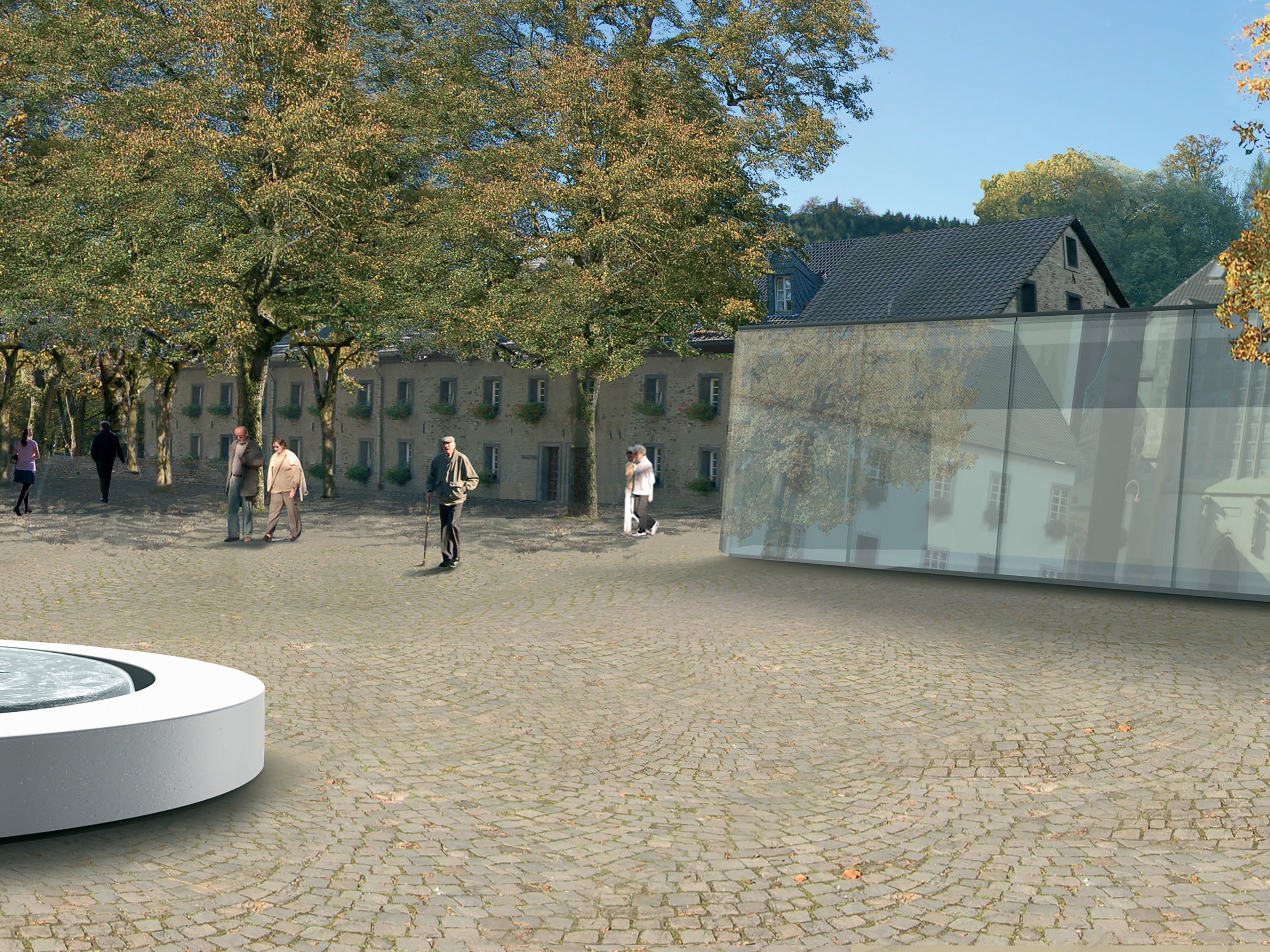 Die Situation in Altenberg charakterisiert sich durch den Gegensatz der Bedeutung dieses Ortes und der Heterogenität und räumlichen Regellosigkeit des heutigen Freiraumgefüges. Der Entwurf konzentriert sich darauf, die vorhandenen Qualitäten durch gezielte Vereinfachungen herauszuarbeiten und neu zur Geltung zu bringen. Der Domplatz, befreit von Mauern, Hecken und Einbauten, soll wieder eine angemessene Ausdehnung erhalten und als grosser, zusammenhängender Freiraum erlebbar werden. Vor dem Altenberger Hof wird mit einem massgeschneiderten Objekt auf die heutigen Konflikte der unterschiedlichen Nutzungsansprüche reagiert. Ein in seiner Disposition und Setzung zonierender Pavillon situiert sich im Spannungsfeld der historischen Nachbarschaft. Die Eigenschaften des Spiegelreflexglases, welches für die gegen den Dom gerichtete Fassade verwendet wird, sind vielfältig. Während diese einseitig transparente Verglasung dem geschützten Besucher der Gaststätte die freie Sicht zum Dom gewährt, eröffnet sich dem Betrachter von der gegenüberliegenden Seite ein illusionistischer Anblick. Je nach Standpunkt und Nähe des Betrachters zur spiegelnden Oberfläche des Pavillons sind unterschiedliche Bildfragmente der Domfassade erfahrbar. Die selbstbewusste und ruhige Qualität des Pavillons wird gewonnen aus der Direktheit und der spiegelnden Transparenz, mit denen er von seiner besonderen Lage und Verwendung spricht.