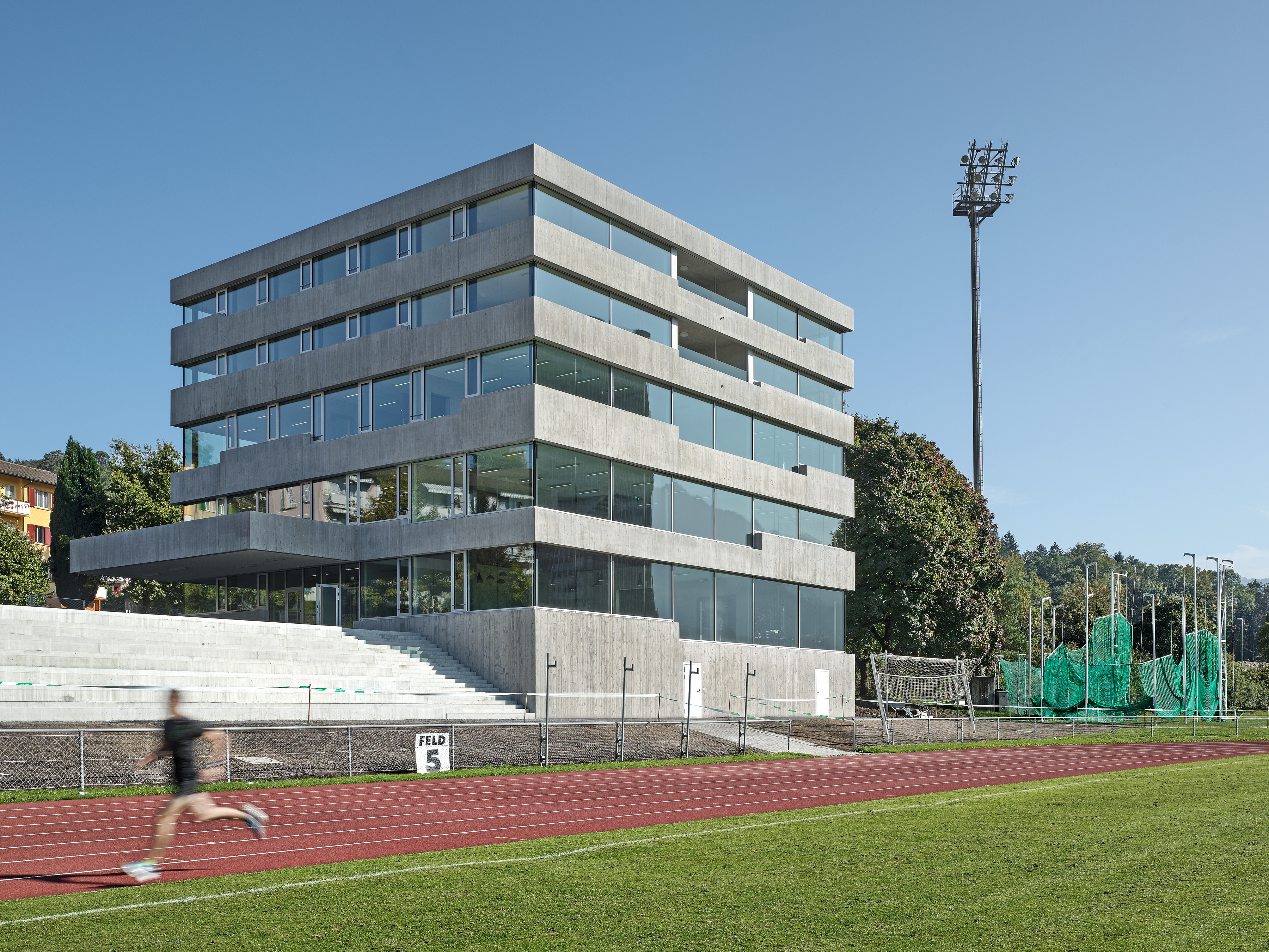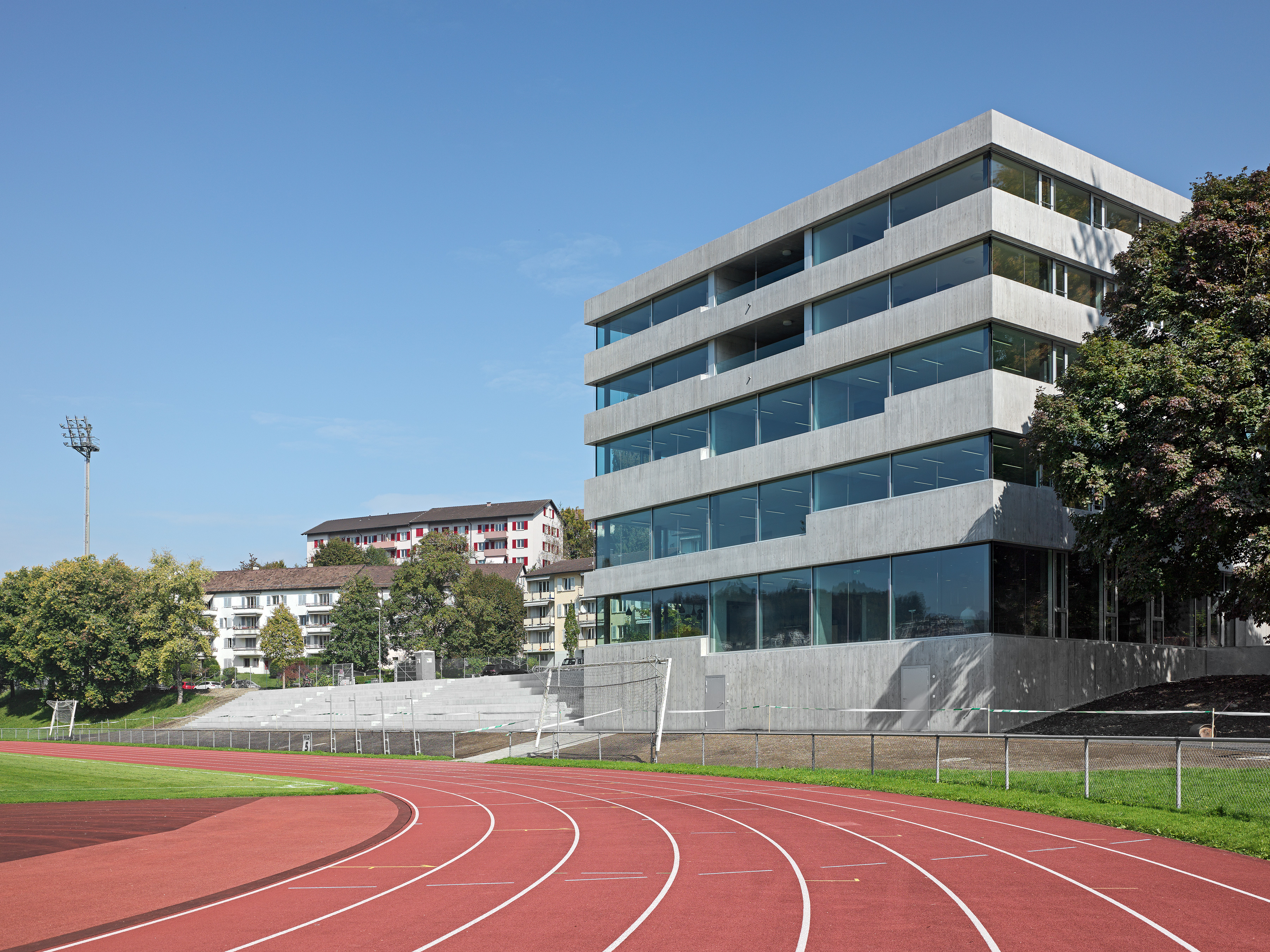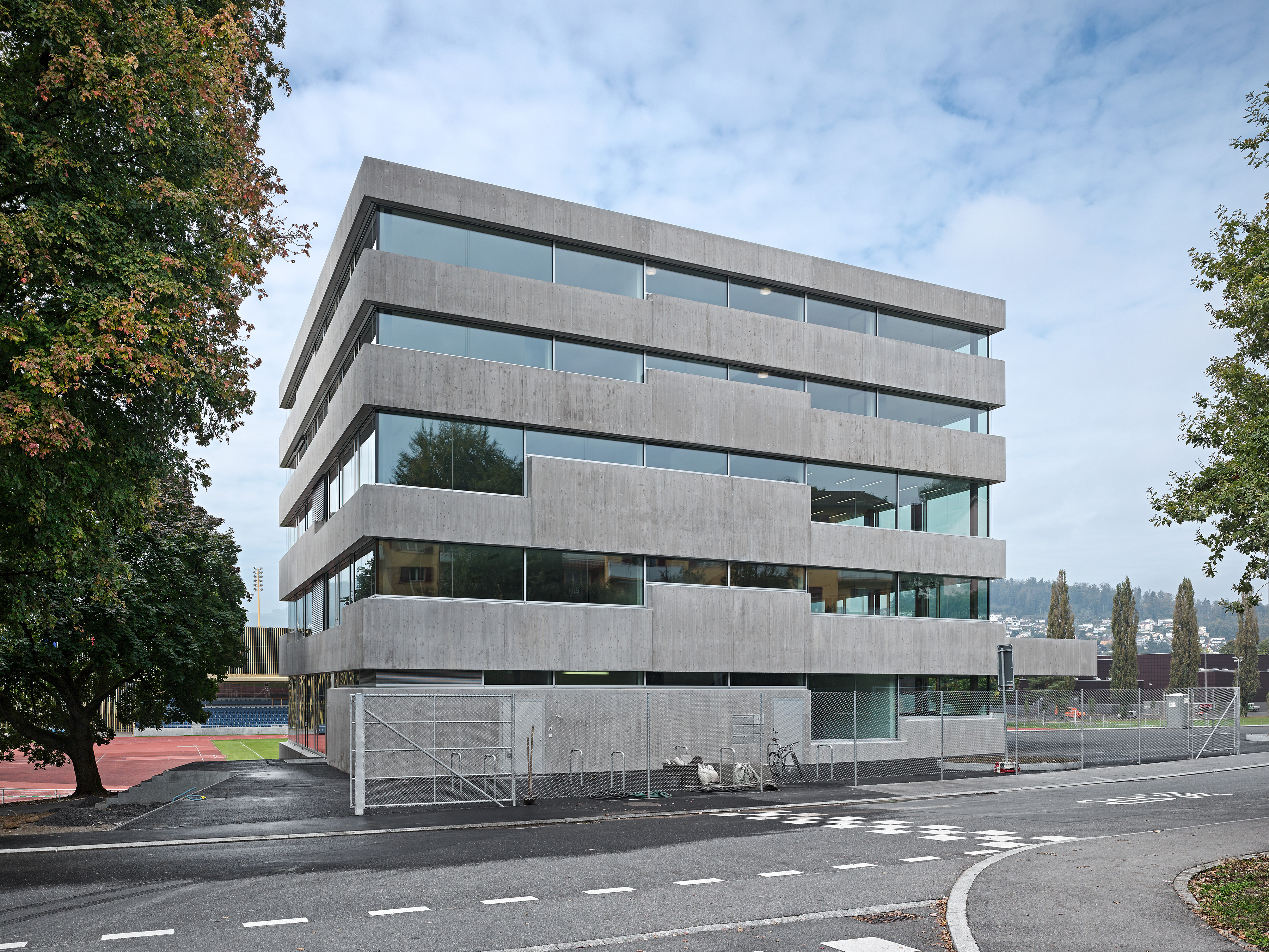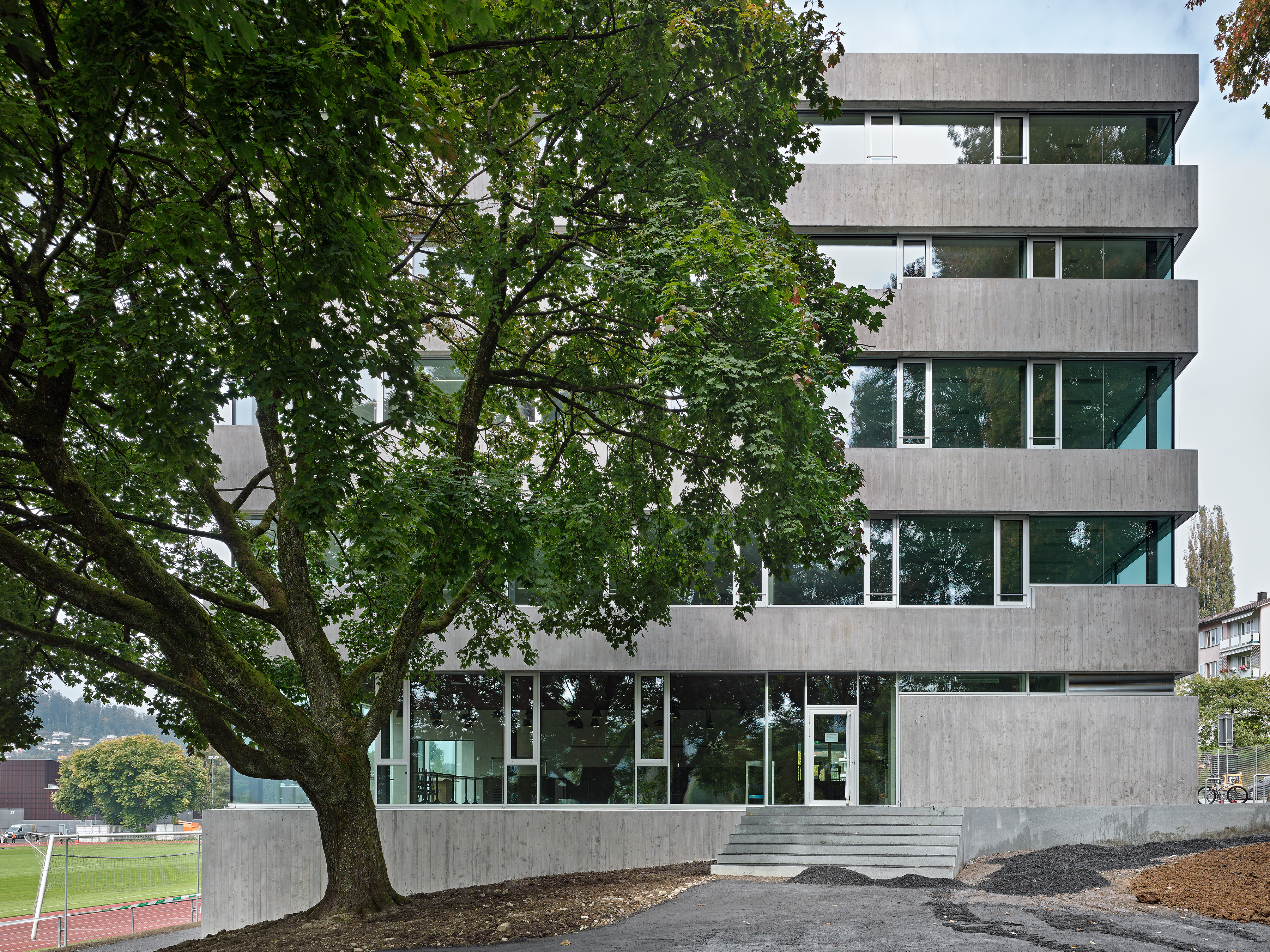 Der Standort der Pilatus Akademie liegt an der Hangkante zwischen dem Campus Allmend und dem Bireggquartiert. Der Ort veranschaulicht eine städtebauliche Schnittstelle. Während sich im Westen des Areals die Bauten der Swissporarena und die offen gestaltete Leichtathletikanlage ausbreiten, erhebt sich im Osten des Grundstückes ein klassisches Wohngebiet mit einer entsprechenden Baudichte. Eigenständig in sich ruhend steht die neue Pilatus Akademie am Fusse des Biregghanges. Das Projekt nutzt die Chance, ein prägnantes ortsbauliches Zeichen zu setzten, welches Bezüge zum unmittelbaren Kontext, aber auch zum weiträumigen Landschaftsraum aufbaut. Die im Bezug zu den Sportanlagen dezentrale Setzung lässt den ungerichteten Baukörper als flankierendes Element in Erscheinung treten. Der Bau vermittelt die Geste eines Beobachters. Die Leichtathletikbahn wird räumlich nicht gefasst, somit behält der Aussenraum seinen offenen Charakter. Die Anlage wird in ihrer Art gestärkt ohne eine abgeschlossene Stadionwirkung zu erzeugen. In Volumen und Ausdruck vermag die Akademie auf sensible Art und Weise zwischen den angrenzenden Gebieten zu vermitteln. Der grosszügiger Platz und die Freilufttribüne im Norden verankern den Baukörper mit der gewachsenen Topografie des Geländes.
