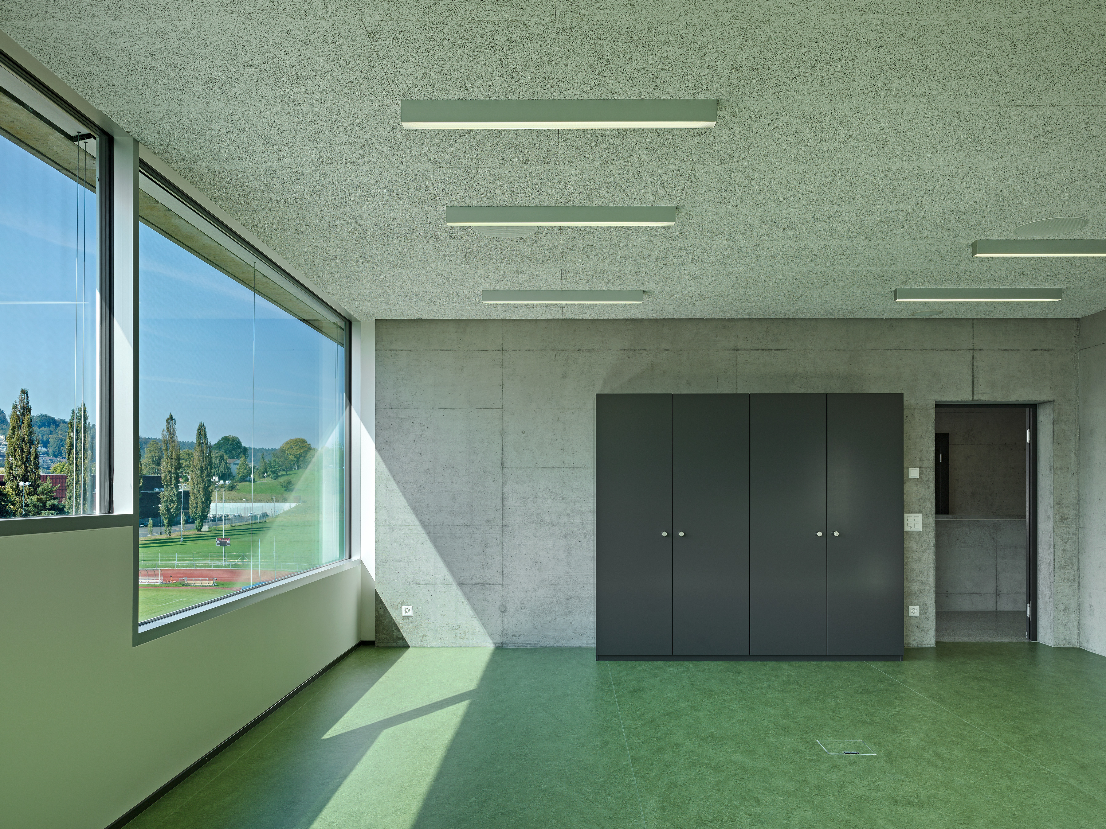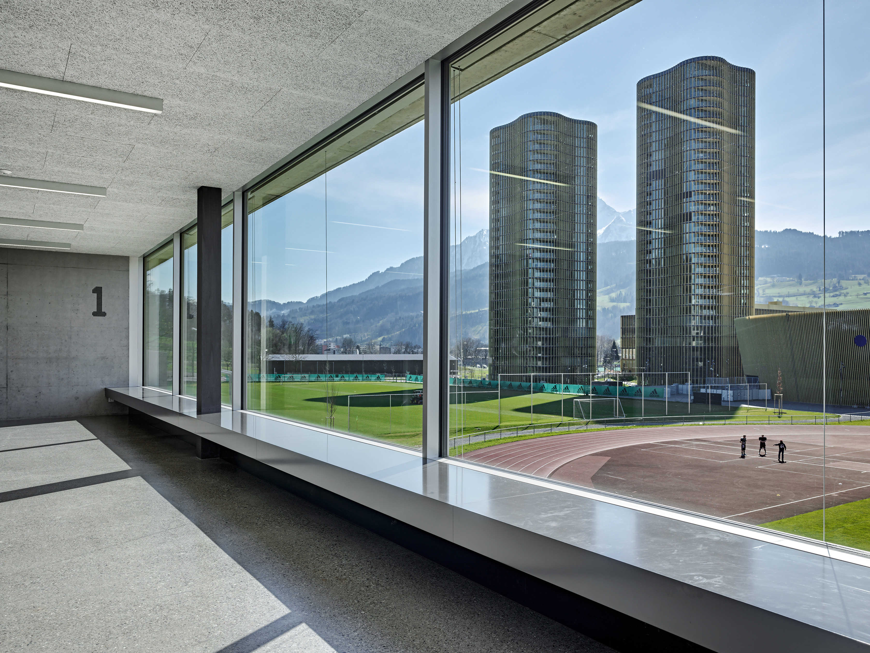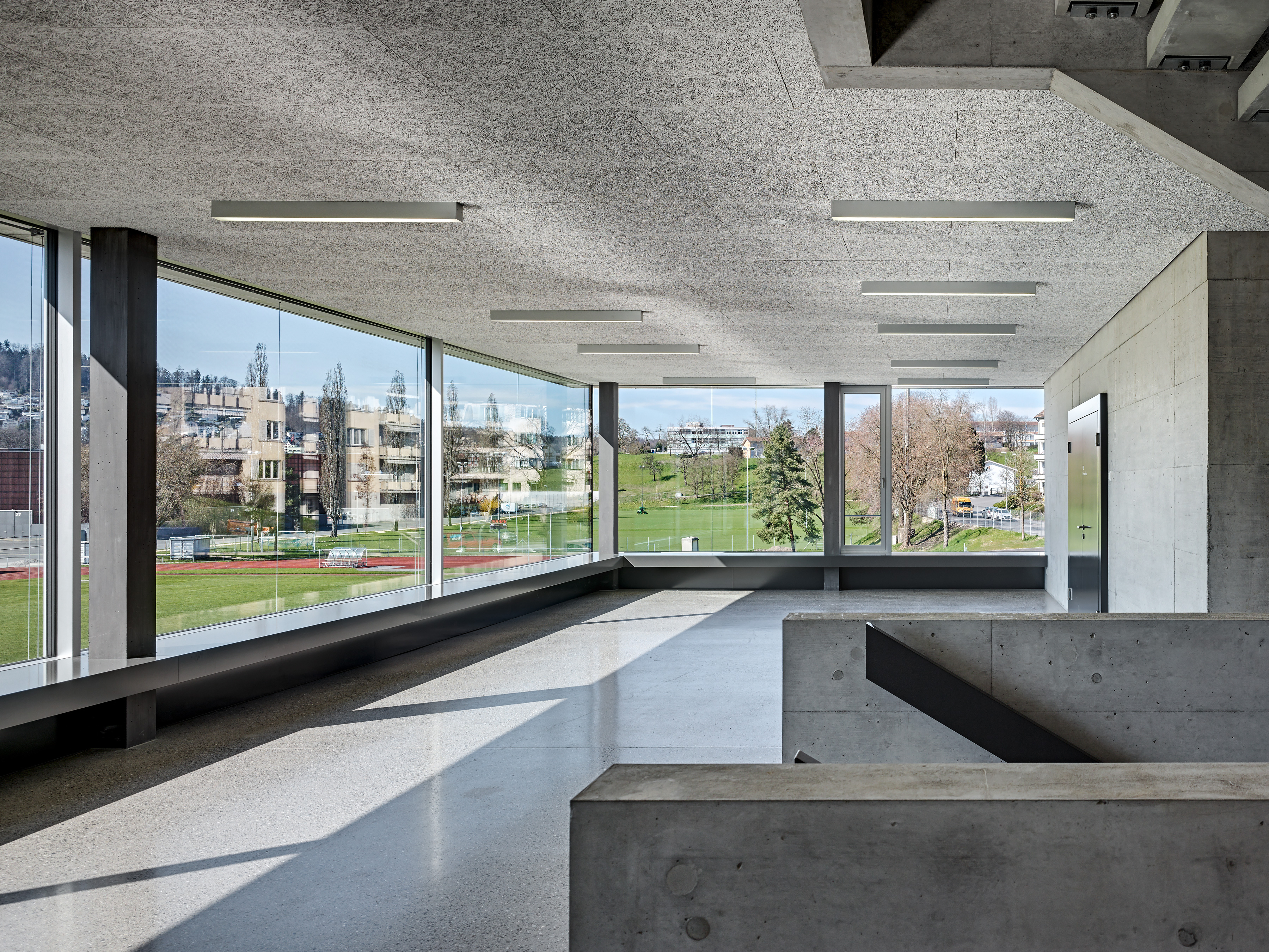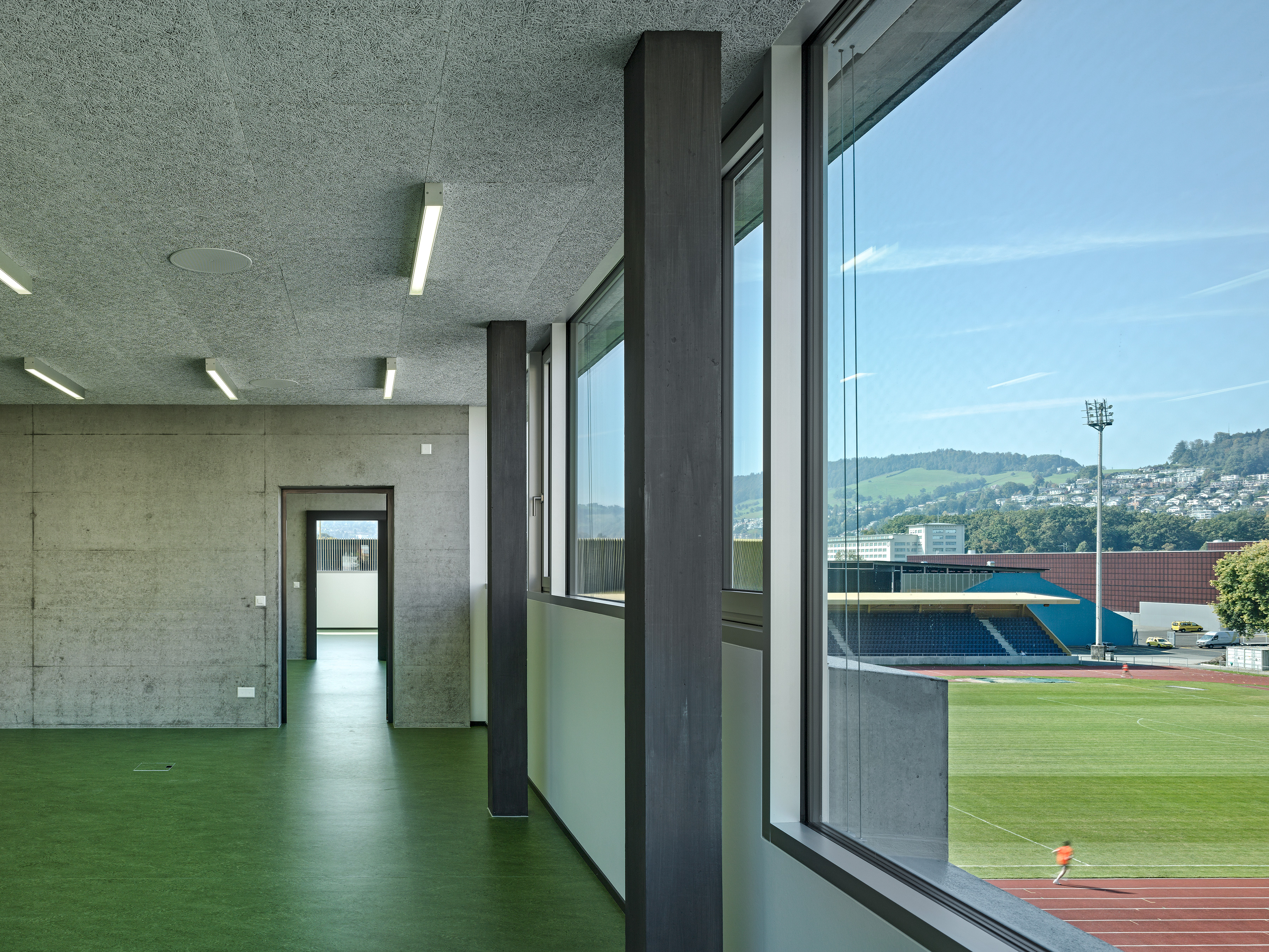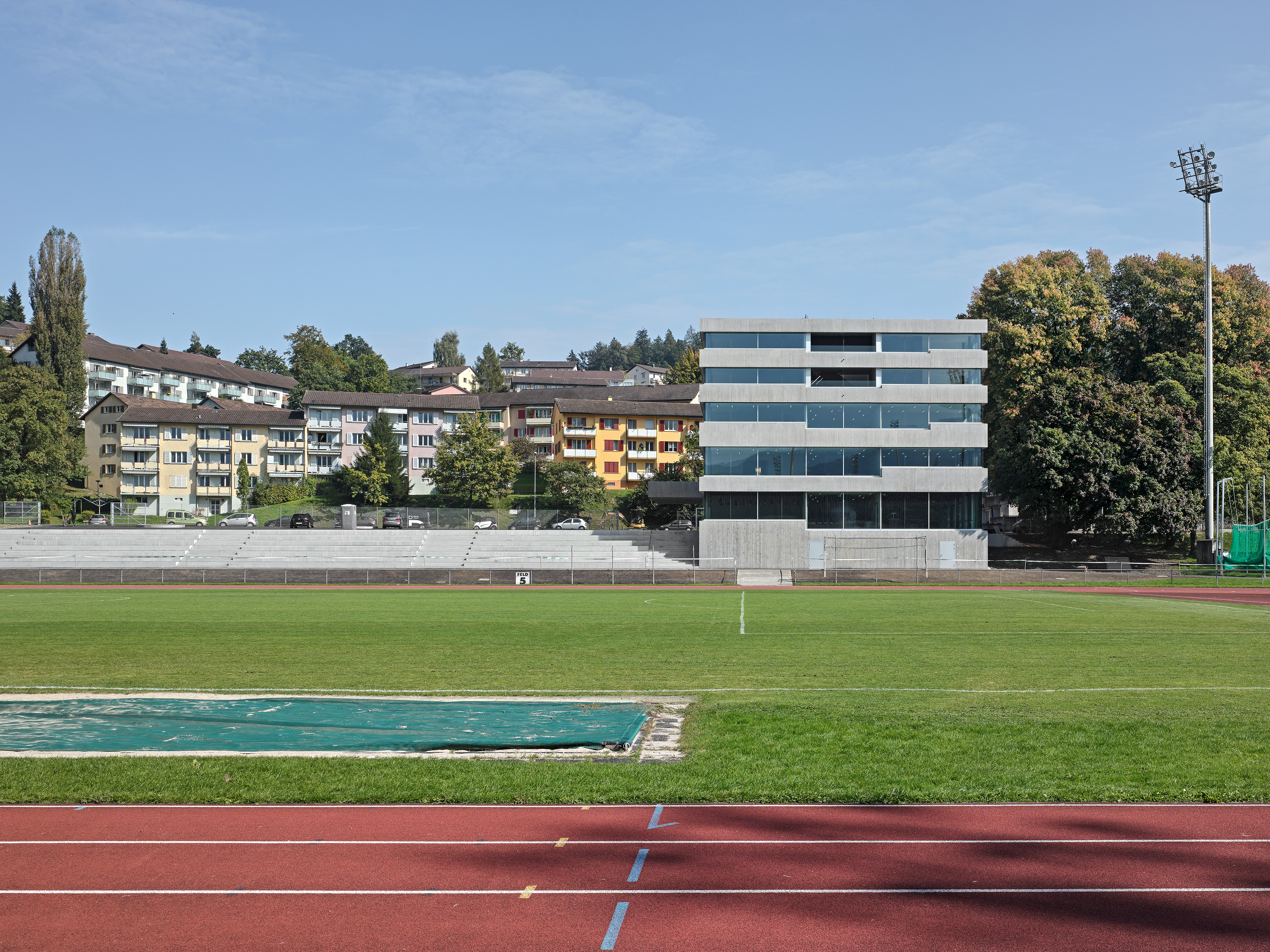 Der Standort der Pilatus Akademie liegt an der Hangkante zwischen dem Campus Allmend und dem Bireggquartiert. Der Ort veranschaulicht eine städtebauliche Schnittstelle. Während sich im Westen des Areals die Bauten der Swissporarena und die offen gestaltete Leichtathletikanlage ausbreiten, erhebt sich im Osten des Grundstückes ein klassisches Wohngebiet mit einer entsprechenden Baudichte. Eigenständig in sich ruhend steht die neue Pilatus Akademie am Fusse des Biregghanges. Das Projekt nutzt die Chance, ein prägnantes ortsbauliches Zeichen zu setzten, welches Bezüge zum unmittelbaren Kontext, aber auch zum weiträumigen Landschaftsraum aufbaut. Die im Bezug zu den Sportanlagen dezentrale Setzung lässt den ungerichteten Baukörper als flankierendes Element in Erscheinung treten. Der Bau vermittelt die Geste eines Beobachters. Die Leichtathletikbahn wird räumlich nicht gefasst, somit behält der Aussenraum seinen offenen Charakter. Die Anlage wird in ihrer Art gestärkt ohne eine abgeschlossene Stadionwirkung zu erzeugen. In Volumen und Ausdruck vermag die Akademie auf sensible Art und Weise zwischen den angrenzenden Gebieten zu vermitteln. Der grosszügiger Platz und die Freilufttribüne im Norden verankern den Baukörper mit der gewachsenen Topografie des Geländes.