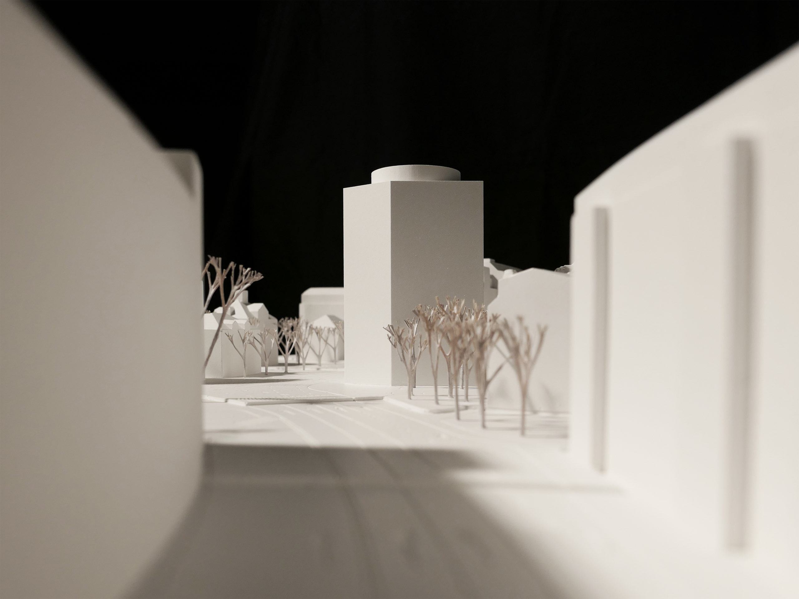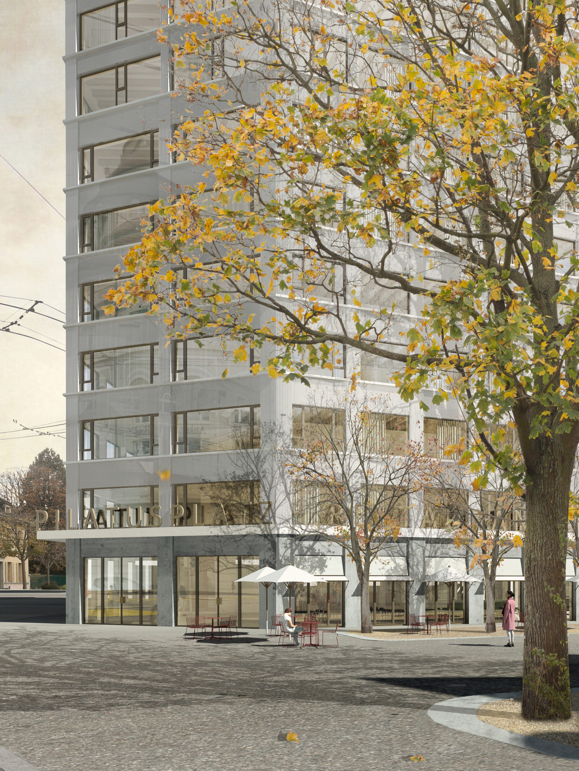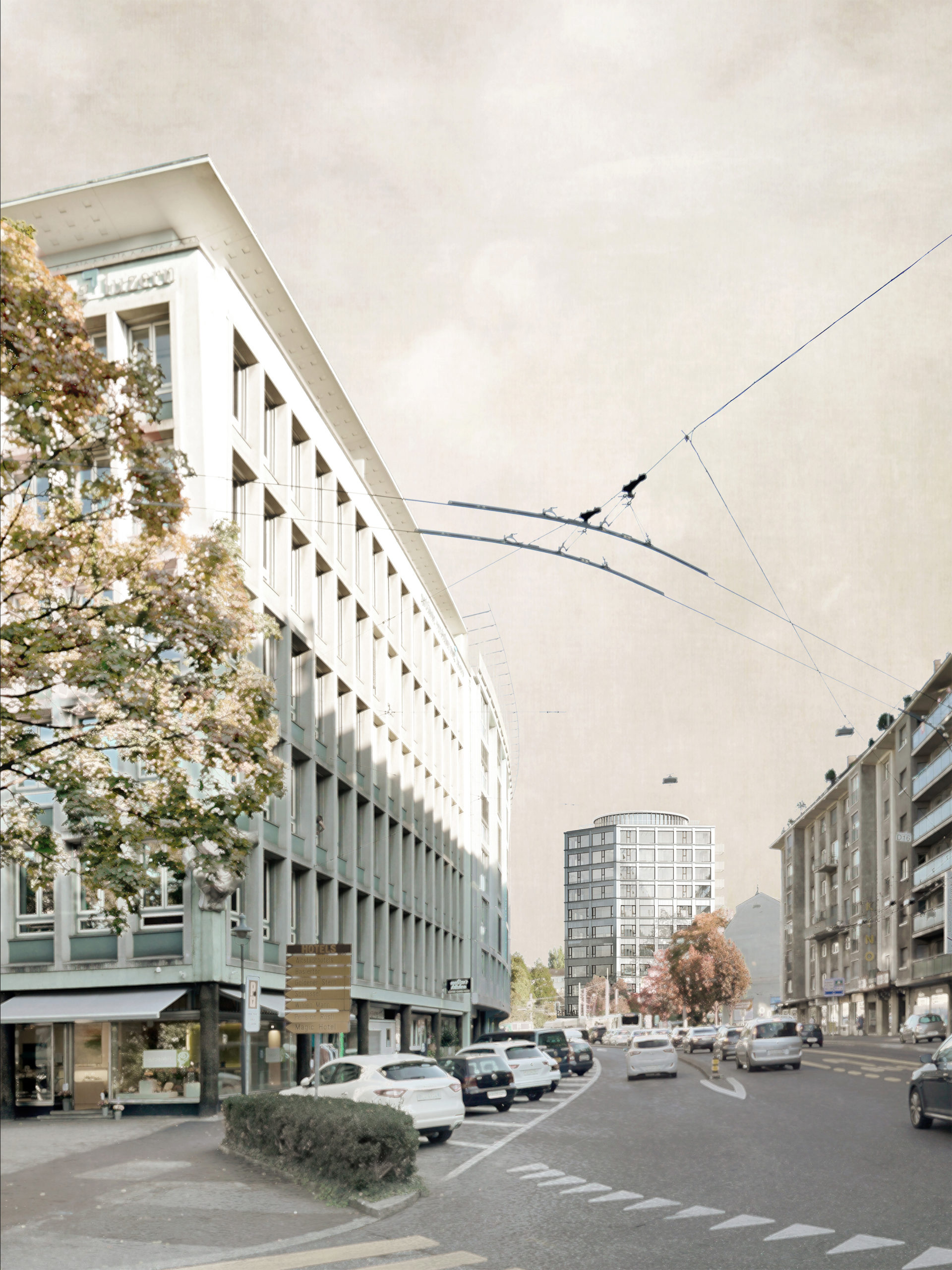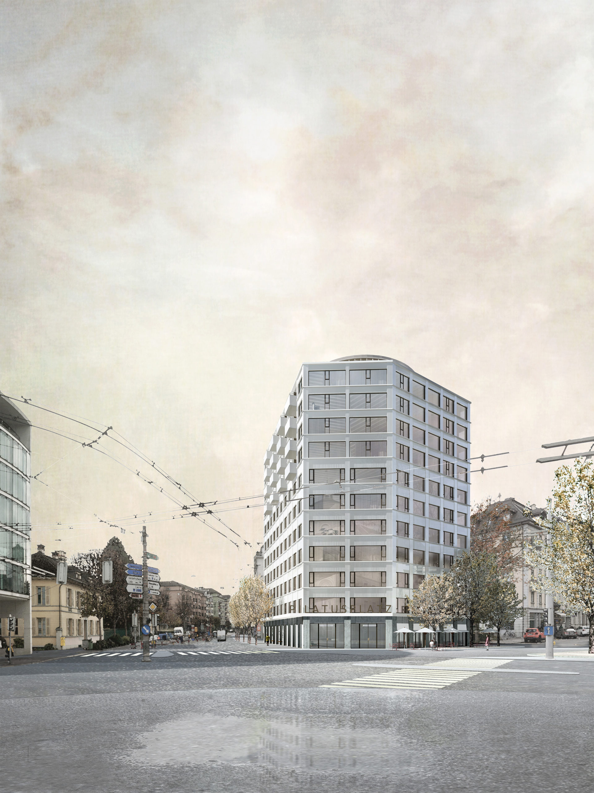 Mitten im Herzen der Stadt Luzern soll der geschichtsträchtige Ort am Pilatusplatz mit einem Wohn-und Geschäftshaus bebaut werden. Das Grundstück bildet die Schnittstelle von unterschiedlichen Stadträumen und spielt eine wichtige Rolle für die Gliederung dieser. Das Quartier ist im frühen 20. Jahrhundert entstanden, schachbrettartig aufgebaut und bestehend aus mehrgeschossigen Häuserzeilen. Die sechsgeschossigen Mietwohnungsblöcke der nahen Umgebung, mit ihren differenzierten auskragenden Balkonen, ihren Sockelgeschossen und steilen Mansardendächern, belegen den Internationalismus der Fremdenstadt. Mit grosszügigen Abständen zu den beiden angrenzenden Kopfbauten, fügt sich der Entwurf respektvoll entlang der Obergrundstrasse und der Pilatusstrasse ein. Das polygonale einfach geschnittene Volumen sucht die Analogie zu den klassischen ortsüblichen Geschäfts-und Wohnhäuser und versteht sich als Schlussstein des Gevierts. Mit 35 Meter Gebäudehöhe ragt der Neubau über die teppichartige Stadtlandschaft hinaus und verweist auf die wichtige Lage innerhalb der Neustadt. Die schlanke Hauptfassade, welche sich direkt zum Platz orientiert, gibt dem Ort eine neue unverwechselbare Identität. Der leichte Knick des Bauvolumens auf der Innenhofseite schafft einen Bezug zur Massstäblichkeit der Innenhofbauten und reagiert auf das nah stehende Riegelhaus. Der Abschluss des Gebäudes bildet das kreisförmige, ungerichtete Panoramageschoss im nördlichen Bereich des Baus. Ein klassischer und doch zeitgemässer Ausdruck prägt die Erscheinung des Entwurfs. Der wohlproportionierte, in allen Geschossen durchlaufende Raster ist dem Tragwerk in Holz geschuldet und strukturiert die Fassadeneinteilung. Ein massiver Sockel in Beton bildet die robuste Basis des Gebäudes. Die grosszügige Verglasung öffnet das Gebäude für die Öffentlichkeit und lässt den Pilatusplatz mit den Nutzungen des Erdgeschosses wie Restaurant und Läden miteinander verschmelzen.