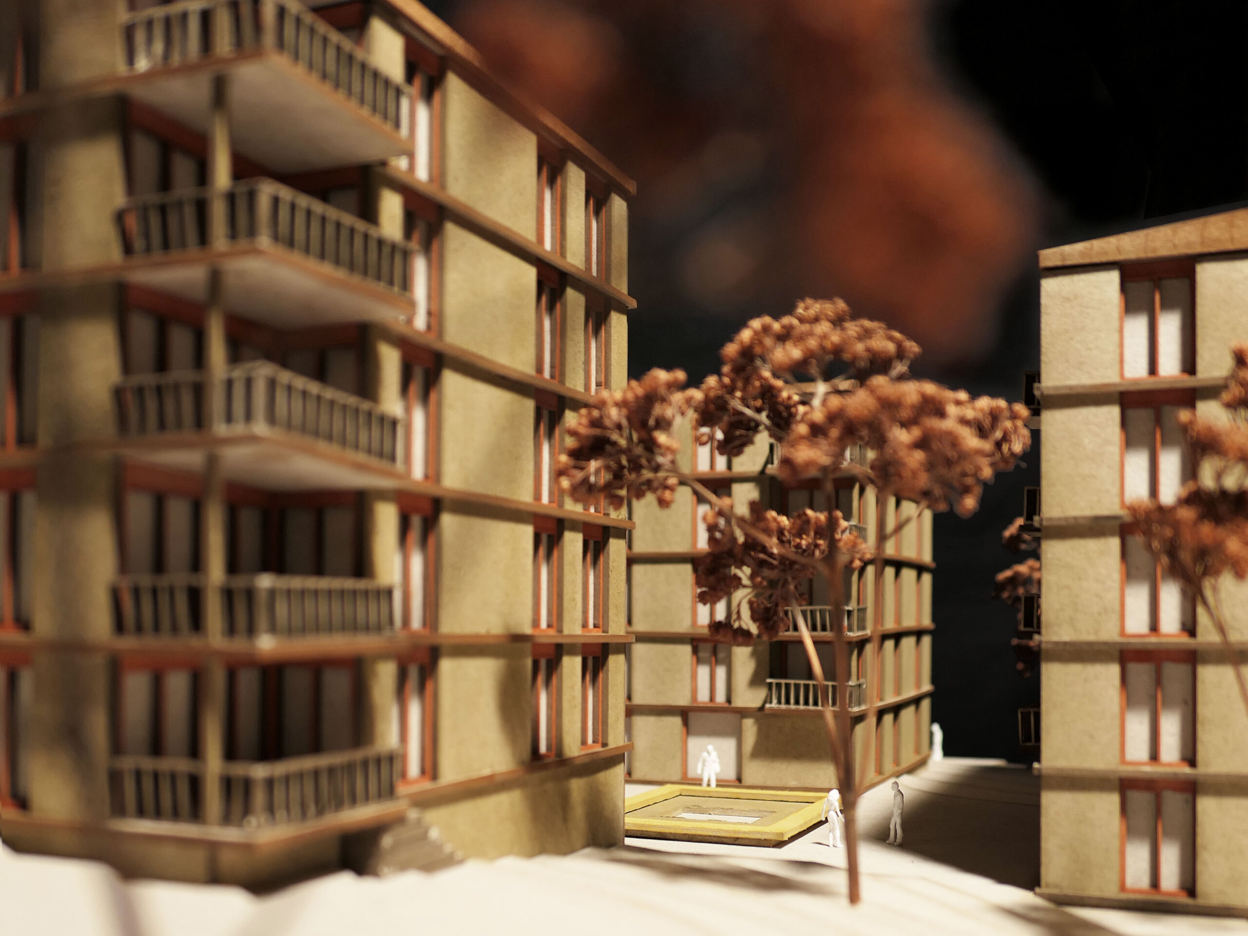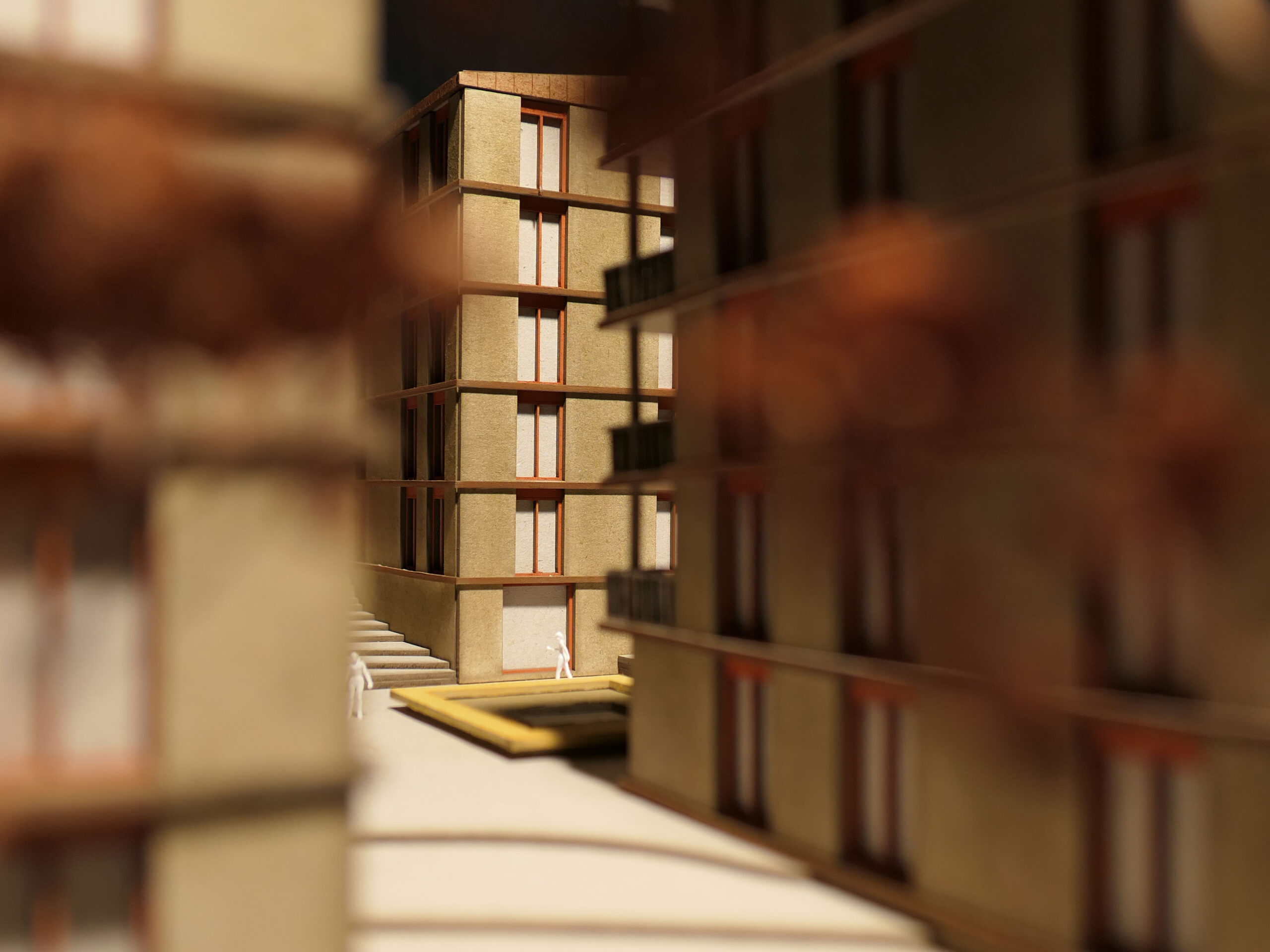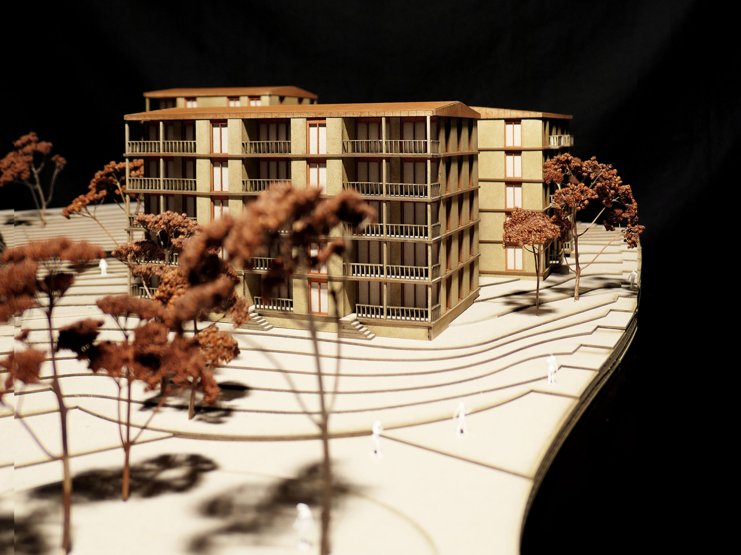 Die Gemeinde Inwil erstreckt sich vom Ausläufer des Lindenbergs, dem Inwilerberg bis zum Nordufer der Reuss und liegt zwischen Luzern und Zug. Inwil war bis in jüngster Zeit ein fast klassisches Strassendorf. Das Dorf zieht sich daher stark in die Länge, was jedoch dem Ortsbild keinen Abbruch tut, denn die Kirche unterbricht die Gerade auf eine harmonische Weise und verleiht dem Ortsbild eine seltene Qualität. Das Areal Schützenmatt ist ein zentrales Gebiet mit grosser Bedeutung für die künftige Entwicklung der Gemeinde, es liegt auf der Nordseite der Hauptstrasse zwischen dem historischen Dorfkern mit Pfarrkirche und der Schule im Osten. Das Projekt reagiert mit dreizehn Neubauten auf die Aufgabenstellung. Im Bereich der Hauptstrassse ergänzen drei viergeschossige Häuser und ein Ergänzungsbau den Bestand. Der Strassenraum wird stärker gefasst und belebt. Der hin zum Hang anschliessenden Grundstückflächen werden mit drei Gebäudegruppen à je drei Häuser bebaut. Eine übergordnetes Wegnetz trennt und verortet die einzelnen Inseln und verwebt das Areal mit der Nachbarschaft. Das Bebauungsmuster fügt sich zurückhaltend in die vorhandenen Strukturen ein, trägt der Verbindung zwischen der Hauptstrasse und dem Rütiquartier Rechnung und vermag respektvoll auf den Bachmannhof zu reagieren. Der städtebauliche Ansatz verfolgt eine Weiterentwicklung der heutigen Baustruktur mit spezifischen Punktbauten und den für historisch gewachsene Dorfkerne charakteristischen räumlichen Verdichtungen. Die zwei Hauptziele dabei sind die Schaffung von qualitativem Wohnraum und der Stärkung der Dorfkernzone durch die Verbindung von Kirche, Schulhaus und Dorfplatz. Der zentrale Platz, das übergeordnete Wegnetz und die halbprivaten, gefassten Plätze innerhalb der Gebäudegruppen schaffen für die Bewohner gute Begegnungsmöglichkeiten, stärken das nachbarschaftliche Umfeld und fördern das Dorfleben. Die Ausdrucksweise der ruhig wirkenden Bauten basieren auf jeweils längsrechteckigen Grundflächen und flach geneigten Satteldächern. Die Häuser sind in ihrer Höhenlage pragmatisch, der Hangneigung entsprechend disponierten und verfügen über ein teilweise erhöhtes Erdgeschoss. Diese werden über unterschiedlich lange Treppen mit den umgebenden Gartenflächen verwoben. Der vorgefundene Geist des Ortes wird mit einer äusseren Erscheinung aus Holz übersetzt. Geschossweise werden die Fassaden mit horizontalen Elementen konstruktiv geschützt und sind so langlebig und unterhaltsarm gestaltet. Raumhohe, zweiflüglige Fenstertüren mit vorgelagerten, feingliedrigen Staketengeländer aus Stahl bilden den Grundtypus der Fassadenöffnungen.