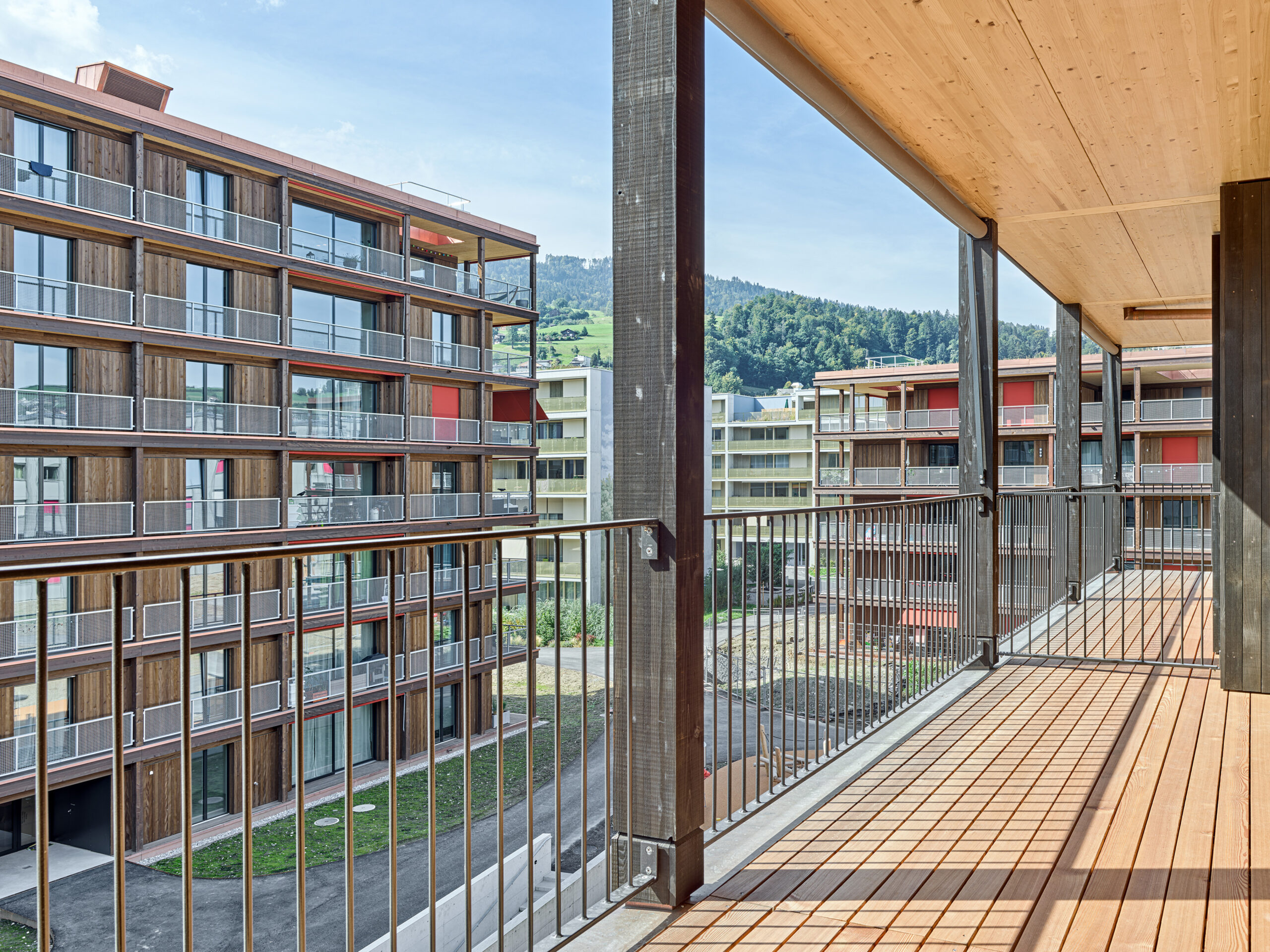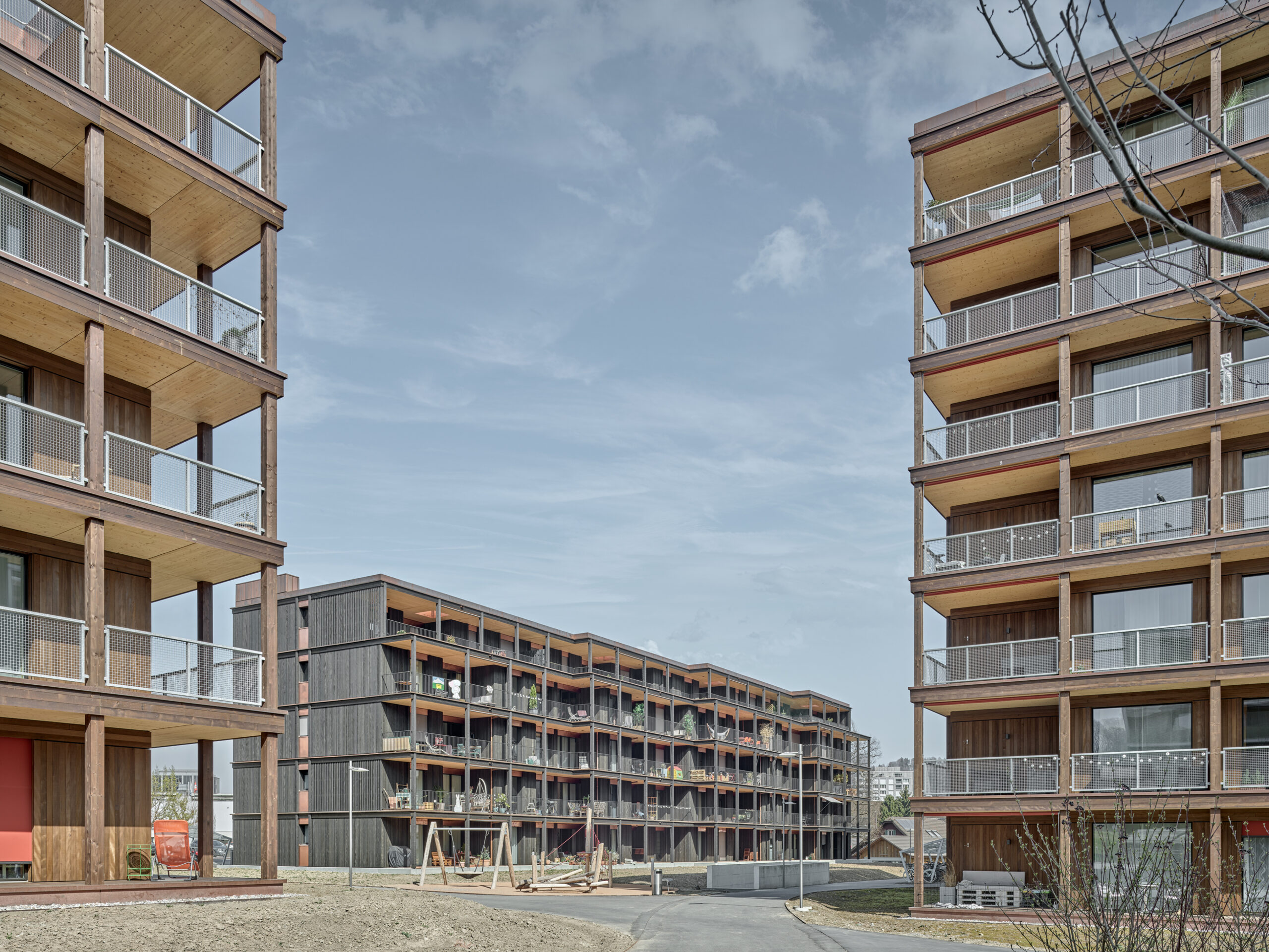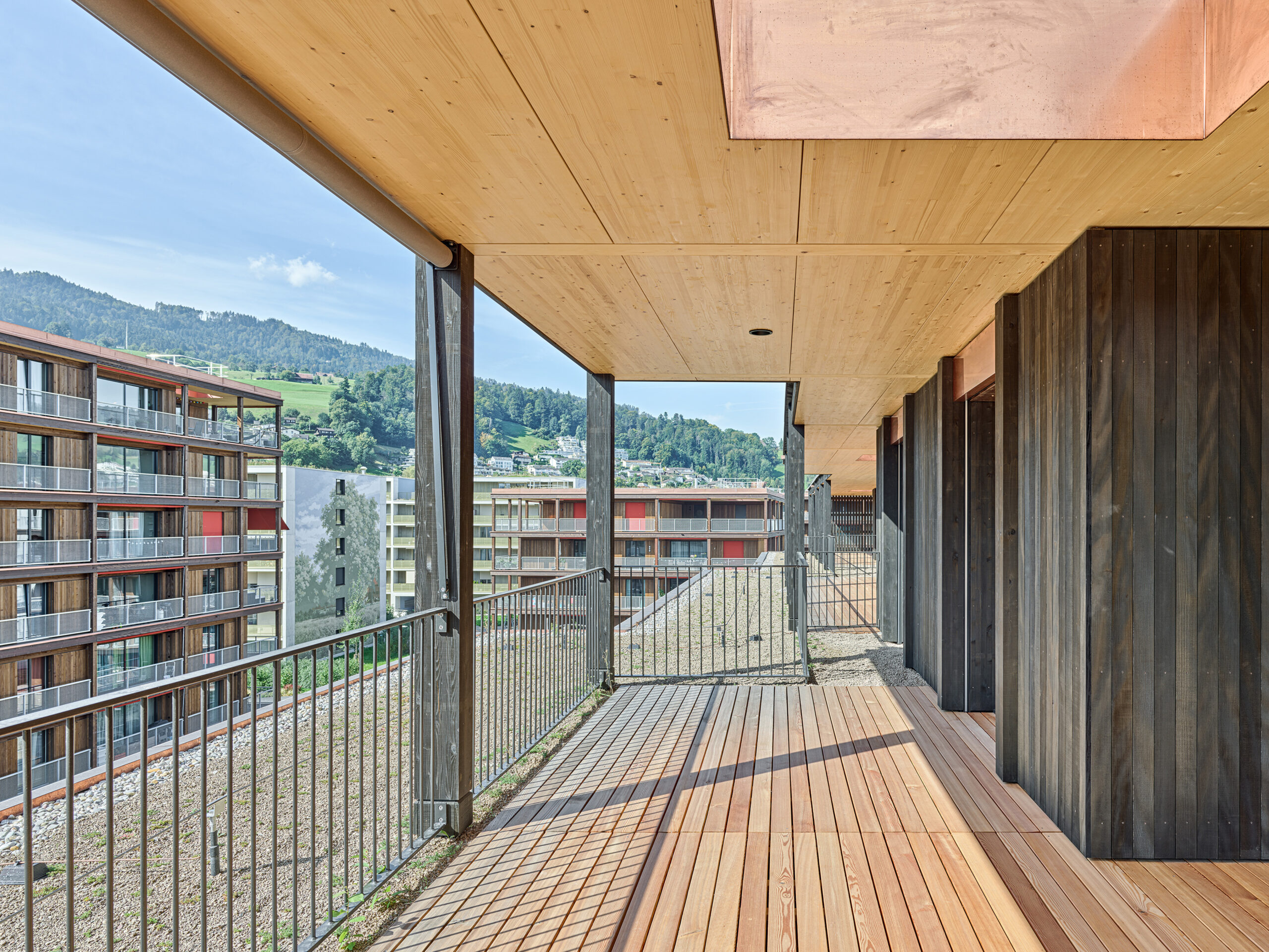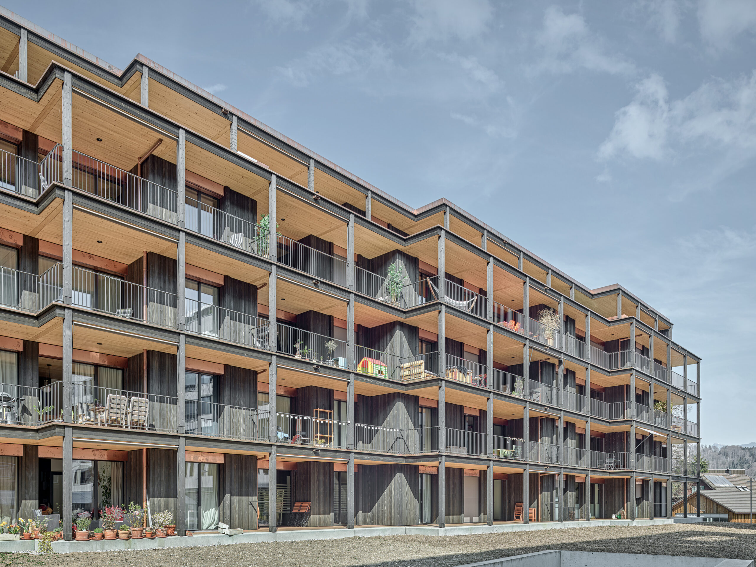 Im Süden Luzerns wächst ein neuer gemeindeübergreifender Lebensraum heran. Eingebettet zwischen Pilatus, Sonnenberg und Vierwaldstättersee bietet Luzern Süd hohe Lebensqualität und ein vielfältiges Angebot. Zwischen Kriens, Horw und Luzern entstehen sechs urbane Gebiete. Eines dieser Gebiete ist das Schweighofareal. Der Bau der Schweighofpark AG ist als Siedlungsabschluss formuliert und bildet sowohl den schützenden Rücken des Areals als auch einen angemessenes Gesicht zur Horwerstrasse. Das Gebäude ist gegen Süden hin zum Siedlungsinternen Grünraum orientiert und flankiert im Norden die Ränder der Anlage. Die im Gestaltungsplan vorgeschlagene Volumetrie von zwei zusammengeschobenen, versetzten Baukörpern wird mit einzelnen Gebäudeversätzen ergänzt und somit verändert. Die organisatorische Basiseinheit bildet ein Grundriss mit drei Wohnungen pro Geschoss. Während jeweils die mittlere Wohnung nur gegen Südwesten orientiert ist, werden die beiden flankierenden Durchwohntypen zweiseitig orientiert. Ein von Fassade zu Fassade durchgehender Hauptraum bildet das Zentrum der Einheiten. Den Räumen vorgelagert bildet die signifikante Verandaschicht das Herzstück der Wohnungen. Jedes Südzimmer verfügt über einen Zugang zum vorgelagerten Aussensitzplatz. Mit der Terrassenschicht wird neben einem Schutz der Fassade ein Filter geschaffen, der die Nähe der Bauten legitimiert und der Privatheit der Einheiten dient. Der Bau der Schweighofpark AG ist als reiner Holzbau ausgeführt. Die Veranden sind den Volumen südseitig vorgesetzt und verkleiden diese mit horizontalen Balkonstirnen und filigranen Stützen. Die umlaufenden Deckenstirnen verbinden das Gebäude mit der Veranda. Von den Veranden zurückversetzt bilden dunkle Fassadenteile aus Holz, Kupferelemente und hochgestellte Türen und Fenster die ruhige und elegante Gebäudehülle.