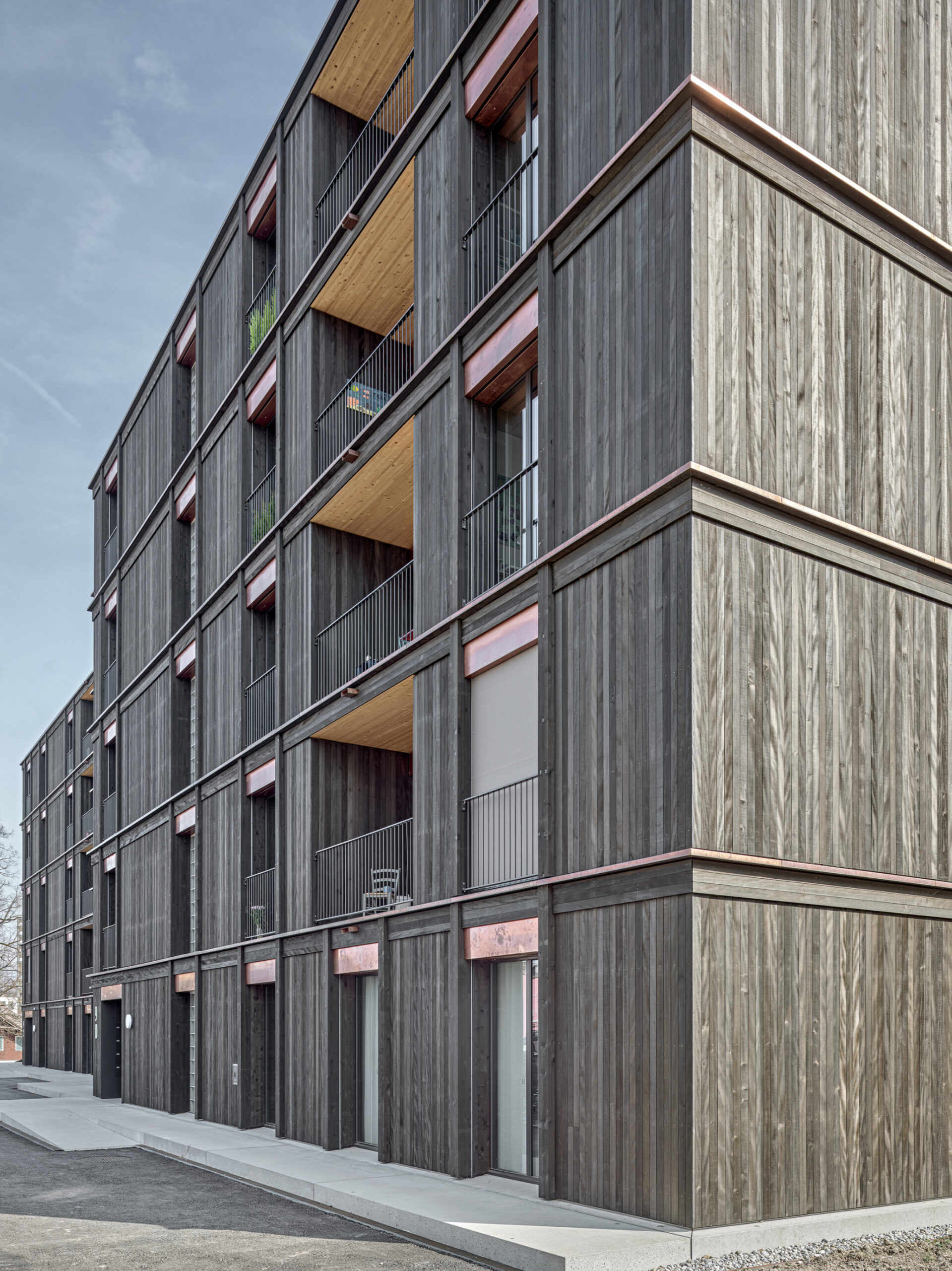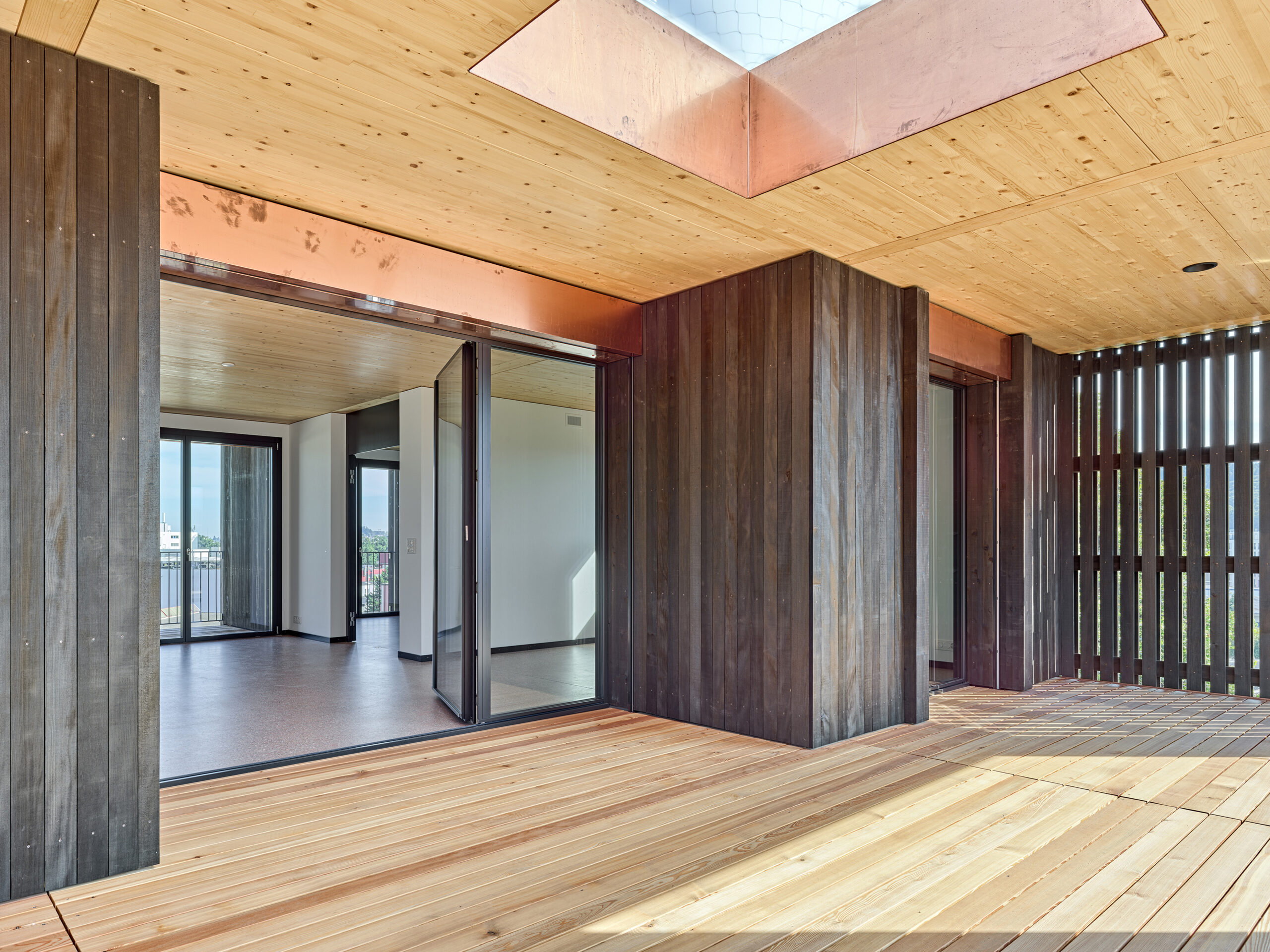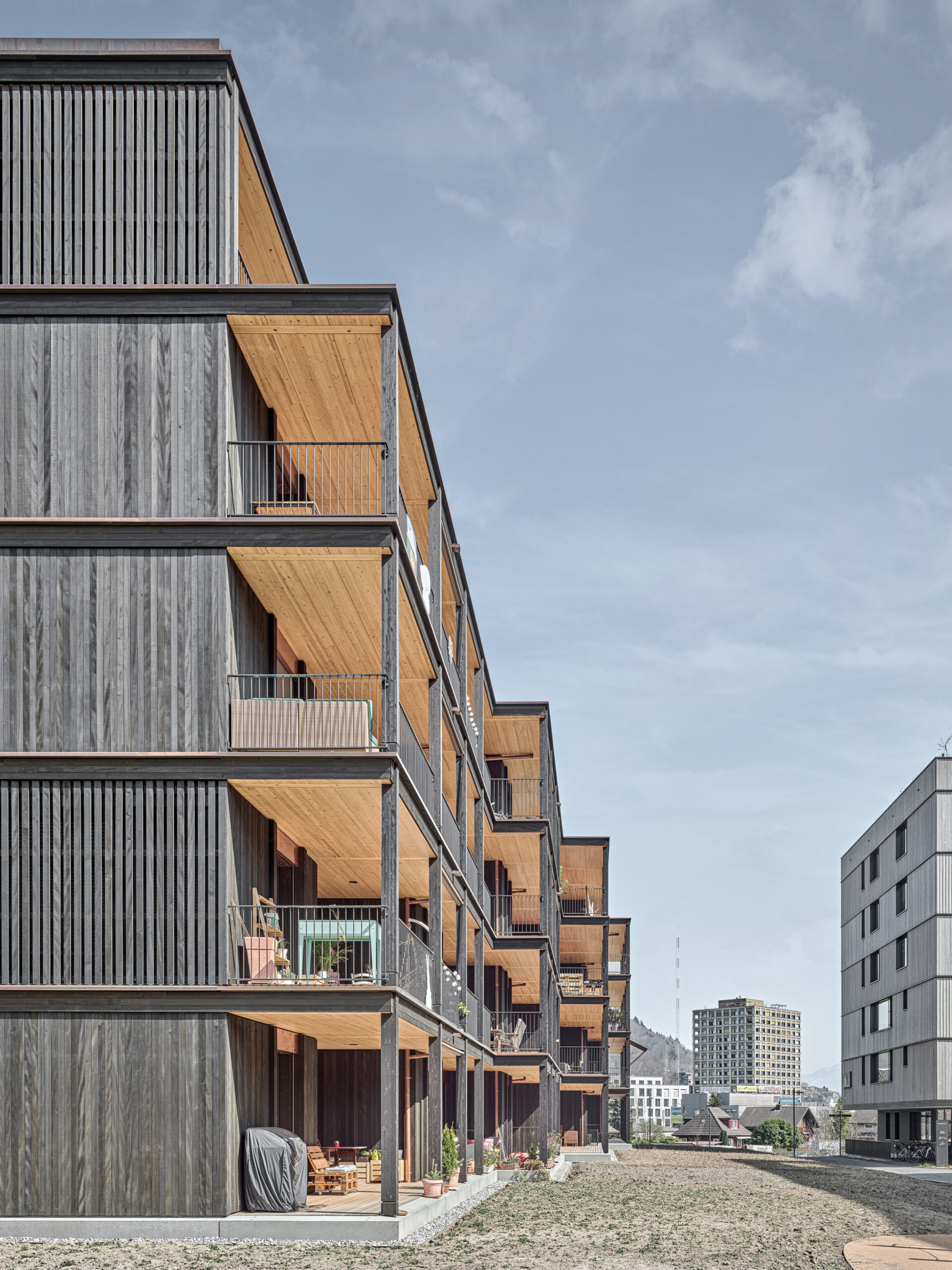 Im Süden Luzerns wächst ein neuer gemeindeübergreifender Lebensraum heran. Eingebettet zwischen Pilatus, Sonnenberg und Vierwaldstättersee bietet Luzern Süd hohe Lebensqualität und ein vielfältiges Angebot. Zwischen Kriens, Horw und Luzern entstehen sechs urbane Gebiete. Eines dieser Gebiete ist das Schweighofareal. Der Bau der Schweighofpark AG ist als Siedlungsabschluss formuliert und bildet sowohl den schützenden Rücken des Areals als auch einen angemessenes Gesicht zur Horwerstrasse. Das Gebäude ist gegen Süden hin zum Siedlungsinternen Grünraum orientiert und flankiert im Norden die Ränder der Anlage. Die im Gestaltungsplan vorgeschlagene Volumetrie von zwei zusammengeschobenen, versetzten Baukörpern wird mit einzelnen Gebäudeversätzen ergänzt und somit verändert. Die organisatorische Basiseinheit bildet ein Grundriss mit drei Wohnungen pro Geschoss. Während jeweils die mittlere Wohnung nur gegen Südwesten orientiert ist, werden die beiden flankierenden Durchwohntypen zweiseitig orientiert. Ein von Fassade zu Fassade durchgehender Hauptraum bildet das Zentrum der Einheiten. Den Räumen vorgelagert bildet die signifikante Verandaschicht das Herzstück der Wohnungen. Jedes Südzimmer verfügt über einen Zugang zum vorgelagerten Aussensitzplatz. Mit der Terrassenschicht wird neben einem Schutz der Fassade ein Filter geschaffen, der die Nähe der Bauten legitimiert und der Privatheit der Einheiten dient. Der Bau der Schweighofpark AG ist als reiner Holzbau ausgeführt. Die Veranden sind den Volumen südseitig vorgesetzt und verkleiden diese mit horizontalen Balkonstirnen und filigranen Stützen. Die umlaufenden Deckenstirnen verbinden das Gebäude mit der Veranda. Von den Veranden zurückversetzt bilden dunkle Fassadenteile aus Holz, Kupferelemente und hochgestellte Türen und Fenster die ruhige und elegante Gebäudehülle.