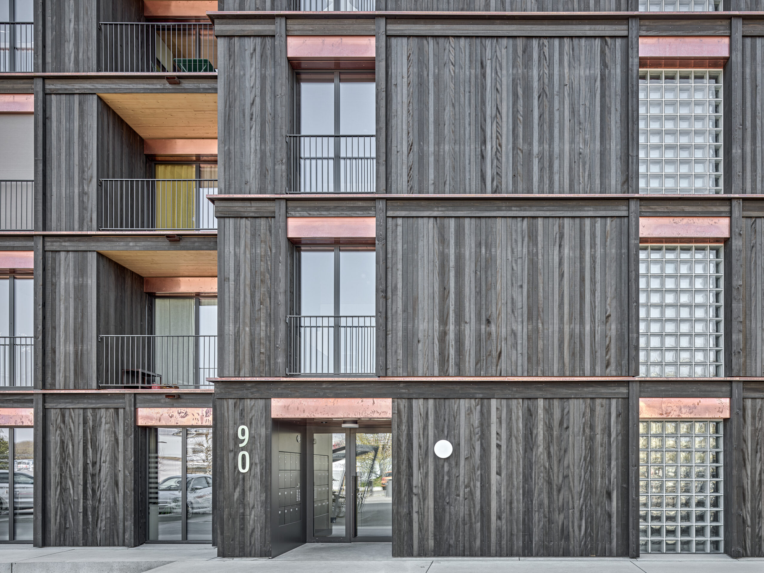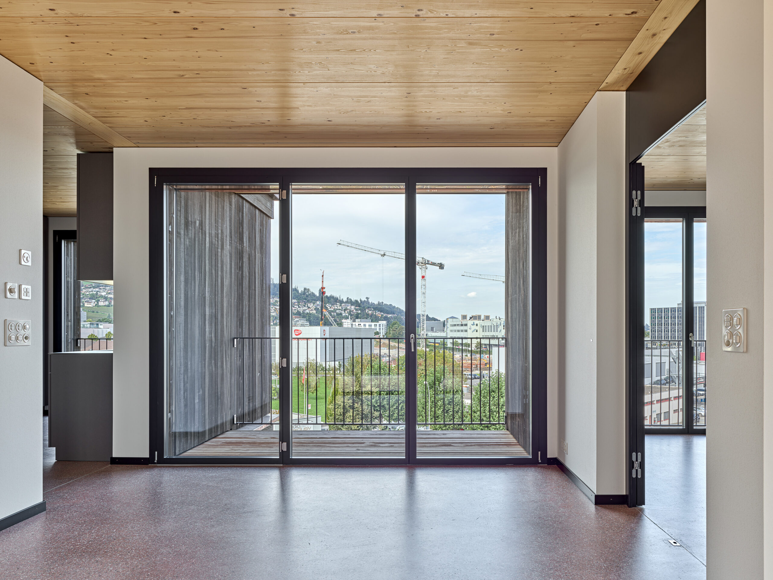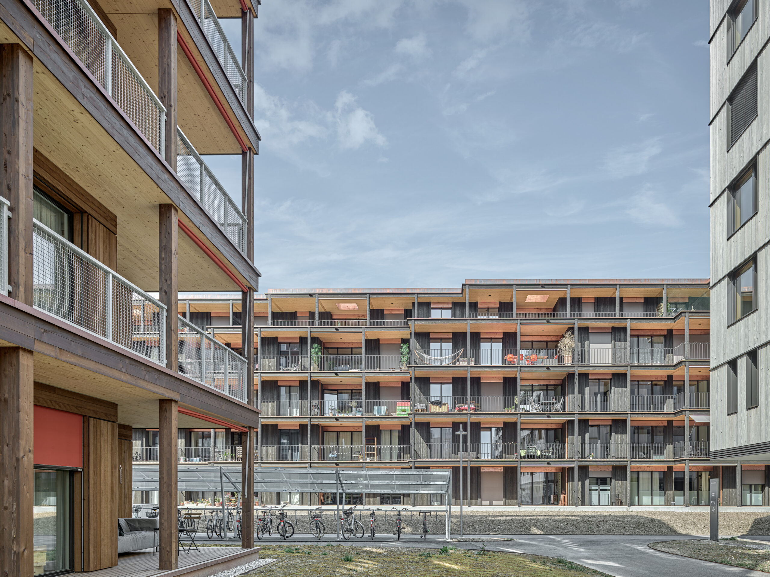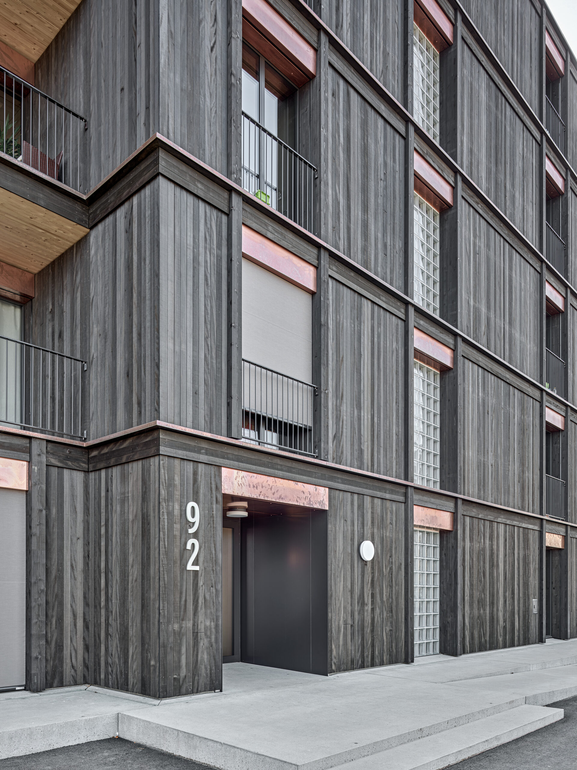 Im Süden Luzerns wächst ein neuer gemeindeübergreifender Lebensraum heran. Eingebettet zwischen Pilatus, Sonnenberg und Vierwaldstättersee bietet Luzern Süd hohe Lebensqualität und ein vielfältiges Angebot. Zwischen Kriens, Horw und Luzern entstehen sechs urbane Gebiete. Eines dieser Gebiete ist das Schweighofareal. Der Bau der Schweighofpark AG ist als Siedlungsabschluss formuliert und bildet sowohl den schützenden Rücken des Areals als auch einen angemessenes Gesicht zur Horwerstrasse. Das Gebäude ist gegen Süden hin zum Siedlungsinternen Grünraum orientiert und flankiert im Norden die Ränder der Anlage. Die im Gestaltungsplan vorgeschlagene Volumetrie von zwei zusammengeschobenen, versetzten Baukörpern wird mit einzelnen Gebäudeversätzen ergänzt und somit verändert. Die organisatorische Basiseinheit bildet ein Grundriss mit drei Wohnungen pro Geschoss. Während jeweils die mittlere Wohnung nur gegen Südwesten orientiert ist, werden die beiden flankierenden Durchwohntypen zweiseitig orientiert. Ein von Fassade zu Fassade durchgehender Hauptraum bildet das Zentrum der Einheiten. Den Räumen vorgelagert bildet die signifikante Verandaschicht das Herzstück der Wohnungen. Jedes Südzimmer verfügt über einen Zugang zum vorgelagerten Aussensitzplatz. Mit der Terrassenschicht wird neben einem Schutz der Fassade ein Filter geschaffen, der die Nähe der Bauten legitimiert und der Privatheit der Einheiten dient. Der Bau der Schweighofpark AG ist als reiner Holzbau ausgeführt. Die Veranden sind den Volumen südseitig vorgesetzt und verkleiden diese mit horizontalen Balkonstirnen und filigranen Stützen. Die umlaufenden Deckenstirnen verbinden das Gebäude mit der Veranda. Von den Veranden zurückversetzt bilden dunkle Fassadenteile aus Holz, Kupferelemente und hochgestellte Türen und Fenster die ruhige und elegante Gebäudehülle.
