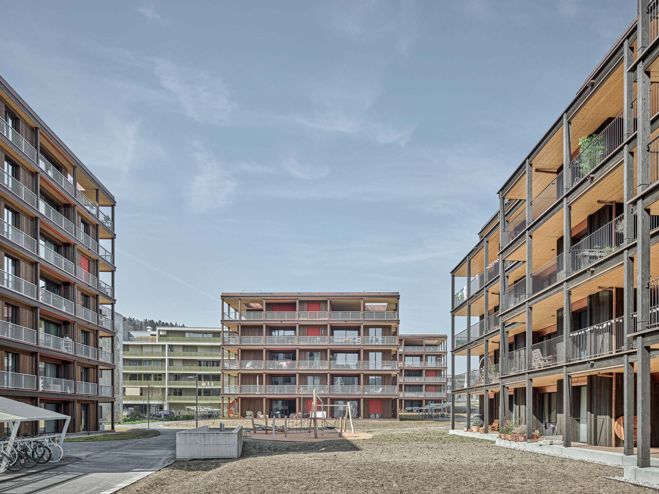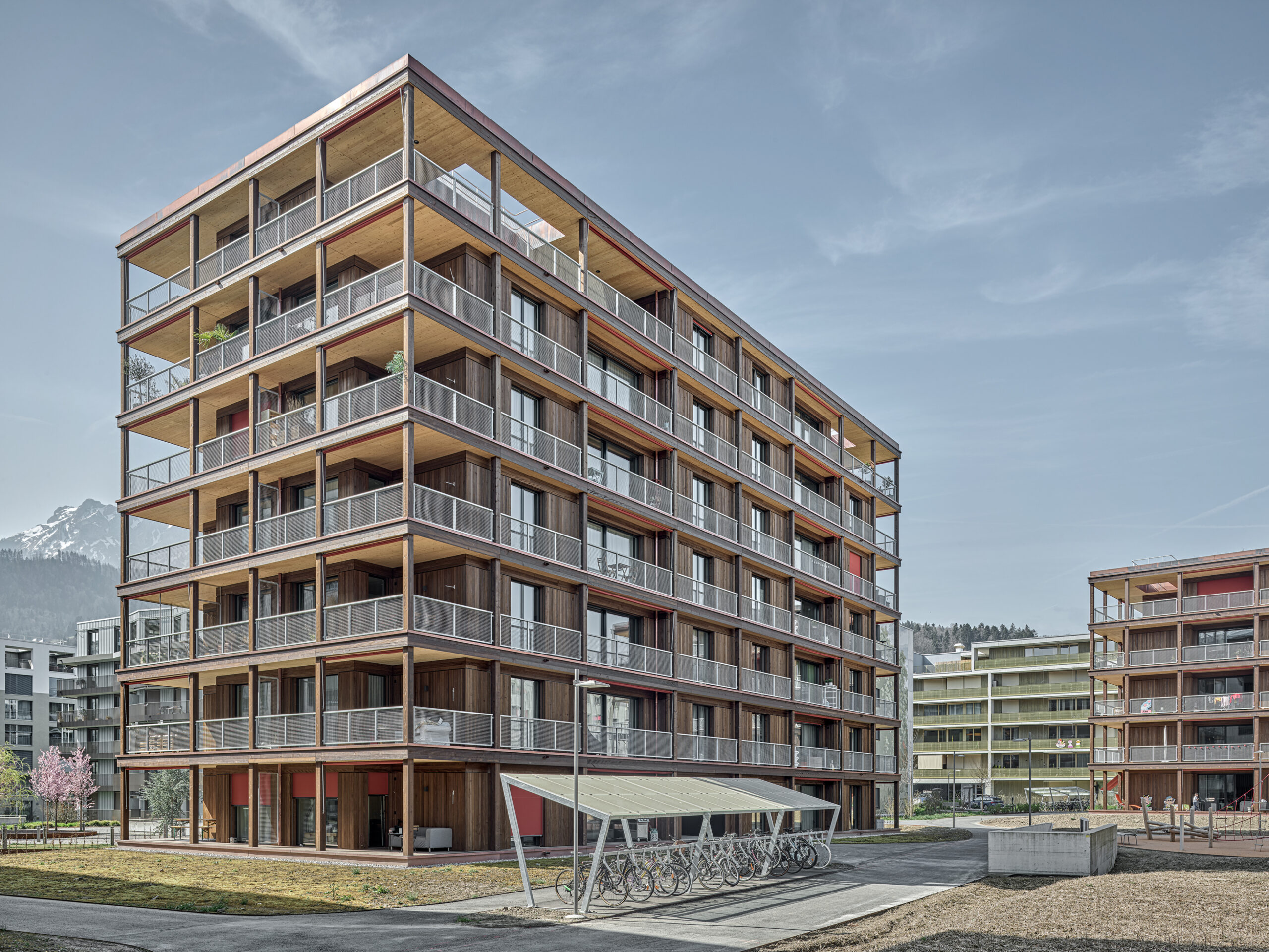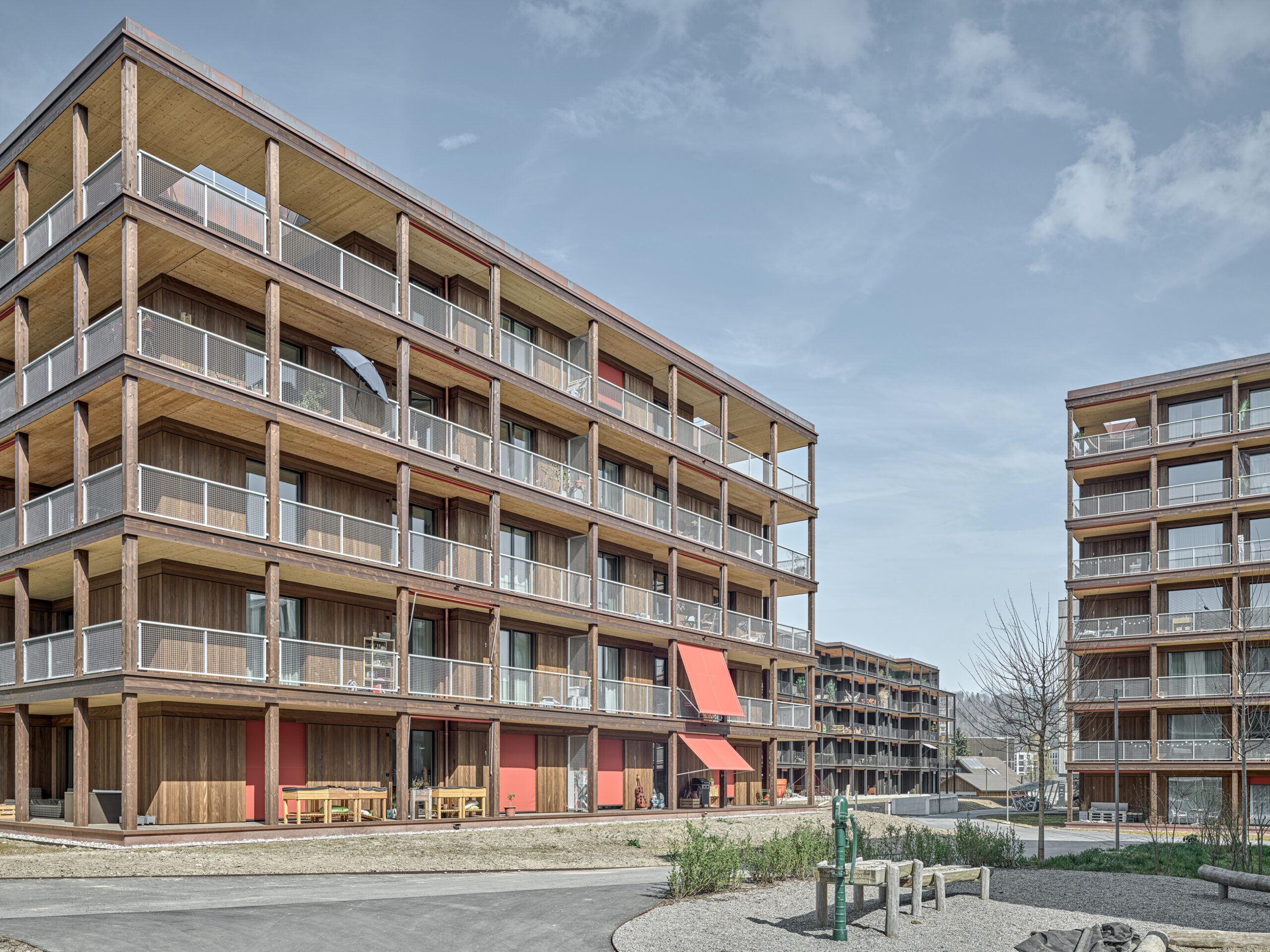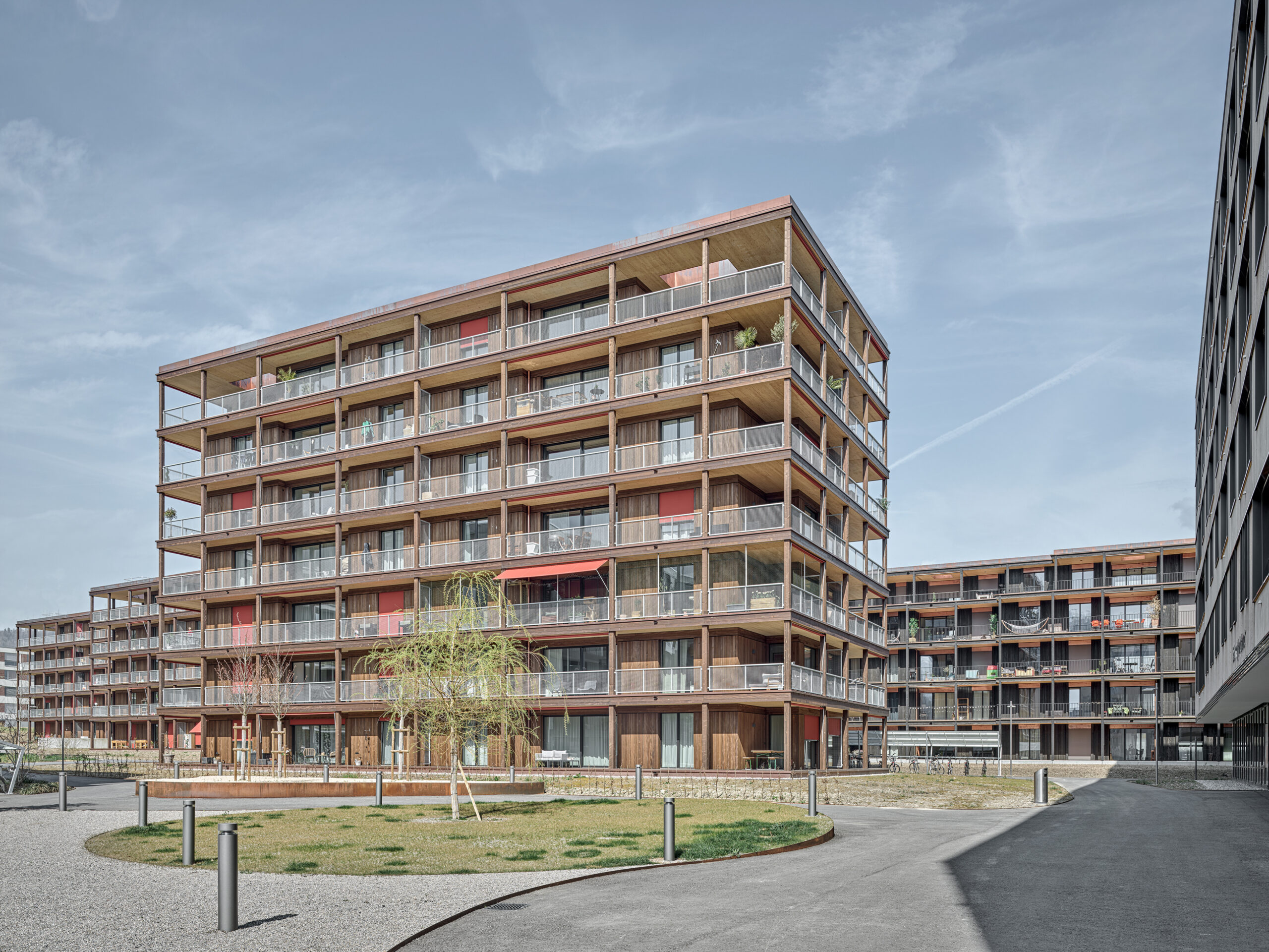 Im Süden Luzerns wächst ein neuer gemeindeübergreifender Lebensraum heran. Eingebettet zwischen Pilatus, Sonnenberg und Vierwaldstättersee bietet Luzern Süd hohe Lebensqualität und ein vielfältiges Angebot. Zwischen Kriens, Horw und Luzern entstehen sechs urbane Gebiete. Eines dieser Gebiete ist das Schweighofareal. Die drei Baufelder der Stiftung St. Anna liegen im Zentrum der Anlage und reagieren mit einem allseitig offenen Charakter auf die spezifische Lage innerhalb der Siedlung. Die versetze, richtungslose Anordnung lässt die einzelnen Bauten von allseitig qualitativen Räumen profitieren und offene Ecken fördern die Quertransparenz innerhalb der Siedlung. Die strukturelle Vierteilung der Grundrissflächen erfolgt mit dem zentralen Treppenhaus, jeweils einem, beziehungsweise zwei Zimmern an den Fassaden und den dazwischenliegenden Nebenräumen. Die so gewonnenen vier Hauptwohnräume sind jeweils an den Gebäudeecken disponiert. Den Räumen vorgelagert bildet die signifikante Verandenschicht das Herzstück der Wohnungen. Jedes Zimmer verfügt über einen Zugang zum vorgelagerten Aussensitzplatz womit die Vielfalt der internen Wegführung erheblich gesteigert wird. Mit der umlaufenden Terrassenschicht wird neben einem hervorragenden Schutz der Fassade auch ein Filter geschaffen, der die Nähe der Bauten legitimiert und der Privatheit und Autonomie der Einheiten dient. Die Bauten der St. Anna Stiftung treten als massgeschneiderte Holzbauten in Erscheinung. Die der übergeordneten Idee des hohen Wohnwertes verpflichteten Veranden sind den Volumen vorgesetzt und verkleiden diese mit horizontalen Balkonstirnen und filigranen Stützen. Von den Veranden zurückversetzt bilden stehende Fassadenteile aus Holz und hochgestellten Türen und Fenster eine zurückhaltende, funktionale Gebäudehülle.