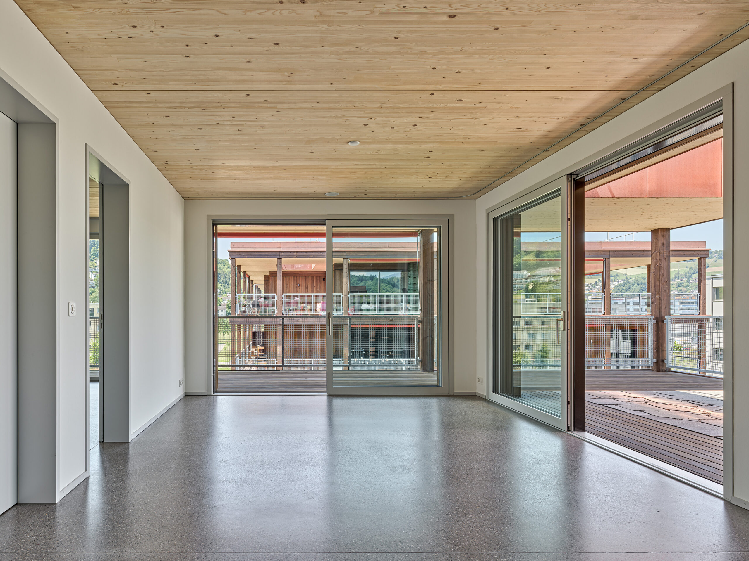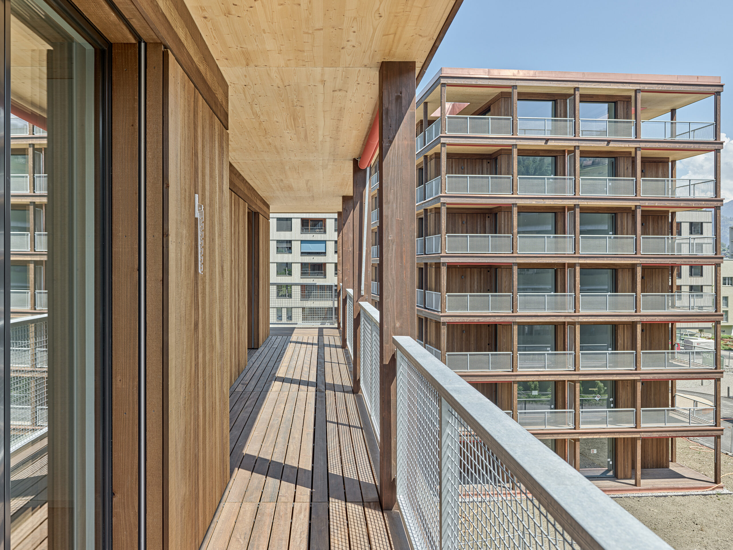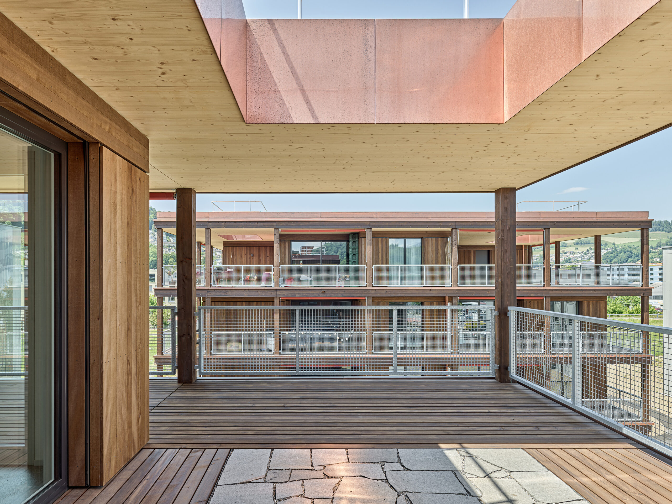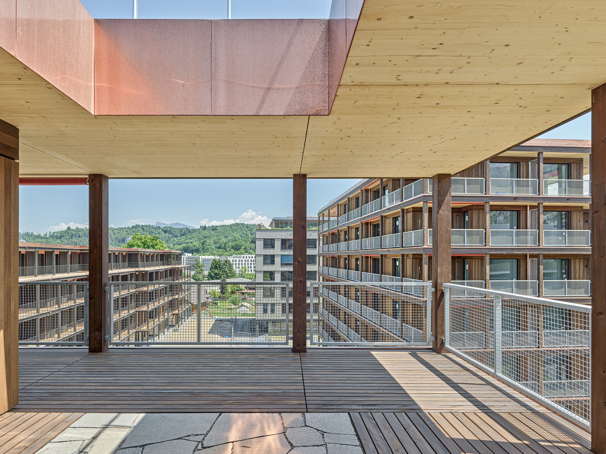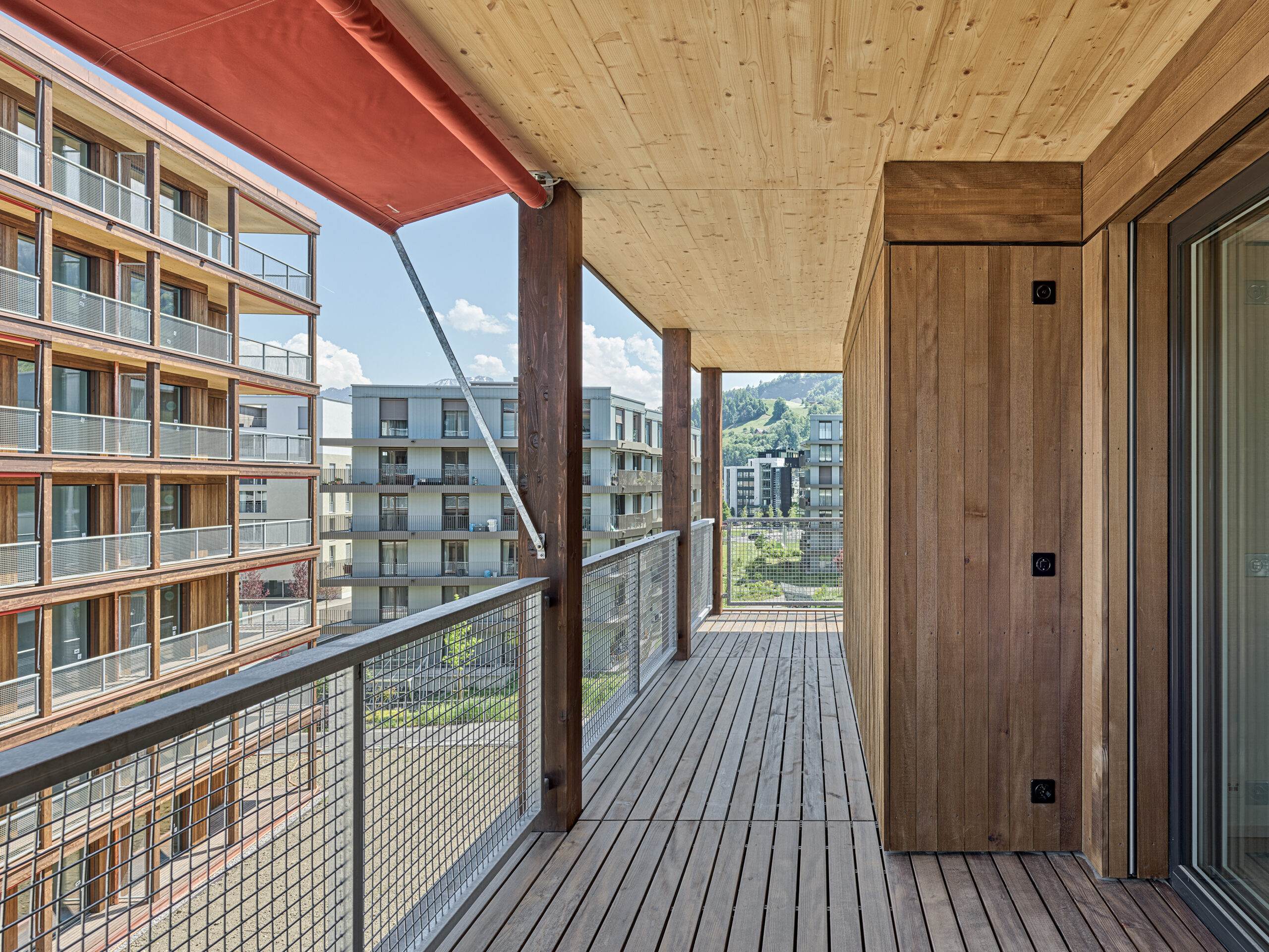 Im Süden Luzerns wächst ein neuer gemeindeübergreifender Lebensraum heran. Eingebettet zwischen Pilatus, Sonnenberg und Vierwaldstättersee bietet Luzern Süd hohe Lebensqualität und ein vielfältiges Angebot. Zwischen Kriens, Horw und Luzern entstehen sechs urbane Gebiete. Eines dieser Gebiete ist das Schweighofareal. Die drei Baufelder der Stiftung St. Anna liegen im Zentrum der Anlage und reagieren mit einem allseitig offenen Charakter auf die spezifische Lage innerhalb der Siedlung. Die versetze, richtungslose Anordnung lässt die einzelnen Bauten von allseitig qualitativen Räumen profitieren und offene Ecken fördern die Quertransparenz innerhalb der Siedlung. Die strukturelle Vierteilung der Grundrissflächen erfolgt mit dem zentralen Treppenhaus, jeweils einem, beziehungsweise zwei Zimmern an den Fassaden und den dazwischenliegenden Nebenräumen. Die so gewonnenen vier Hauptwohnräume sind jeweils an den Gebäudeecken disponiert. Den Räumen vorgelagert bildet die signifikante Verandenschicht das Herzstück der Wohnungen. Jedes Zimmer verfügt über einen Zugang zum vorgelagerten Aussensitzplatz womit die Vielfalt der internen Wegführung erheblich gesteigert wird. Mit der umlaufenden Terrassenschicht wird neben einem hervorragenden Schutz der Fassade auch ein Filter geschaffen, der die Nähe der Bauten legitimiert und der Privatheit und Autonomie der Einheiten dient. Die Bauten der St. Anna Stiftung treten als massgeschneiderte Holzbauten in Erscheinung. Die der übergeordneten Idee des hohen Wohnwertes verpflichteten Veranden sind den Volumen vorgesetzt und verkleiden diese mit horizontalen Balkonstirnen und filigranen Stützen. Von den Veranden zurückversetzt bilden stehende Fassadenteile aus Holz und hochgestellten Türen und Fenster eine zurückhaltende, funktionale Gebäudehülle.
