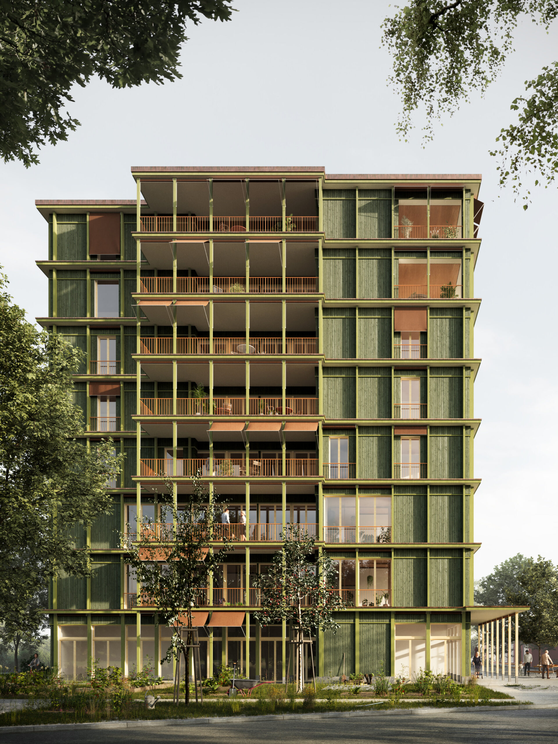 Das auf einer kleinen Gebäudegrundfläche ruhende achtgeschossige Wohnhaus ist inmitten einer üppigen Umgebung platziert. Durch den Verzicht eines Sockels wird sowohl einer klassischen Wohnhaustypologie entsprochen, als auch einem grosszügigen Umraum Rechnung getragen. Mit Piazza, Hof, Intensivgarten und Wohngarten flankieren vier spezifische Freiräume das Haus. Orte mit unterschiedlichen Qualitäten und differenzierten Öffentlichkeitgraden entstehen. Am Übergang zwischen Piazza und Hof befindet sich der neue Gartenpavillon der Anlage. Das Gebäudevolumen wird mit einzelnen, aus der Logik der inneren Organisation entwickelten Fassadenversätzen gegliedert. Die an den Stirnseiten positionierten, jeweils übereinander gestapelten Aussensitzplätze charakterisieren die Seitenfassaden und verweben sich mit den vorgelagerten Freiräumen. Vertikal wird das Haus in drei Bestandteile gegliedert: Das öffentliche Erdgeschoss bildet den Gebäudesockel, das 1. und das 2. Obergeschoss bilden die Belle Etage und das 3. bis 7. Obergeschoss den Hauptteil des Gebäudes. Das in seiner Grundform fein gegliederte, längliche Gebäude orientiert sich allseitig. Gegen Osten und Westen sind mehrheitlich Zimmerschichten ausgerichtet, während gegen Süden und Norden jeweils gemeinschaftliche Nutzungen angeordnet sind. Die allseitige Offenheit des Erdgeschosses erinnert an eine lebendige Markthallentypologie und bildet so eine Brücke ins Quartier, auch mit viel Potential für Begegnungen mit der Bevölkerung. Den zusammenschaltbaren Essbereichen vorgelagert, an bester Lage, befindet sich der von beiden Wohnungen genutzte Aussenbereich. Diese an der Fassade gelegenen Räume bereichern den Aufenthalt funktional und atmosphärisch. Aus der inneren Logik des Hauses entwickelt, strukturieren einzelne Versätze die Fassaden und schaffen prägnante, hochrechteckige Felder. Selbstverständlich entwickelt sich das Bild einer vornehmen, tektonischen Gliederung auf der Basis einer einfachen, zweckmässigen Form. Die Fassaden ruhen, der Konstruktion in Holz entsprechend, auf einem mineralischen Sockelelement. Der Inneren Vielfalt wird mit einem regelmässigen Fassadenkleid begegnet. Umhüllt und gegliedert werden die einzelnen Geschosse von filigranen Vordächern. Diese schützen die Öffnungen vor der Witterung und ermöglichen so einen möglichst direkten und starken Bezug der Innenräume zum Garten. Das in Holzbauweise erstellte Gebäude wird im Innenraum wesentlich von natürlichen, wertigen Materialien geprägt. Wohnlichkeit wird als oberstes Gebot, sowohl in der Struktur als auch in der Ausstattung, der Materialisierung und der Farbgebung angestrebt. Wenige und einfache Details, die auf einem klaren Raster aufbauen, dienen einem innovativen Holzbau, der Wirtschaftlichkeit, Energieeffizienz, Komfort und Flexibilität vereint. Angestrebt wird ein integrales und umfassendes Verständnis von Nachhaltigkeit, welches auf den ökologischen, soziokulturellen und ökonomischen Prinzipien der nachhaltigen Entwicklung basiert. Pragmatisch gestapelt und ohne auskragende Bauteile konzipiert, verfolgt der Entwurf eine möglichst kompakte Bauweise, was sich auf ein energetisch wirksames Verhältnis zwischen umbautem Raum und Gebäudehülle auswirkt. Über dem massiv konstruierten Untergeschoss wird das Haus mehrheitlich in Holzbauweise erstellt. Klare und effiziente Gebäudestrukturen erleichtern die Systemtrennung und den Einsatz von kreislauffähigen Baumaterialien mit wenig Treibhausemissionen. Die Räumlichkeiten sind Nutzungsflexibel gestaltet und können auf zukünftige Veränderungen gut reagieren. Farblich akzentuiert und tektonisch feingliedrig, bereichert das Haus mit einer freundlichen, frischen Erscheinung das Quartier.